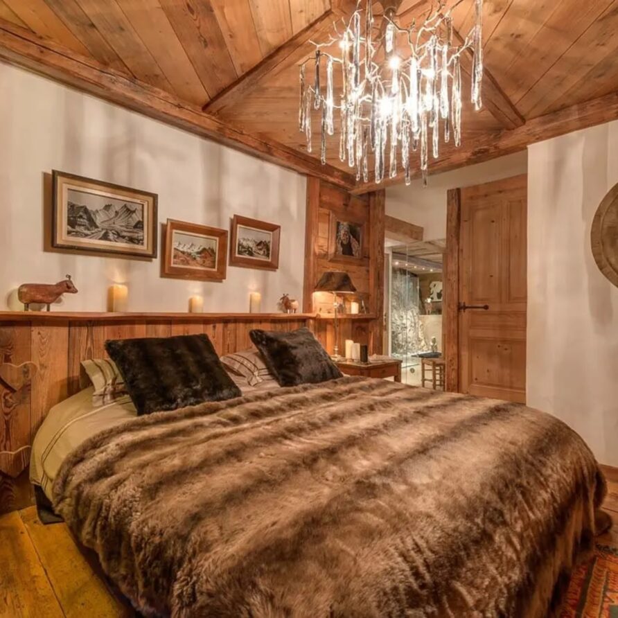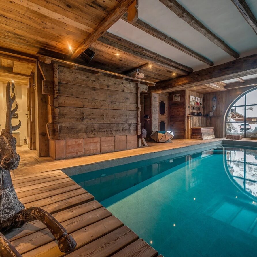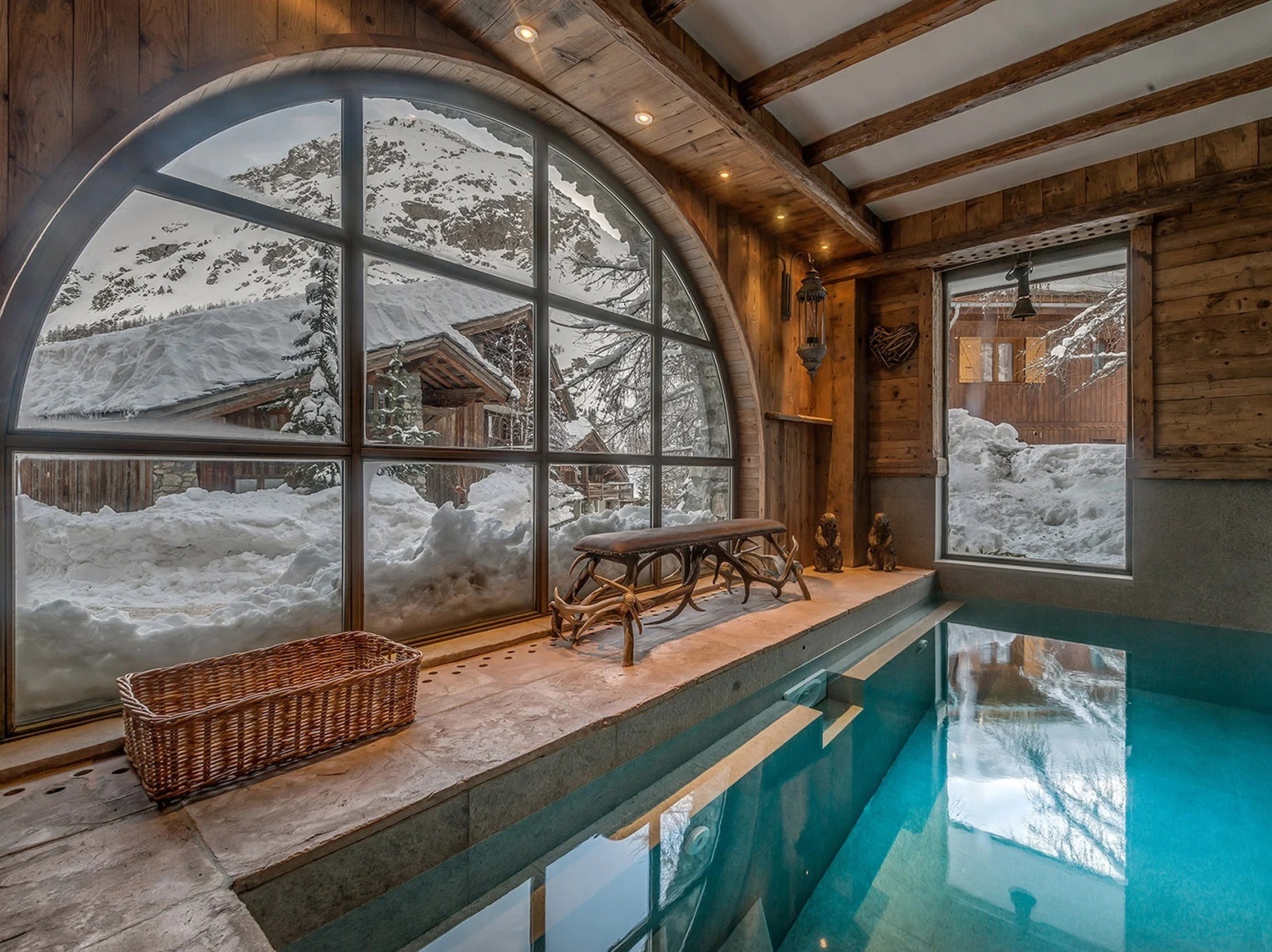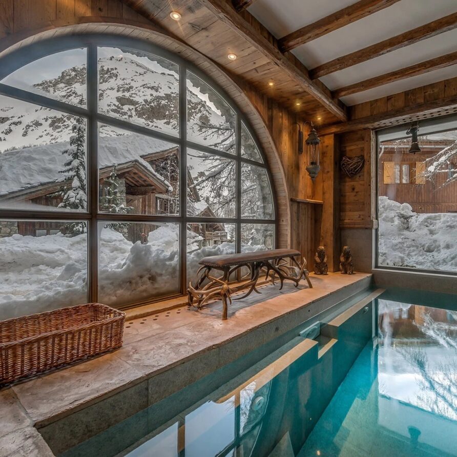 As you approach the chalet, its sheer scale is breathtaking and you find yourself in awe of its grandeur, illuminated by dazzling chandeliers hung from the eaves. The heated steps lead to the intricately carved door frame and the swimming pool can be seen through the panoramic window.