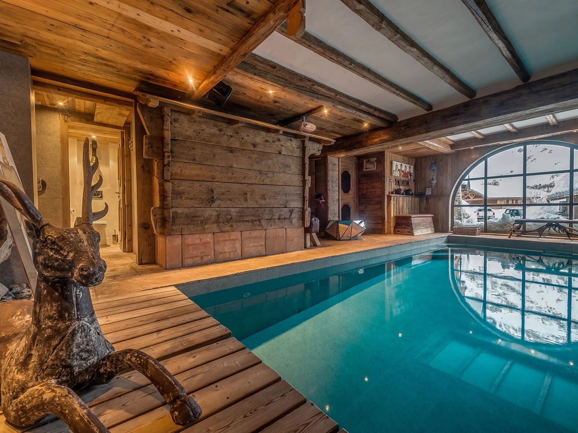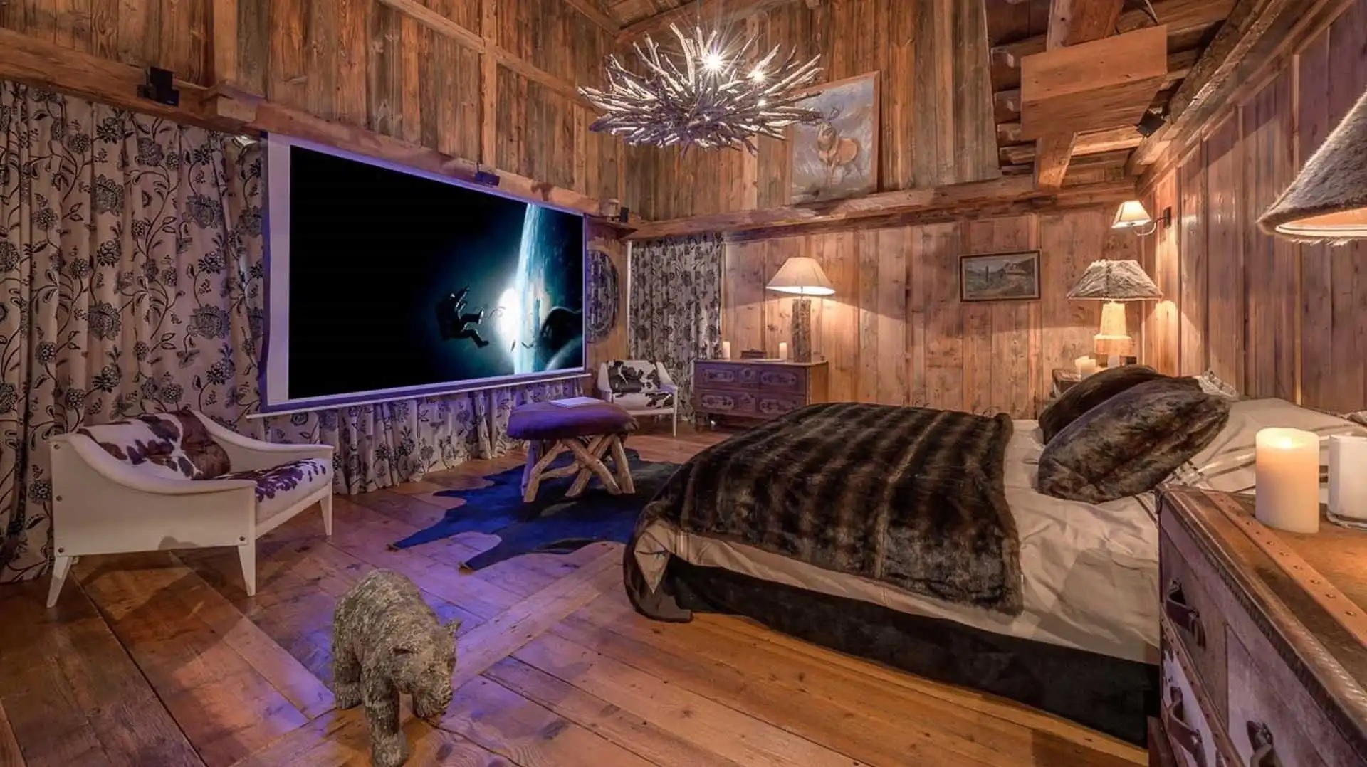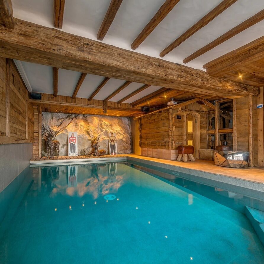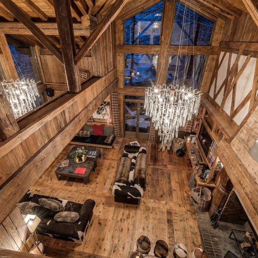 As you approach the chalet, its sheer scale is breathtaking and you find yourself in awe of its grandeur, illuminated by dazzling chandeliers hung from the eaves. The heated steps lead to the intricately carved door frame and the swimming pool can be seen through the panoramic window.