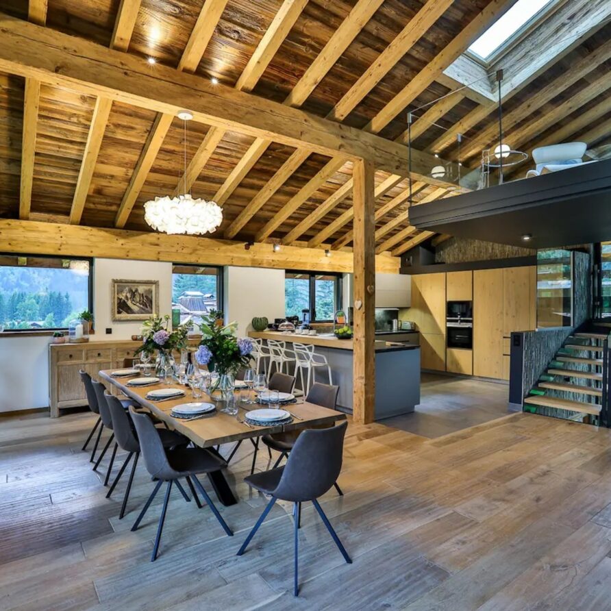 Upon entering the chalet, you will be welcomed in a bright and spacious open-plan living area, where floor to ceiling windows flood the space with natural light. Here, wooden beam ceiling recall the classic chalet structure and is elegantly blended with a contemporary finish and modern furnishings. A comfortable L-shaped sofa and a fireplace creates the ideal place where to come back to at the end of a busy day.