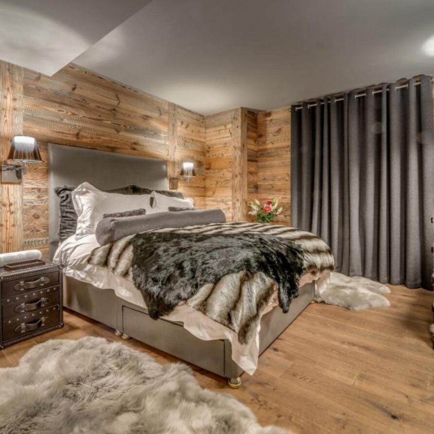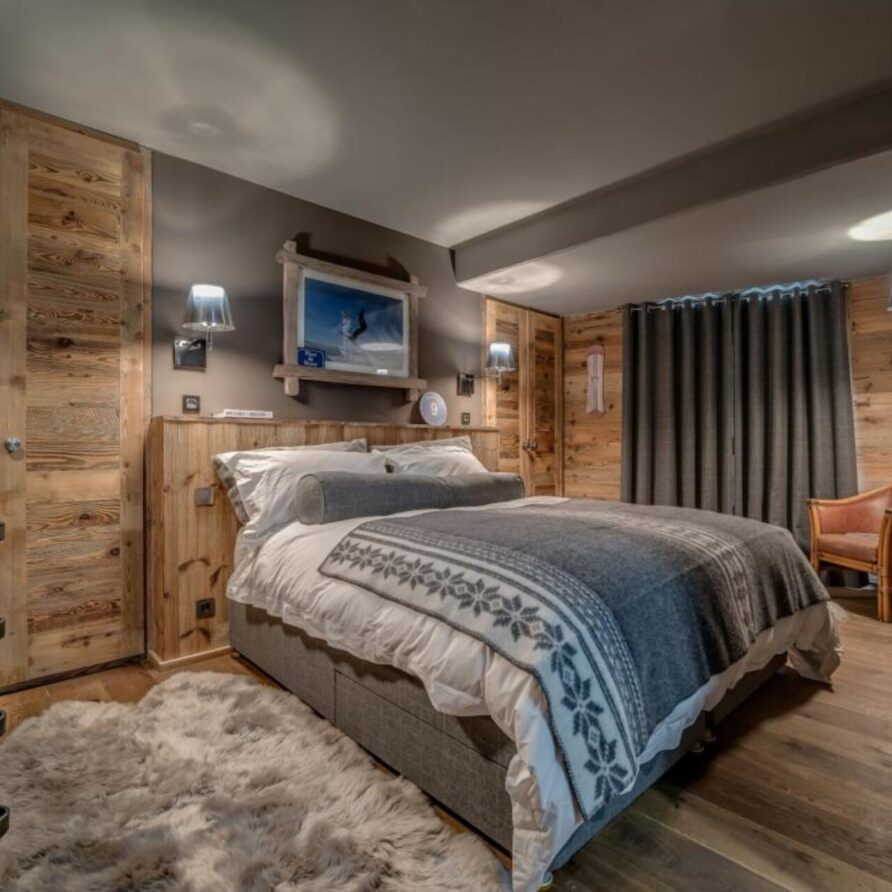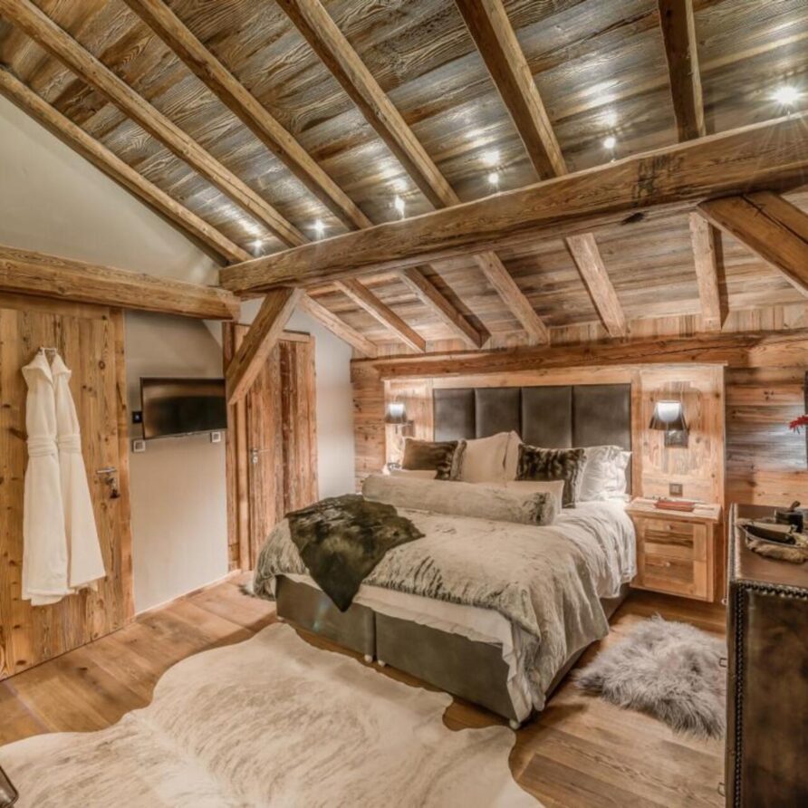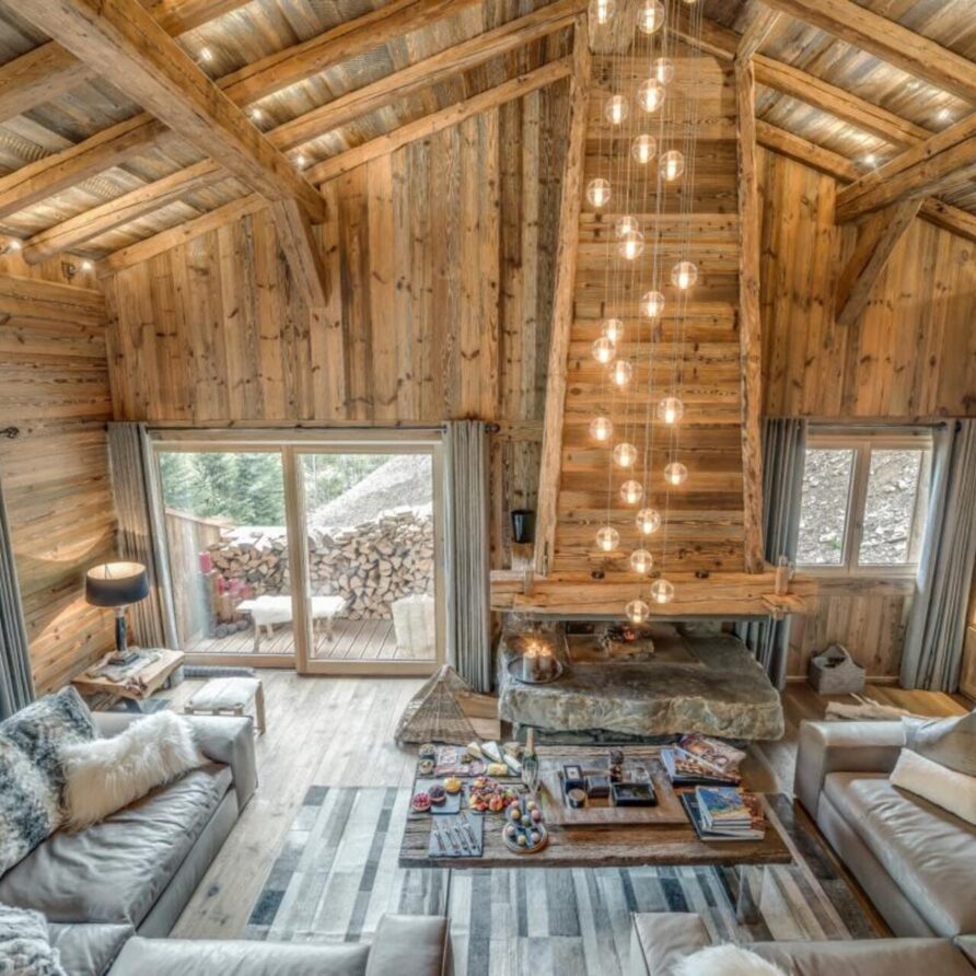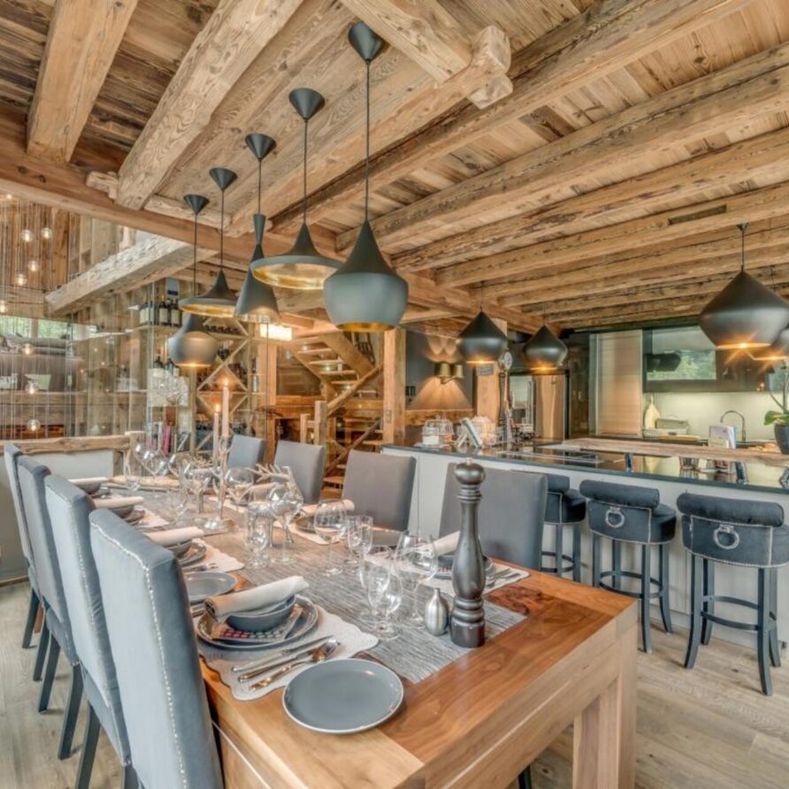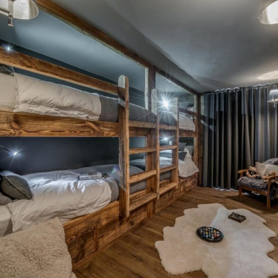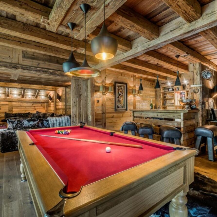 The chalet has several separate living areas; a large bright living area with open fireplace located on the top floor of the chalet. There is a fabulous cinema room located next to a stocked bar with pool table which can be either open or closed off and hidden, which will keep both adults and children happy. The open plan kitchen and dining area looks out over the expansive terrace and affords beautiful views of the mountains.