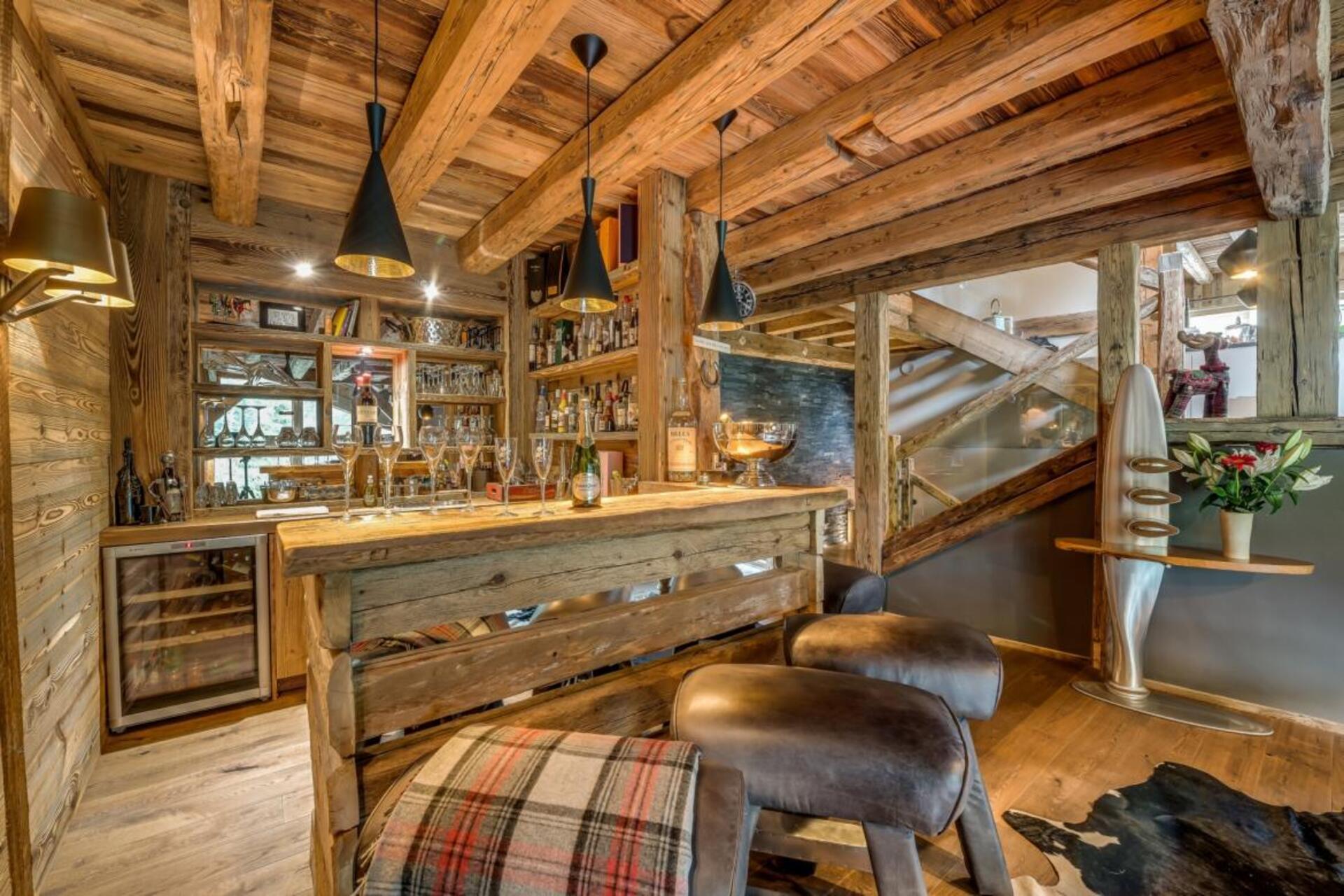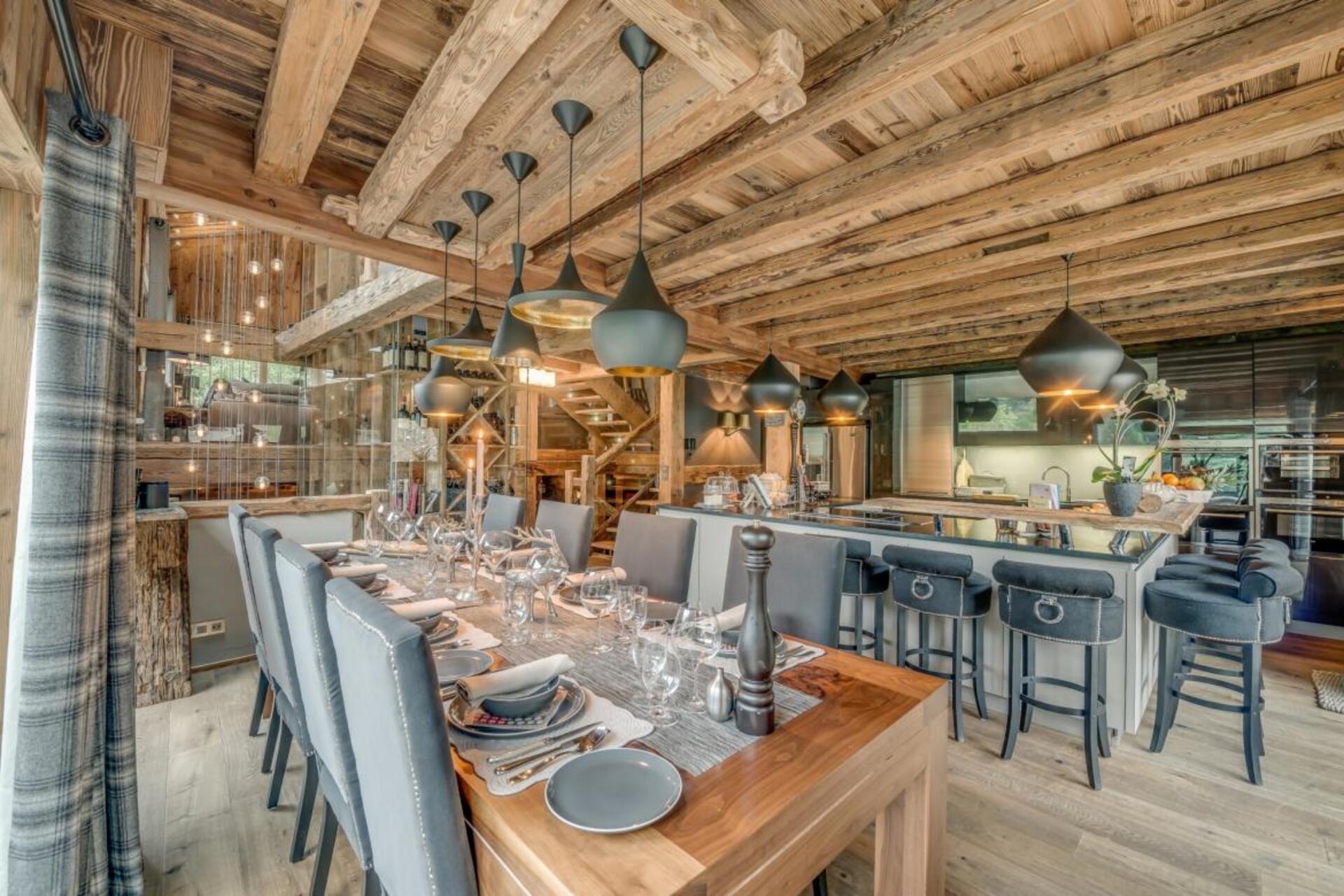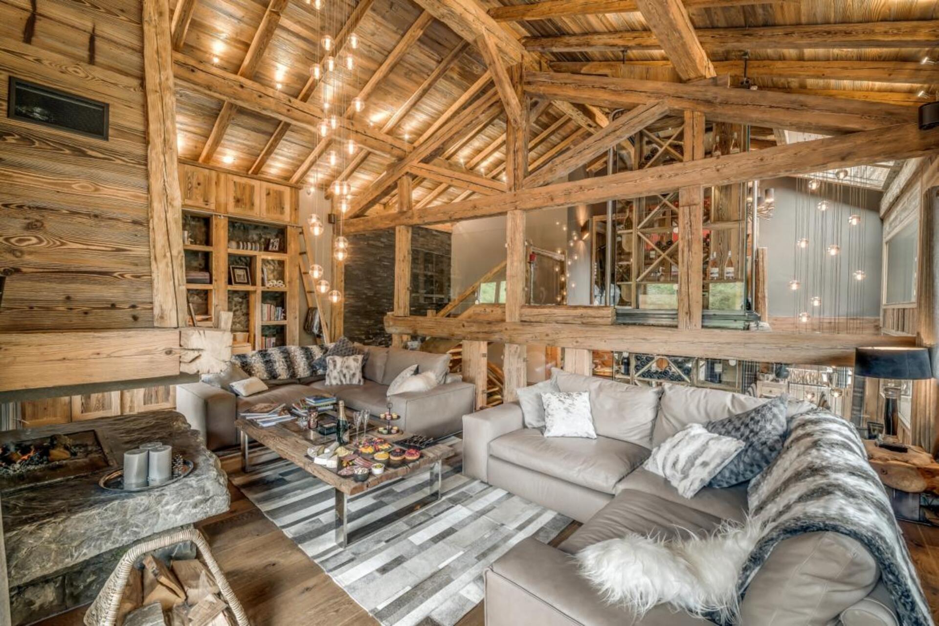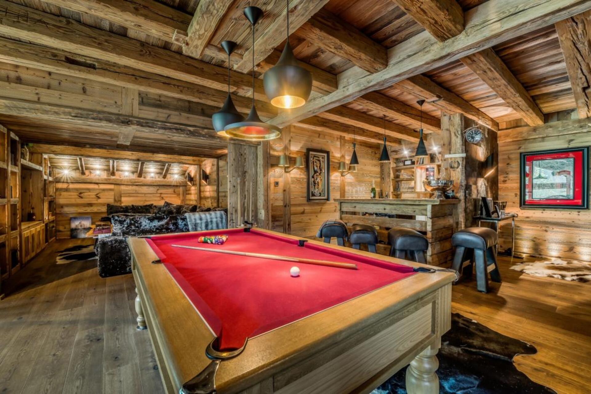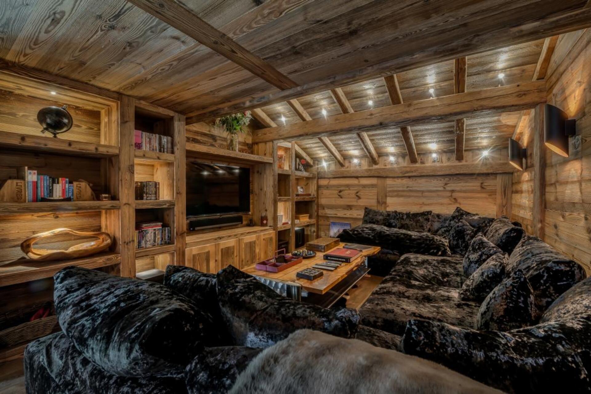 The chalet has several separate living areas; a large bright living area with open fireplace located on the top floor of the chalet. There is a fabulous cinema room located next to a stocked bar with pool table which can be either open or closed off and hidden, which will keep both adults and children happy. The open plan kitchen and dining area looks out over the expansive terrace and affords beautiful views of the mountains.