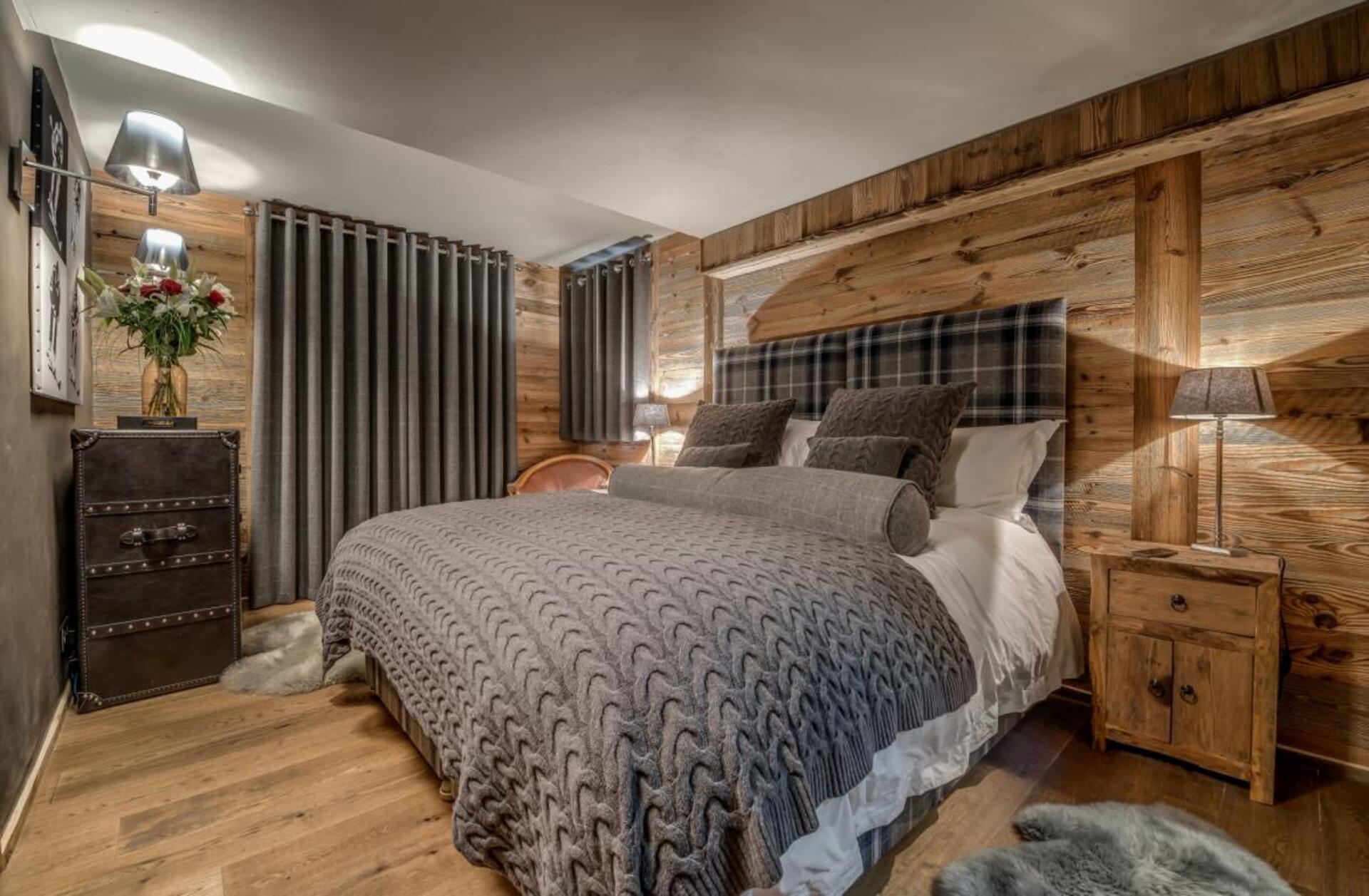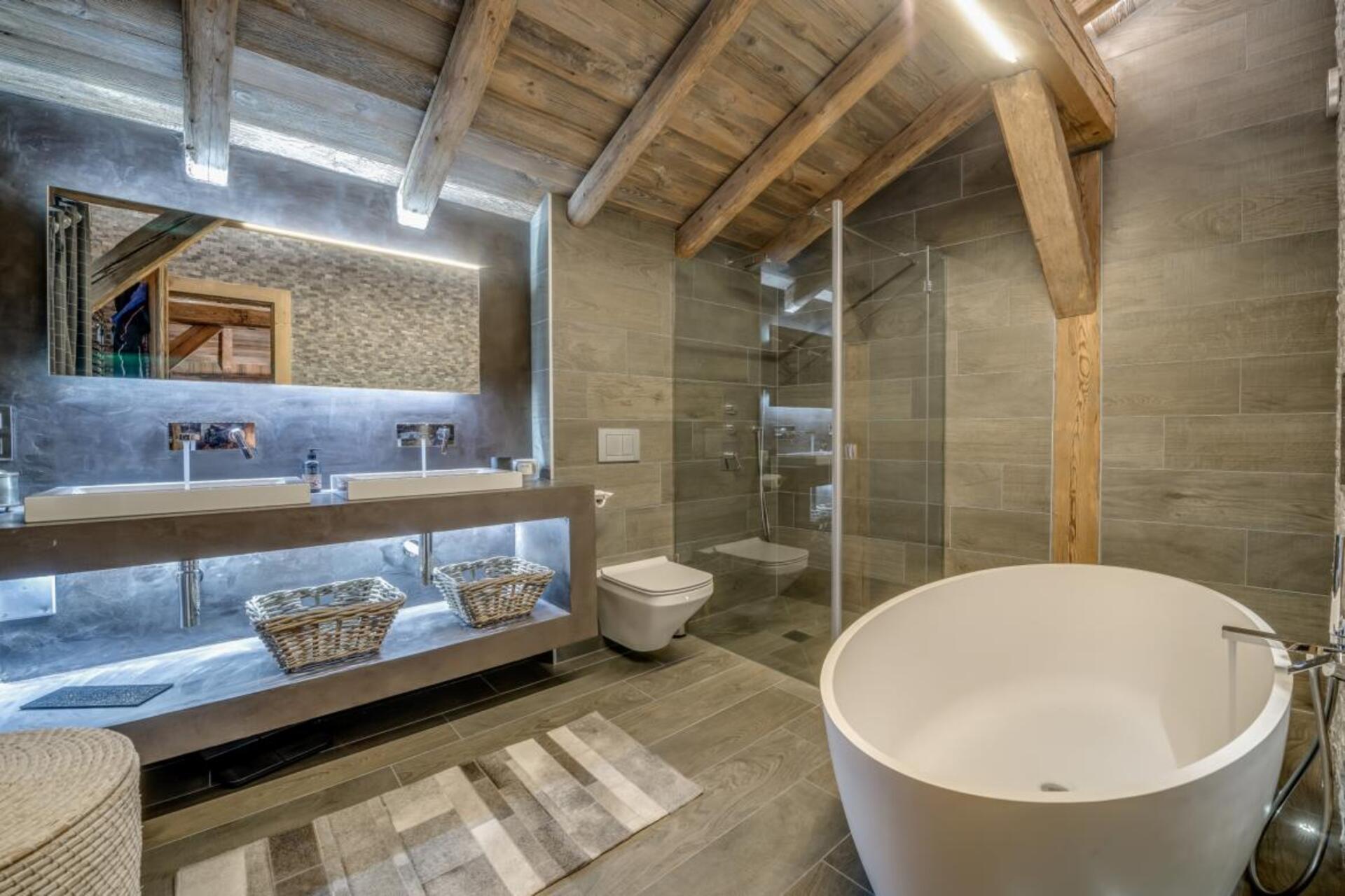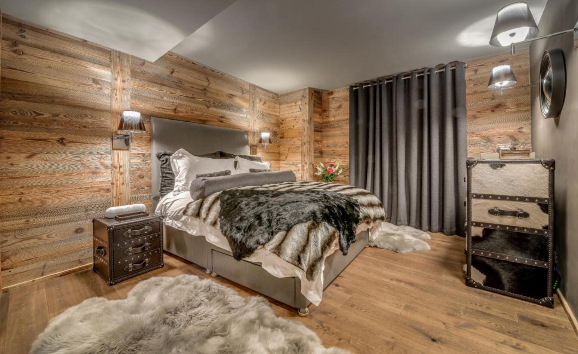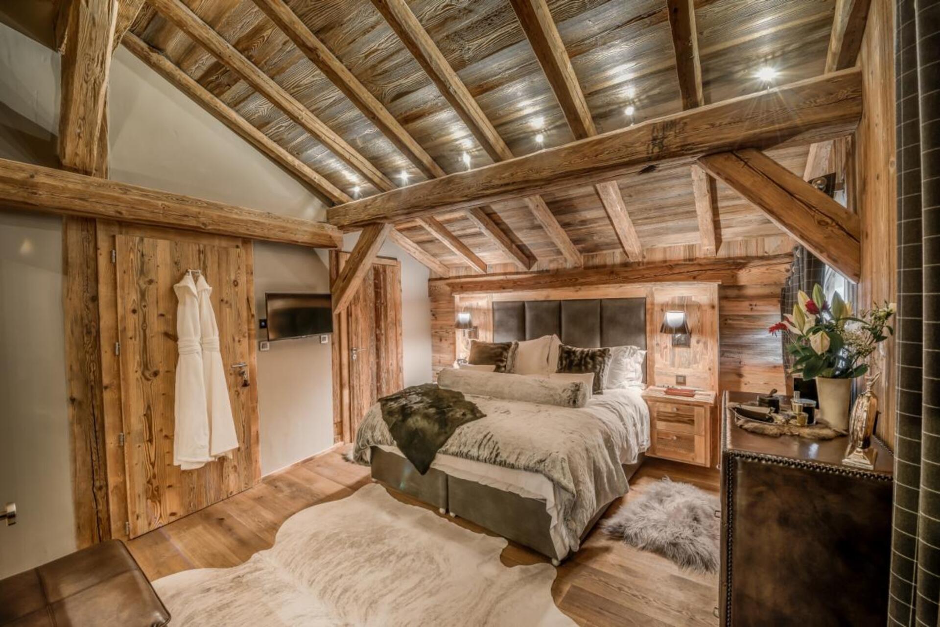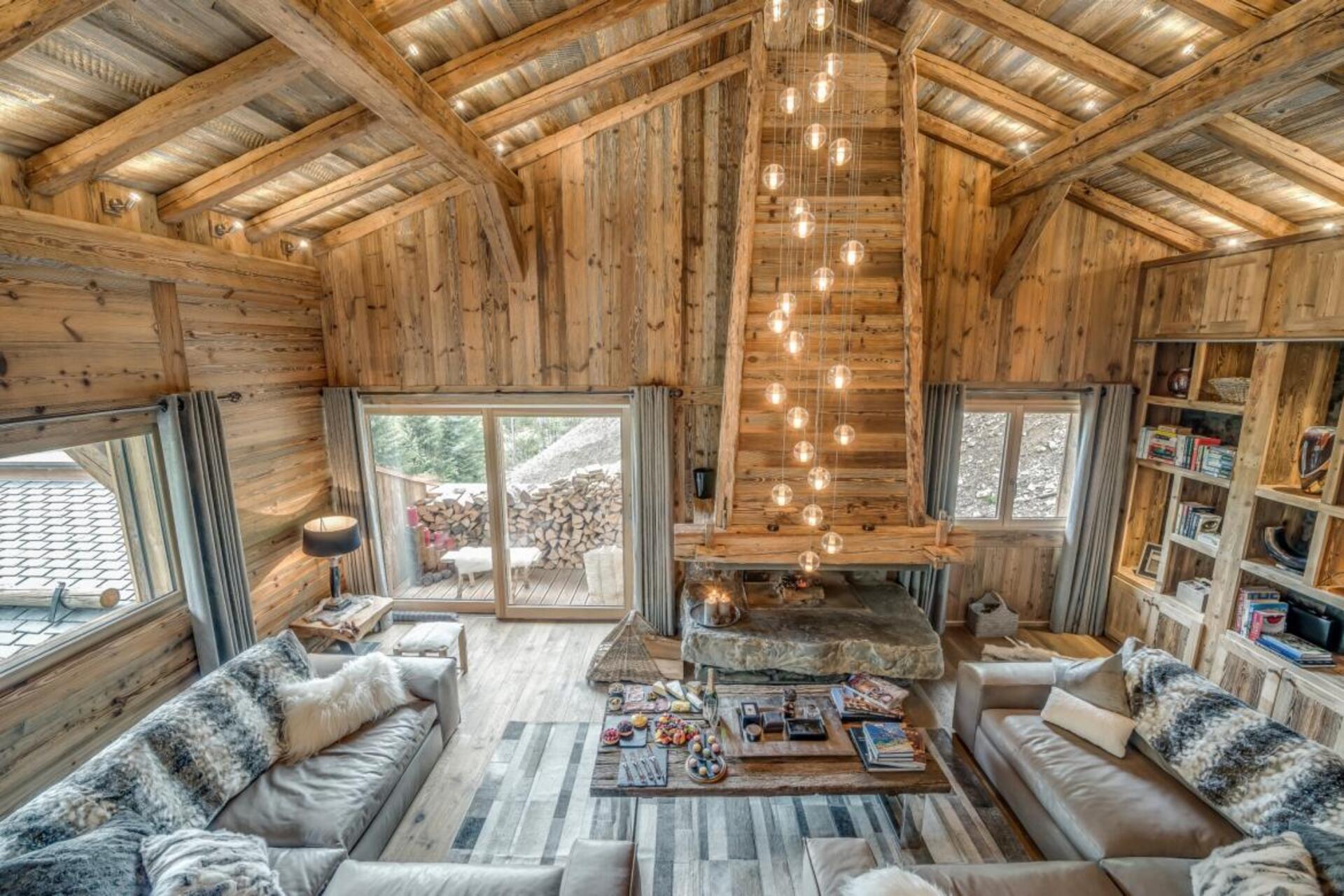 The chalet has several separate living areas; a large bright living area with open fireplace located on the top floor of the chalet. There is a fabulous cinema room located next to a stocked bar with pool table which can be either open or closed off and hidden, which will keep both adults and children happy. The open plan kitchen and dining area looks out over the expansive terrace and affords beautiful views of the mountains.