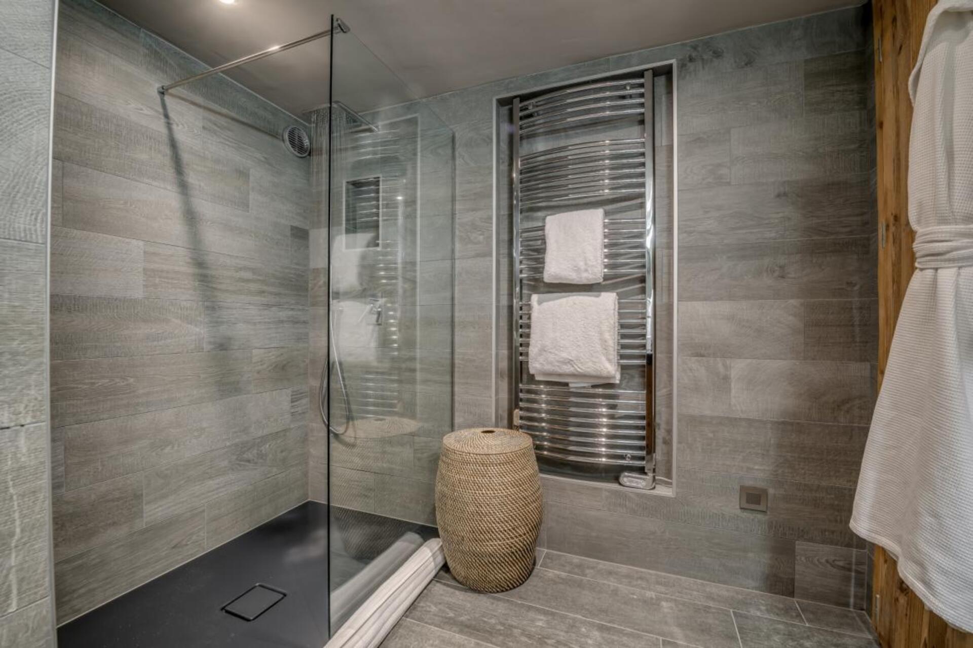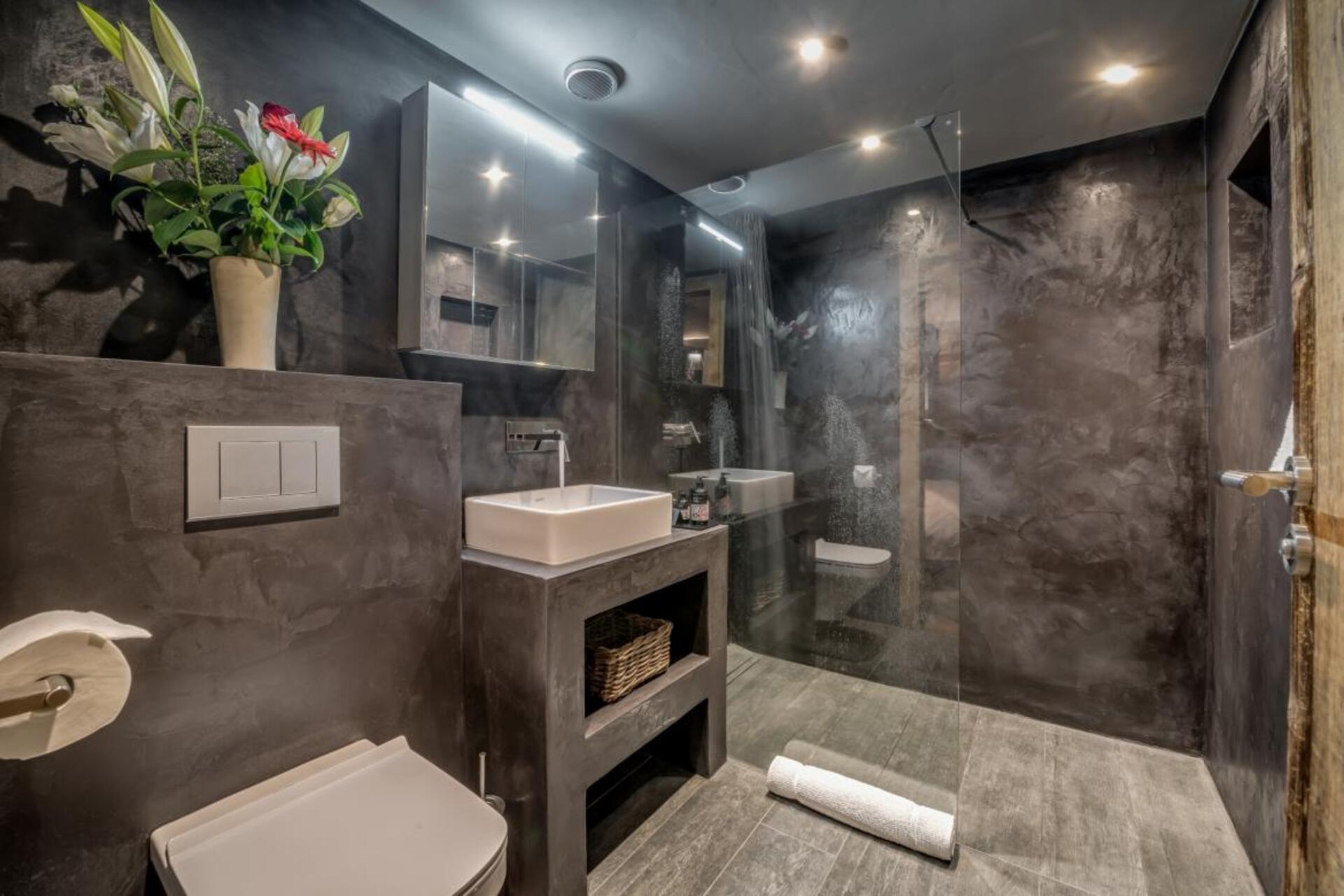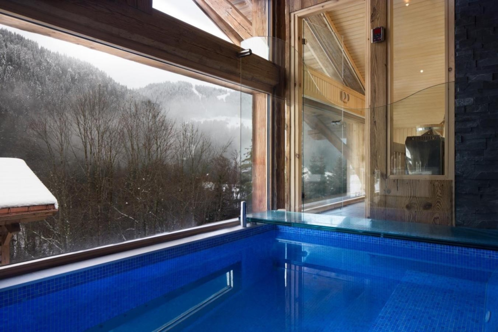 The spa area is located on the middle floor of the chalet with floor to ceiling glass windows; it comprises of a sunken Jacuzzi complete with stepping stones. There is a further relaxation zone to enjoy the sweeping valley views.