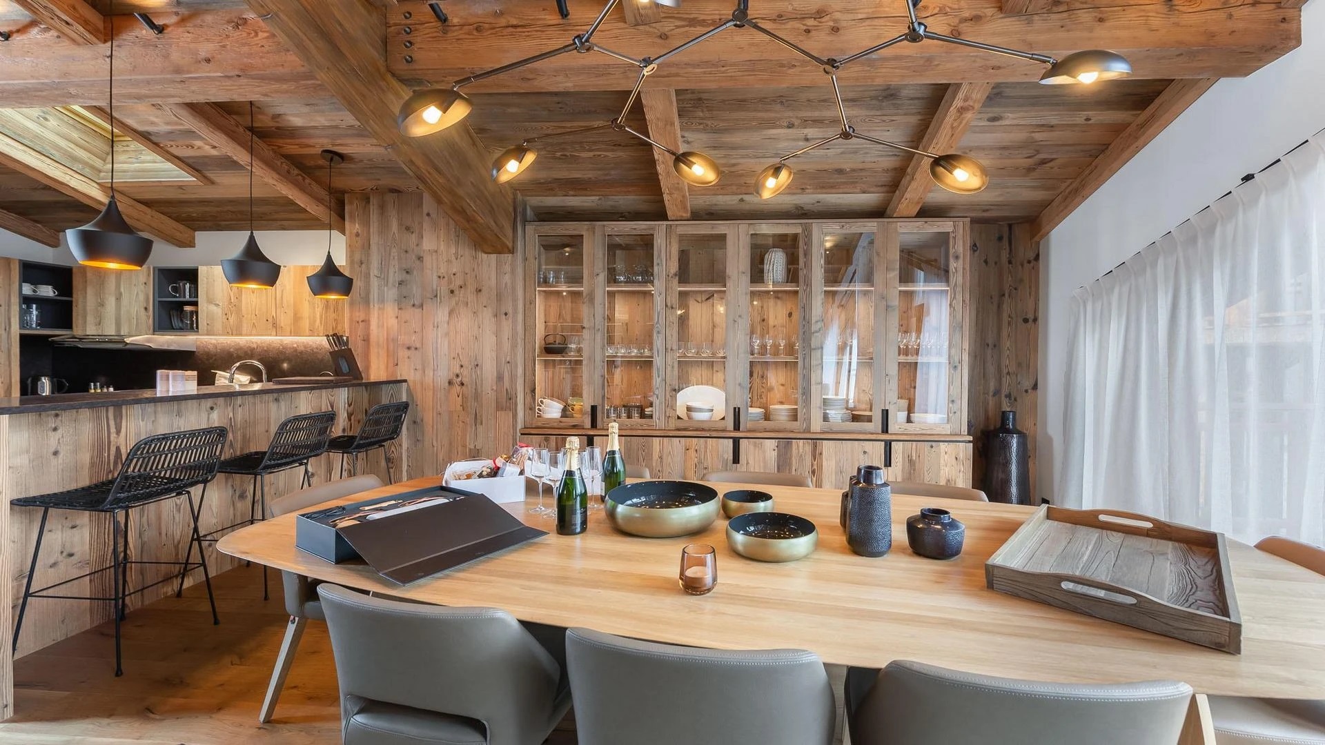 The chalet presents itself as an elegant five-bedroom accommodation with a maximum capacity of 10 guests and top-notch amenities. At the holiday chalet’s peak, the spacious open-plan living area shows off stunning modern design mixing natural stone and wood to create a classy yet welcoming feel. A comfy lounge area gives plenty of room to relax, with plush furniture and an eye-catching fireplace in the middle adding warmth and appeal to the room. To find a quieter spot, a snug reading nook offers the ideal place to snuggle up with a book or the daily papers while still soaking in the lively vibe of the chalet.