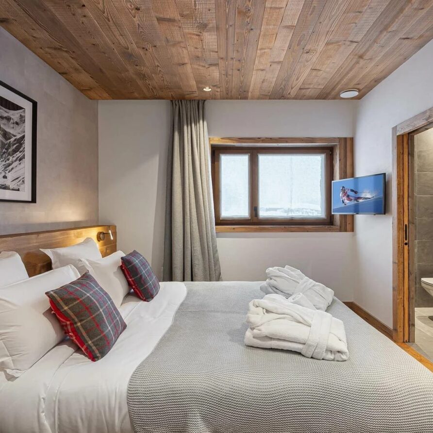The mountain chalet offers five well-designed bedrooms to ensure peaceful nights in comfort. The first floor has three stylish bedrooms each with its own bathroom featuring modern showers and access to a private balcony. The master bedroom adds an extra touch of indulgence with a deep bathtub to soothe sore muscles. One of these rooms is adapted for guests with limited mobility making sure everyone can enjoy luxury.