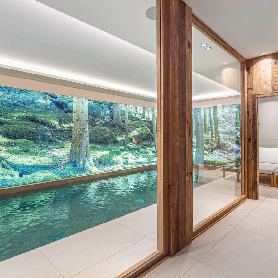 The true showstopper of the chalet sits on the lower level where you will find a private spa retreat built to help you unwind. A heated pool, sauna, and quiet rest area offer a peaceful getaway after a day on the pistes surrounding you with calm. One floor down, guests find the chalet’s movie room, a cozy space with comfortable couches and immersive surround sound perfect for watching films together.