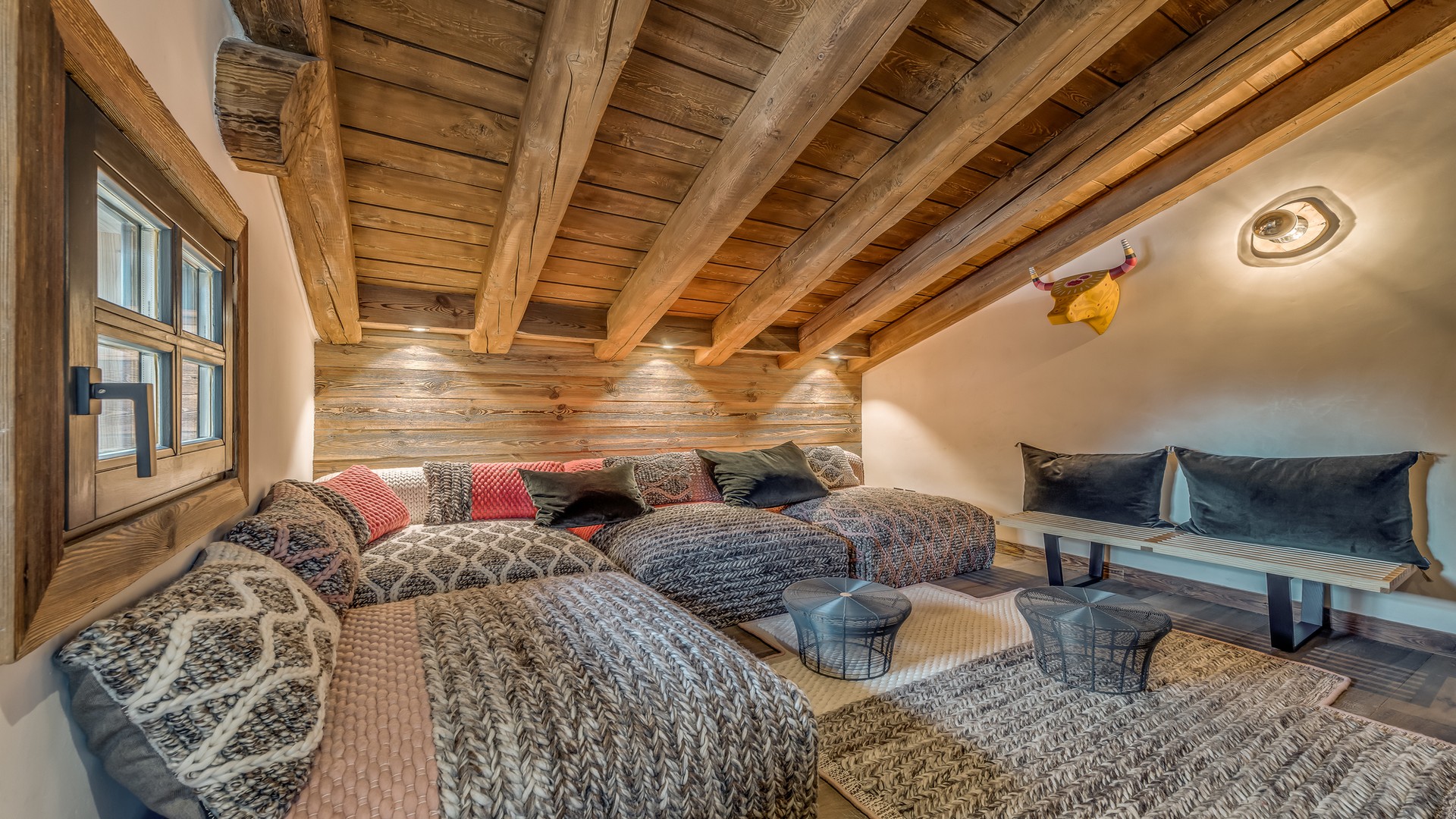 The holiday chalet is spread over four levels and an expansive 350sqm. The interiors are harmonious and modern and the four en-suite bedrooms are complemented by a sauna, a massage room and a beautiful indoor pool. If you are looking for contemporary living space that is beautifully finished this chalet would be an ideal choice.