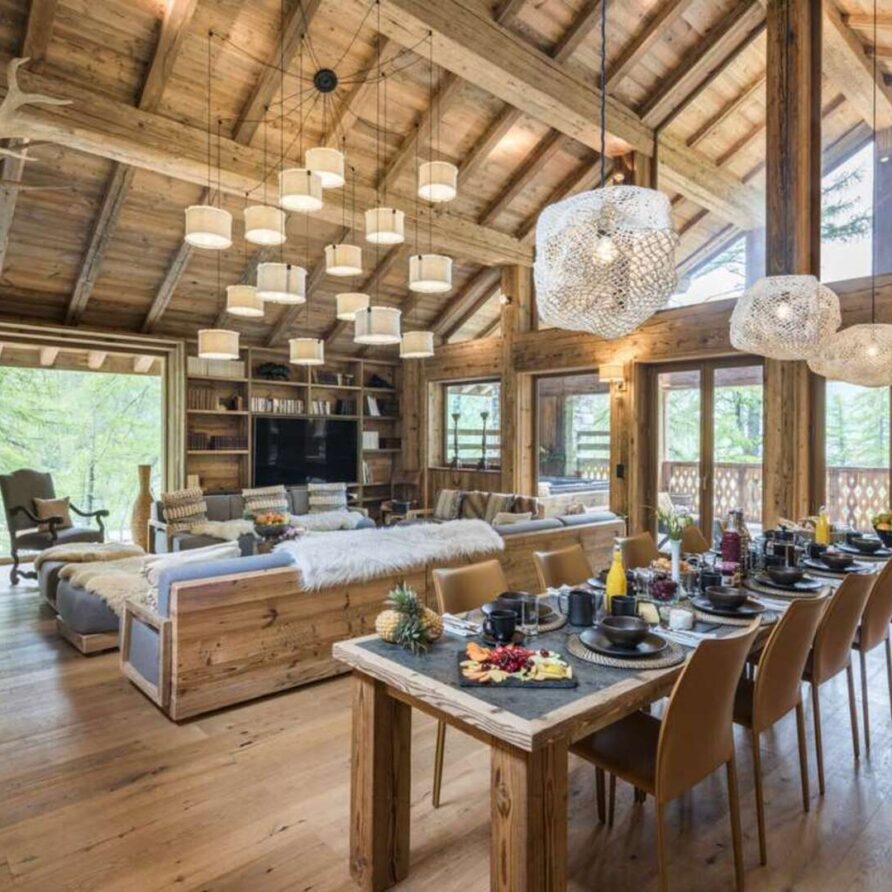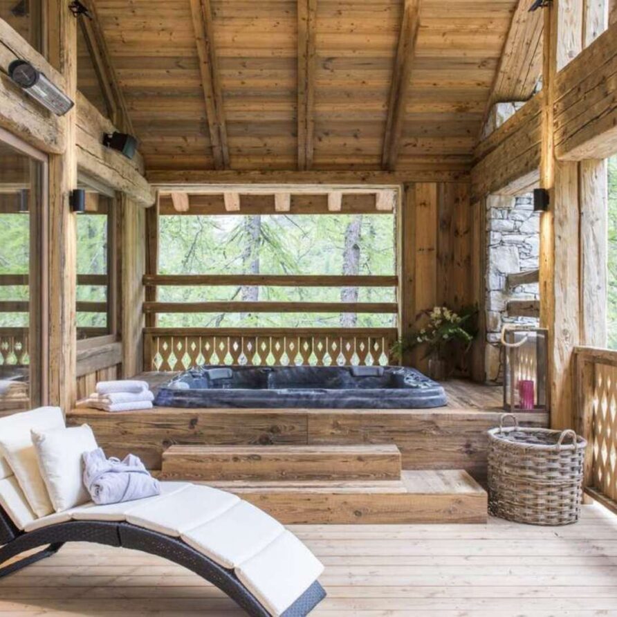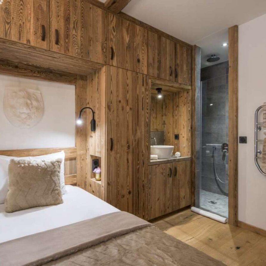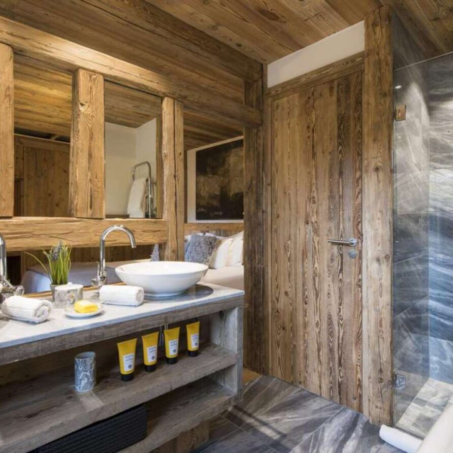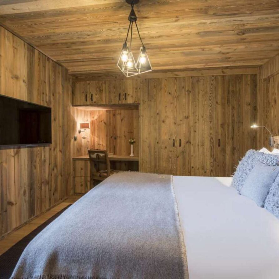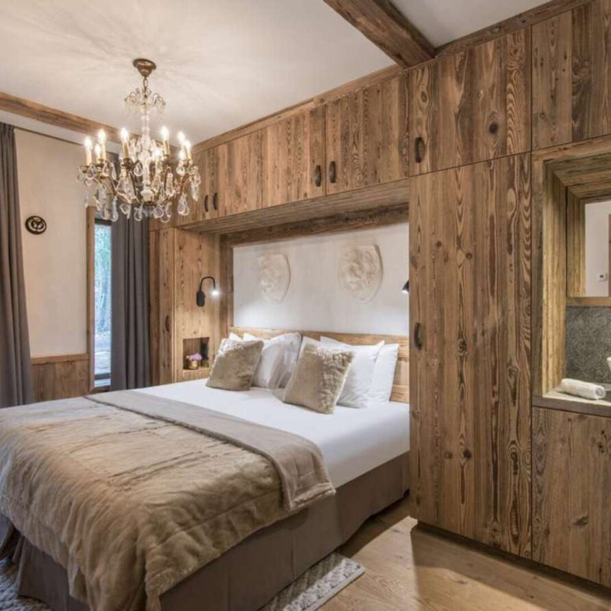 This outstanding large-group luxury chalet with spa is the perfect mix of opulence, elegance, tradition, tech and cutting-edge design. This six-bedroom property can accommodate 12 guests, two youngsters in a dedicated children’s room. The setting is superb: a short drive to the facilities of the village but very private with a woodland setting and fantastic views.