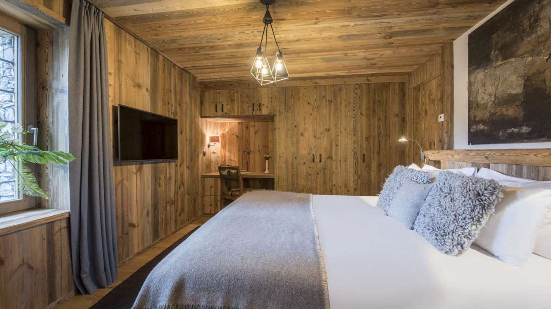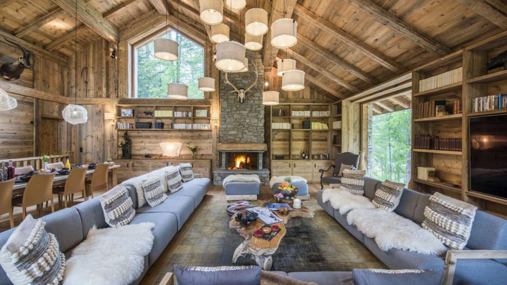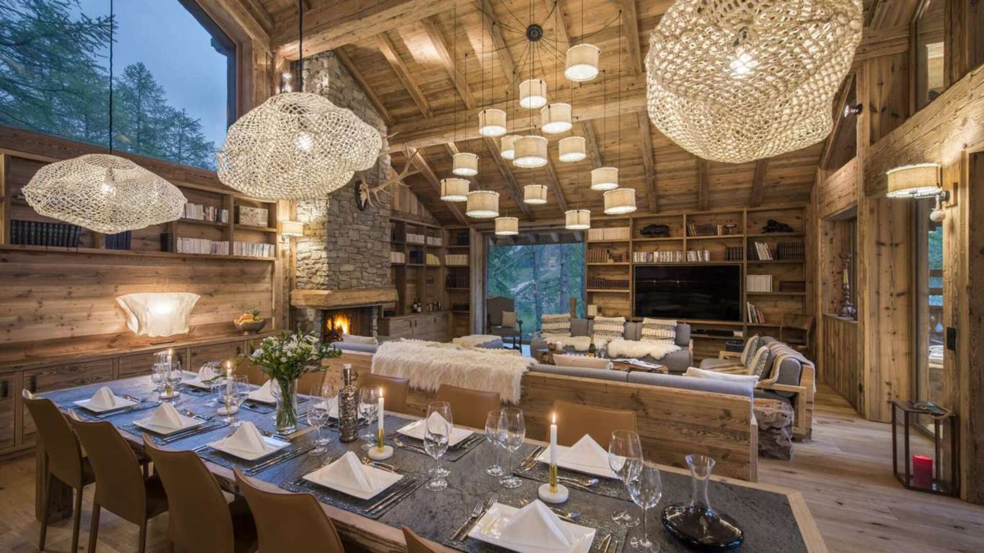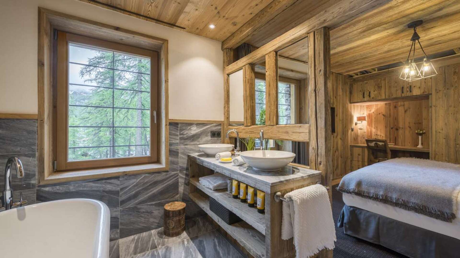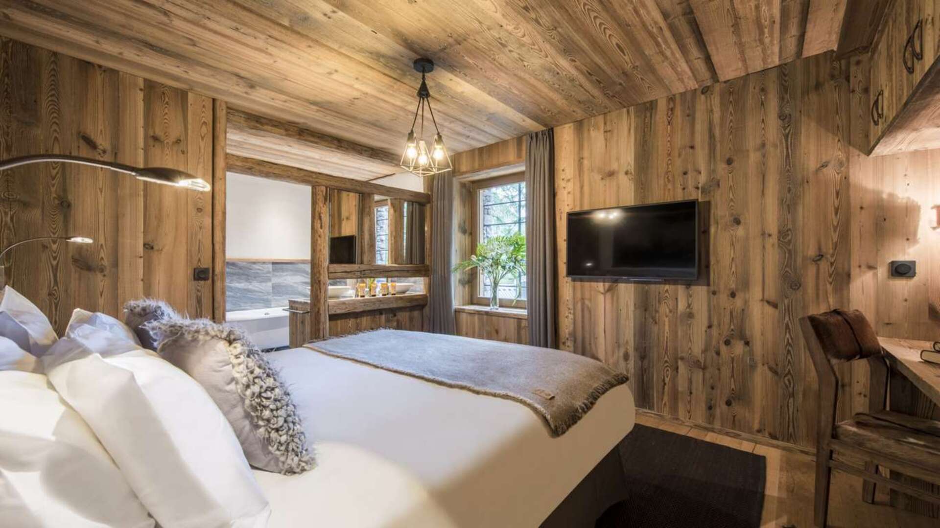 This outstanding large-group luxury chalet with spa is the perfect mix of opulence, elegance, tradition, tech and cutting-edge design. This six-bedroom property can accommodate 12 guests, two youngsters in a dedicated children’s room. The setting is superb: a short drive to the facilities of the village but very private with a woodland setting and fantastic views.