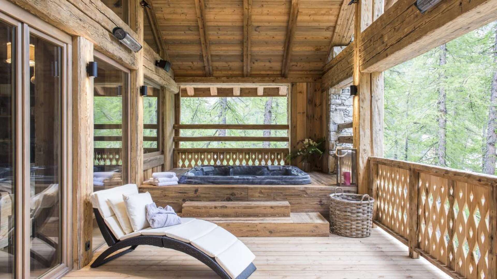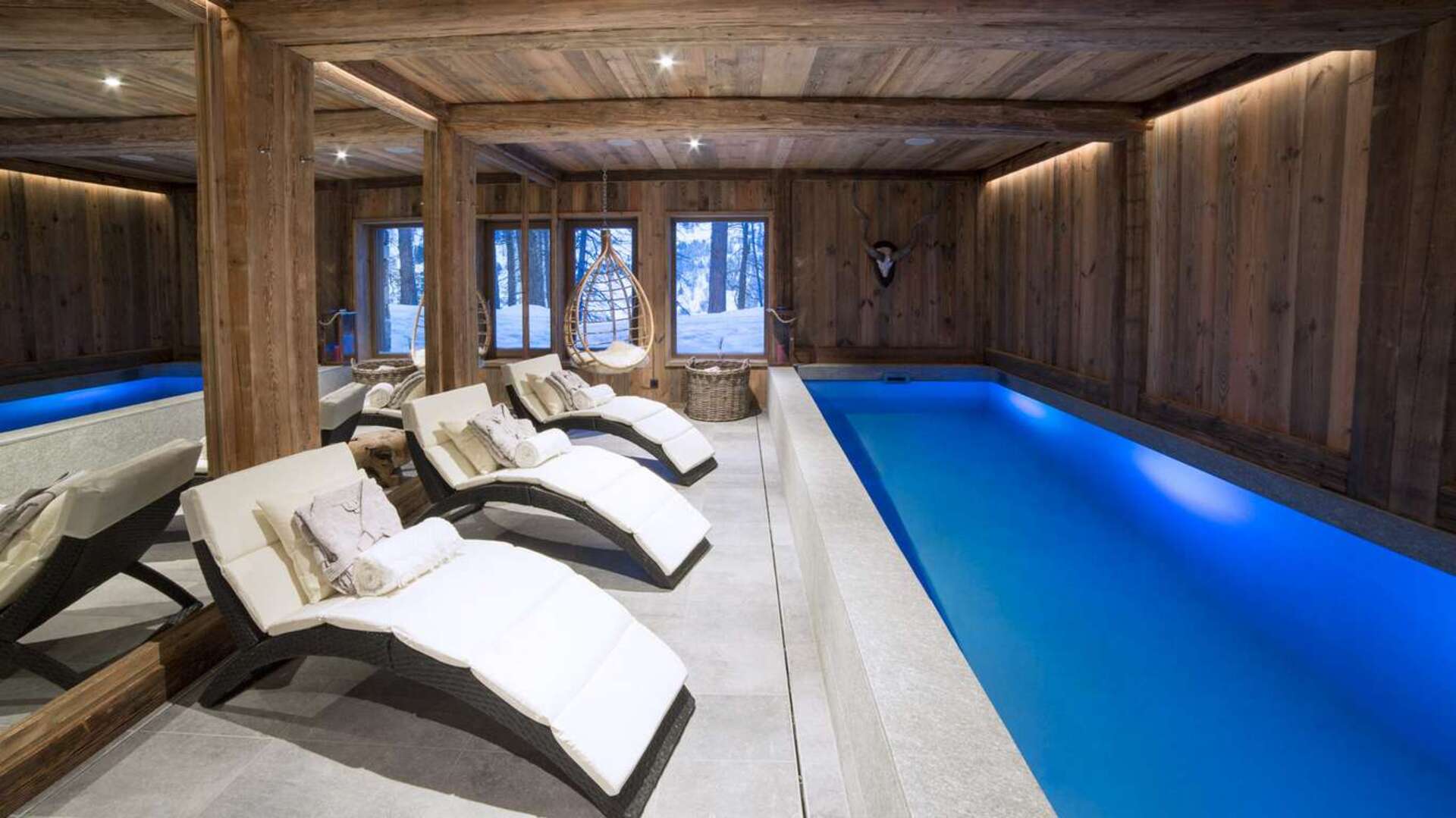 All have en-suite bathrooms and one of the twin/doubles has a private terrace. The rest of the bedrooms are on the ground floor, with a family suite of two twin/double rooms with en-suite shower rooms, and the children’s bunk room for two. The treatment and wellness area is also on this floor. A high-quality spa facility is a must have for many luxury chalet guests today. Your rest and relaxation plans can include swimming in an indoor pool, relaxing steam saunas, and working with visiting therapists in the comfortable massage room.