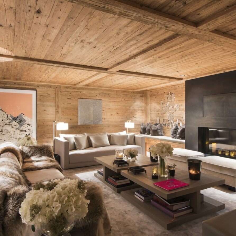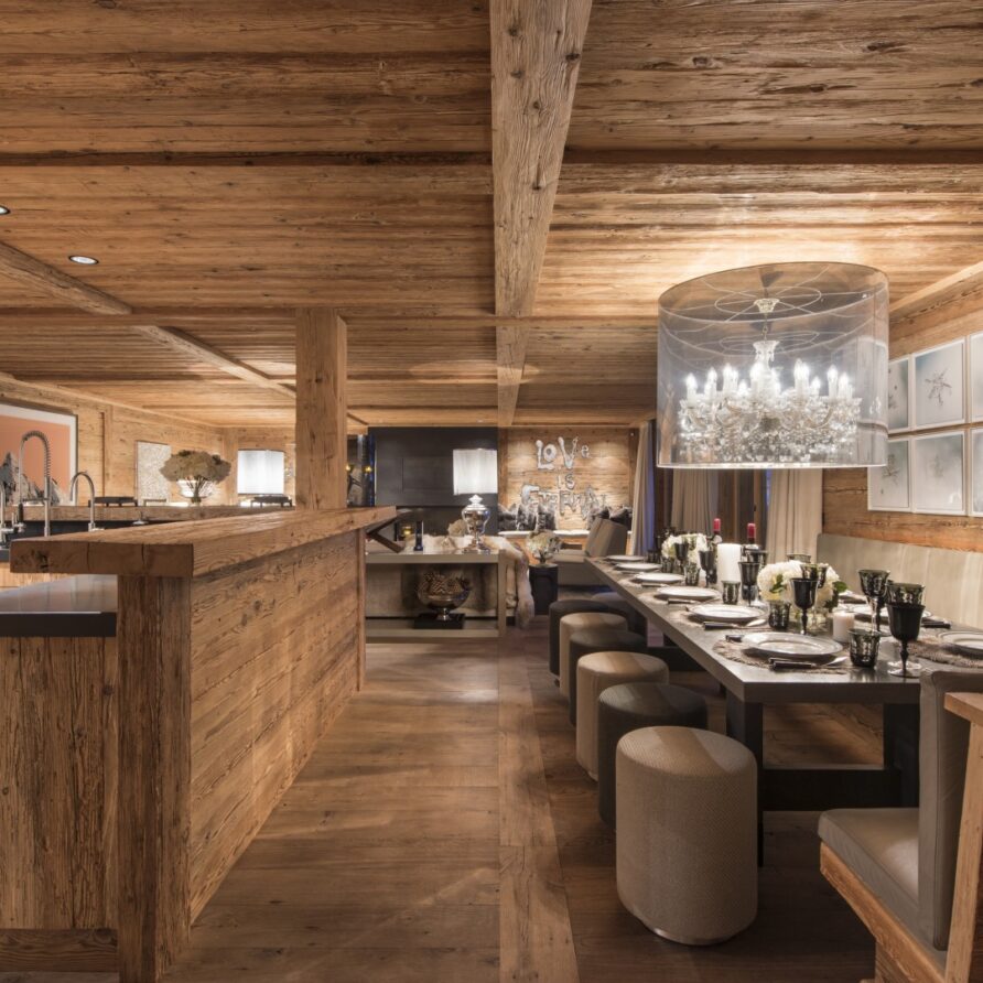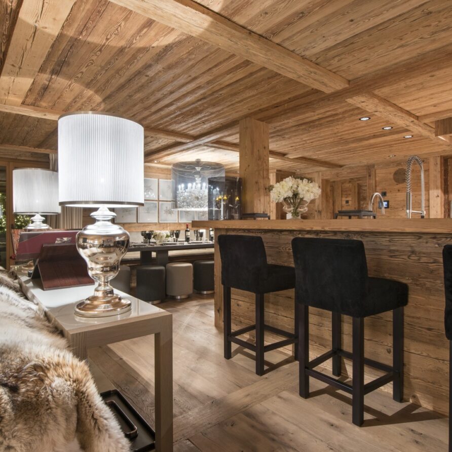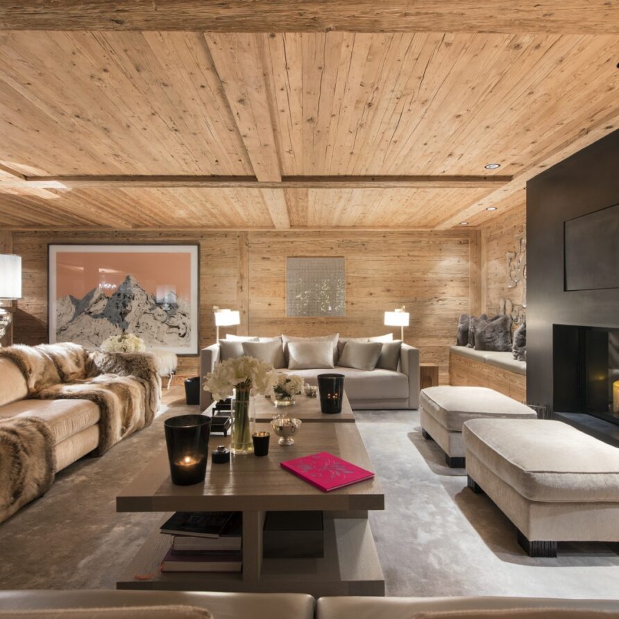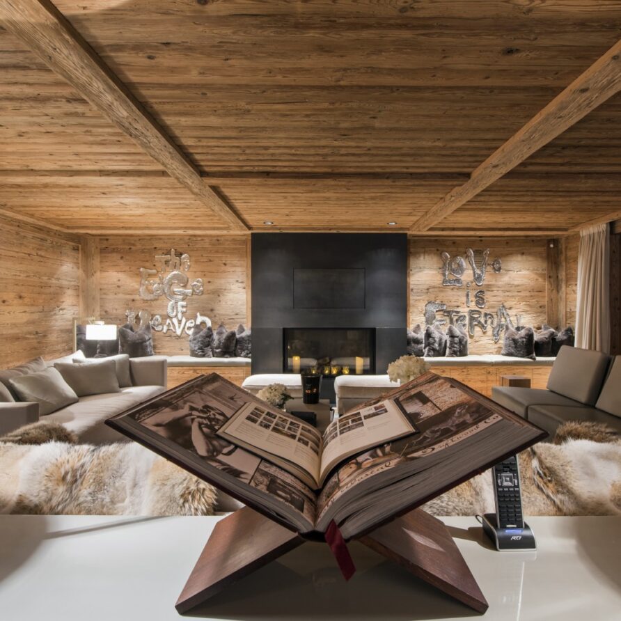 Surrounded by panoramic views of a breathtaking mountain scene, there is a large outdoor barbecue area on this level with a contemporary fireplace and comfy seating. The chalet is an impressive alpine retreat for the most discerning client.
