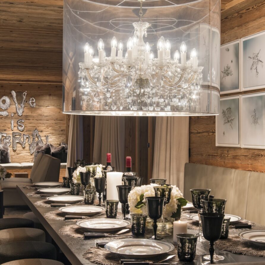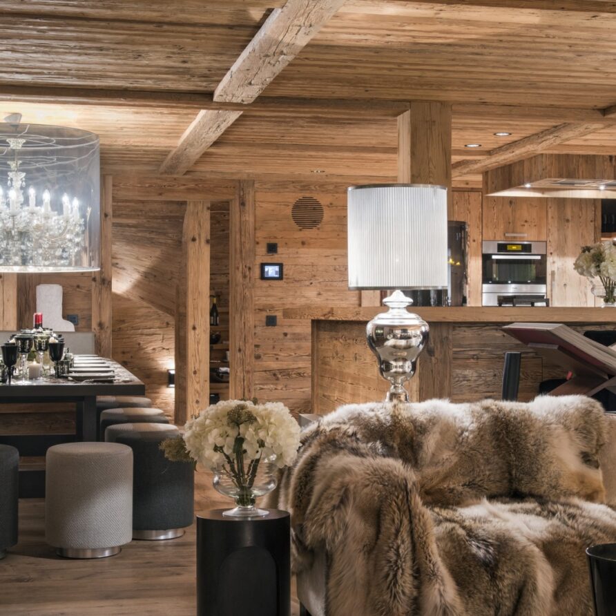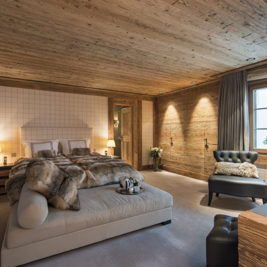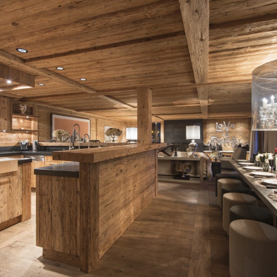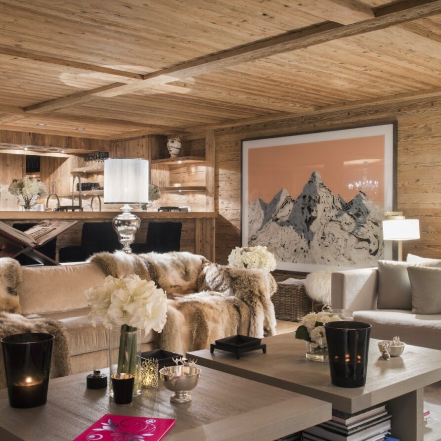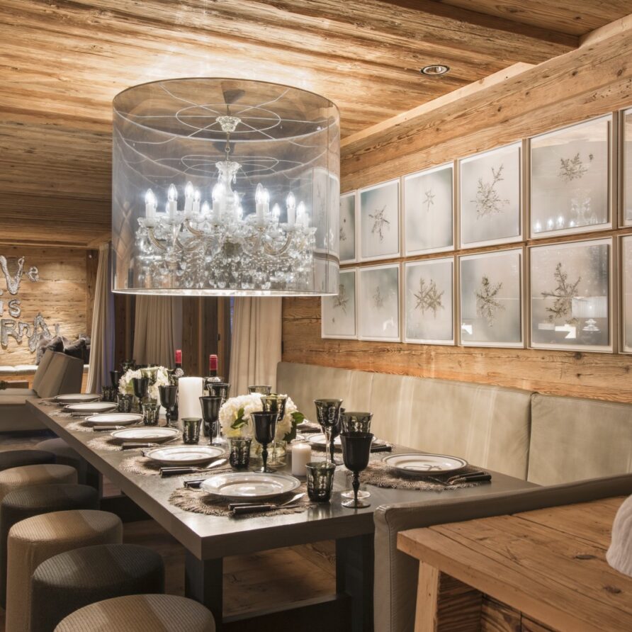 Surrounded by panoramic views of a breathtaking mountain scene, there is a large outdoor barbecue area on this level with a contemporary fireplace and comfy seating. The chalet is an impressive alpine retreat for the most discerning client.