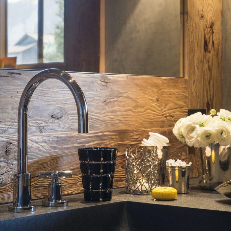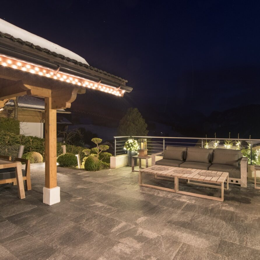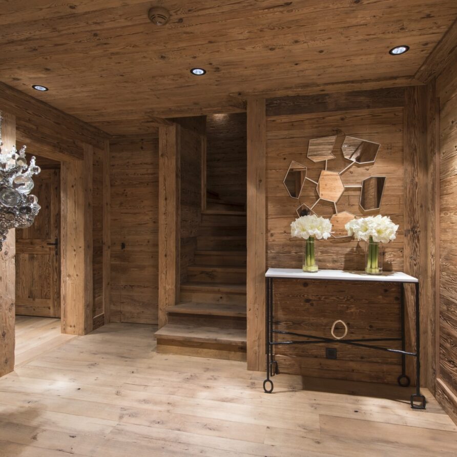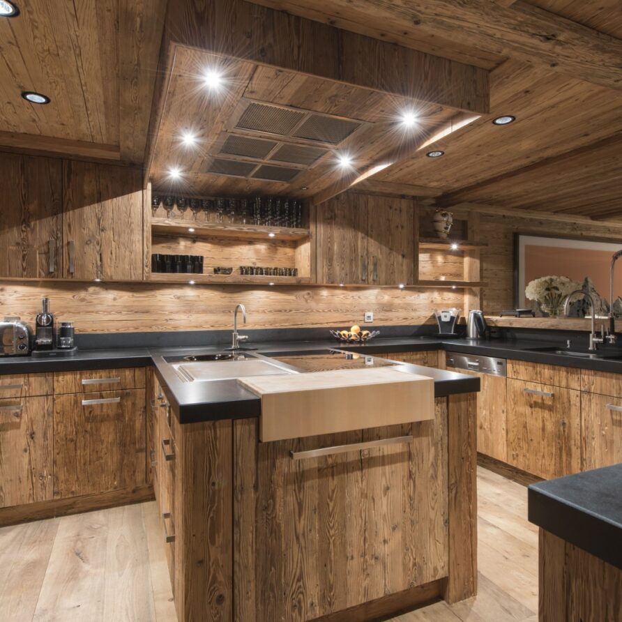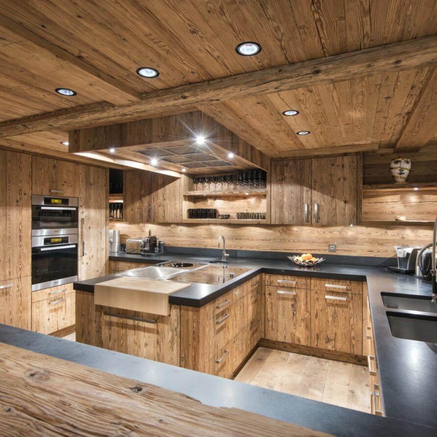 Surrounded by panoramic views of a breathtaking mountain scene, there is a large outdoor barbecue area on this level with a contemporary fireplace and comfy seating. The chalet is an impressive alpine retreat for the most discerning client.