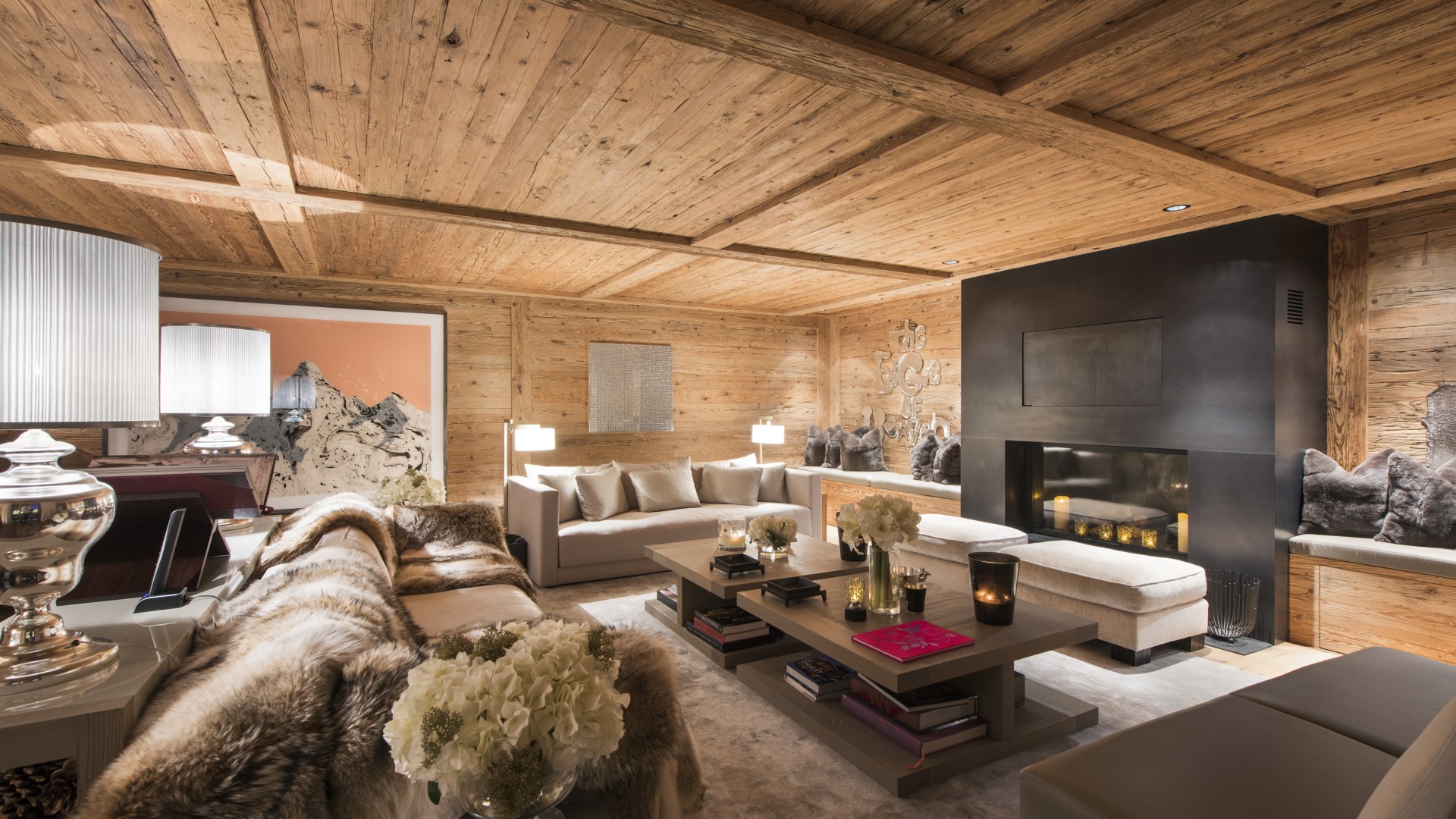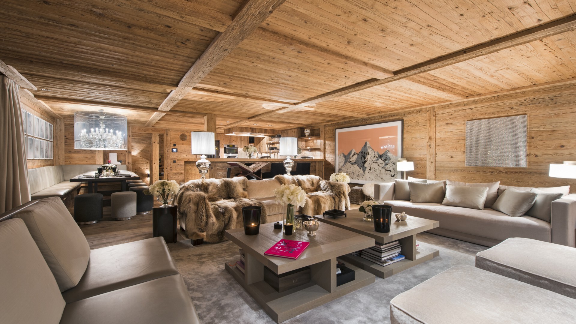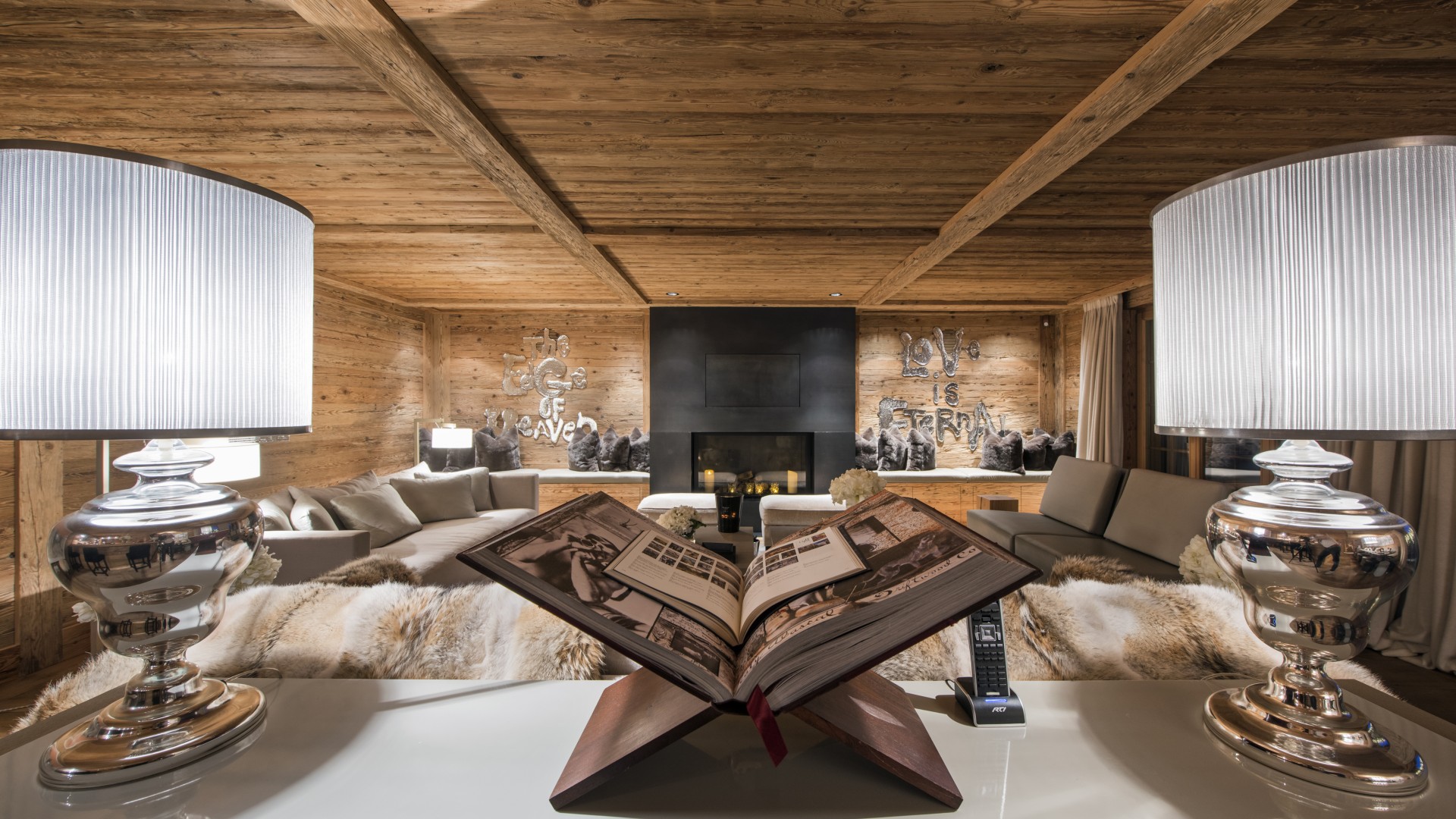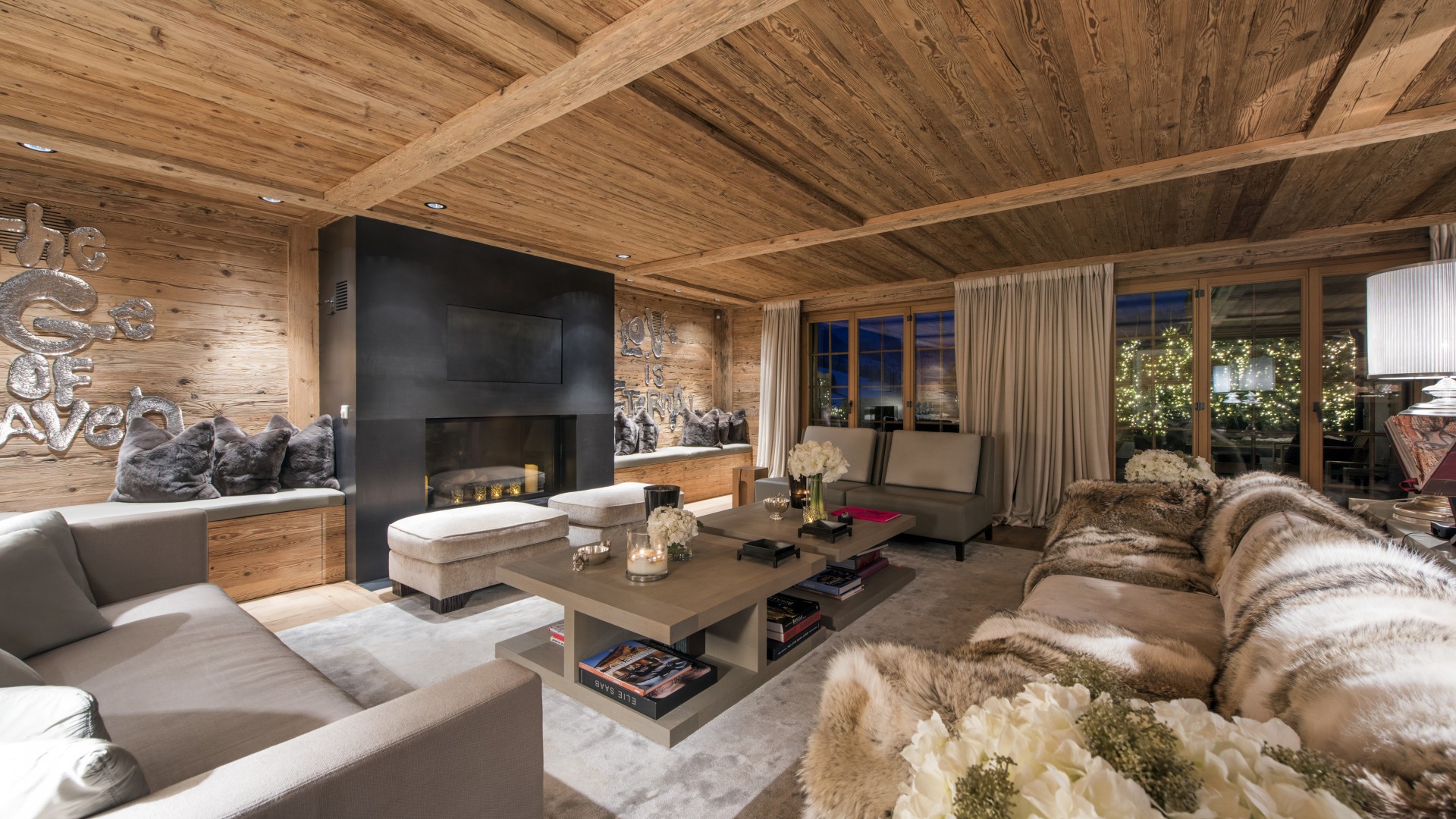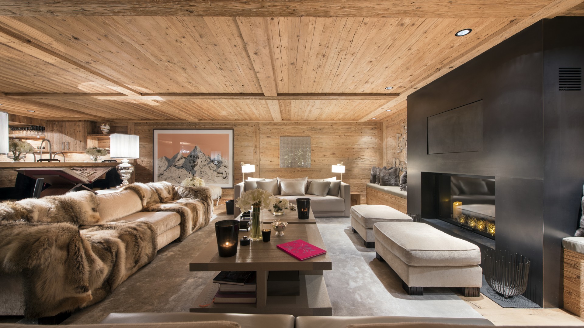 Surrounded by panoramic views of a breathtaking mountain scene, there is a large outdoor barbecue area on this level with a contemporary fireplace and comfy seating. The chalet is an impressive alpine retreat for the most discerning client.