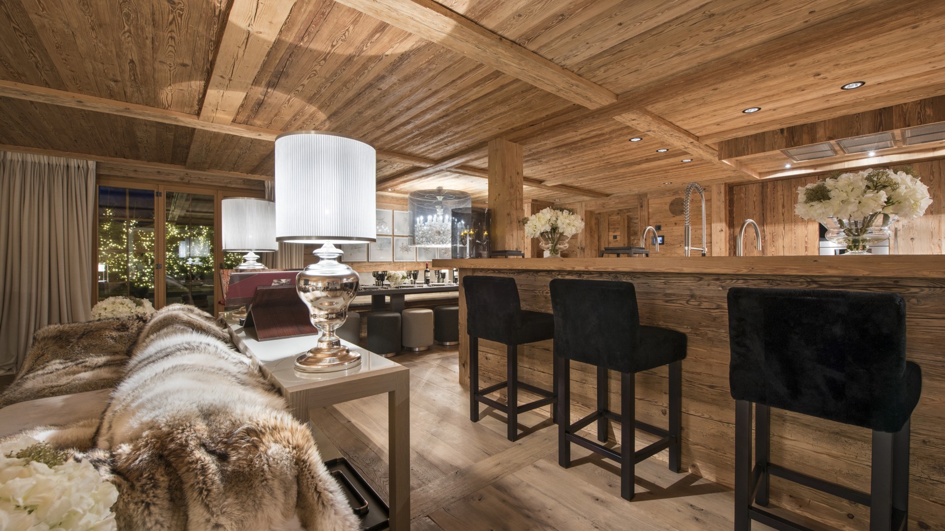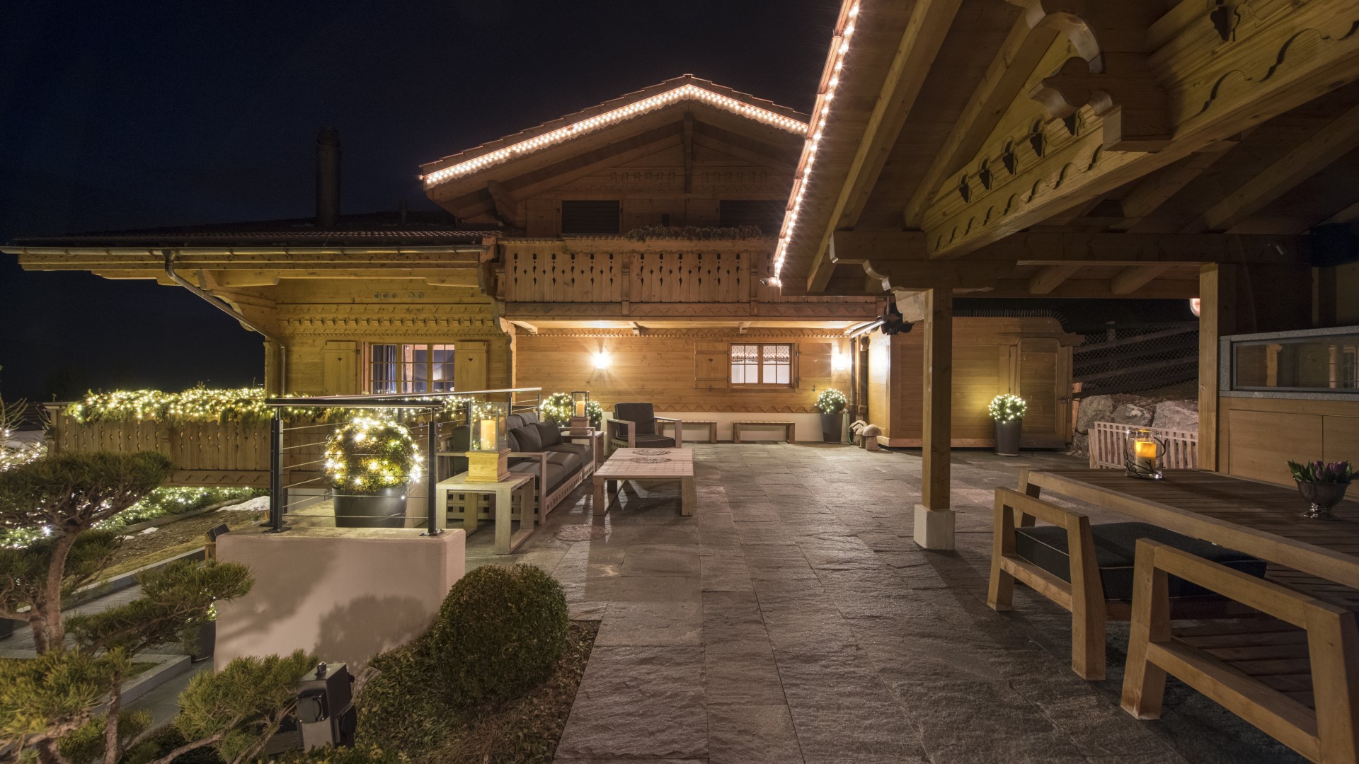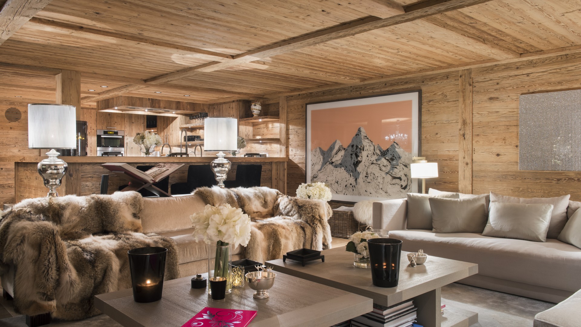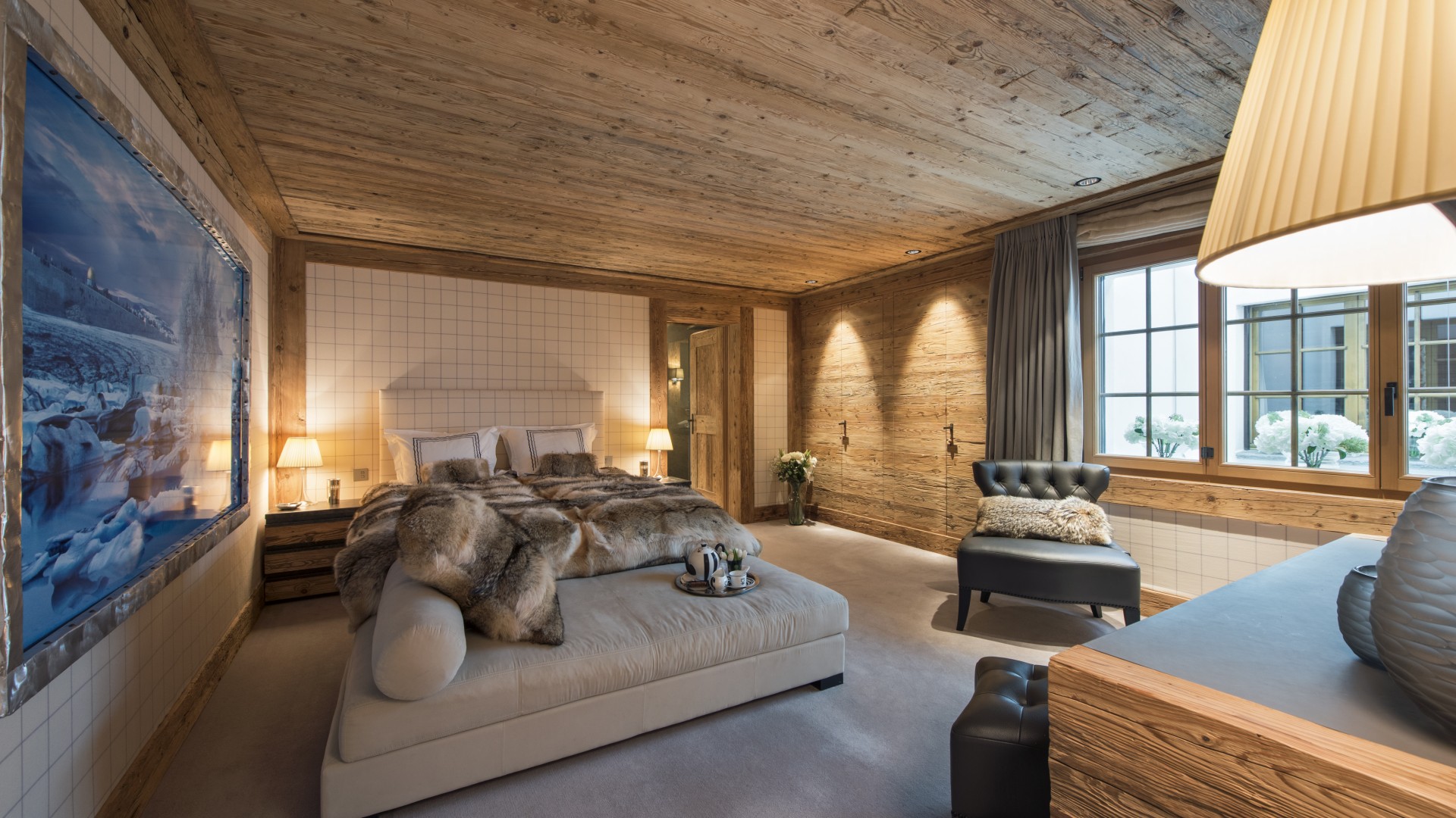 Surrounded by panoramic views of a breathtaking mountain scene, there is a large outdoor barbecue area on this level with a contemporary fireplace and comfy seating. The chalet is an impressive alpine retreat for the most discerning client.