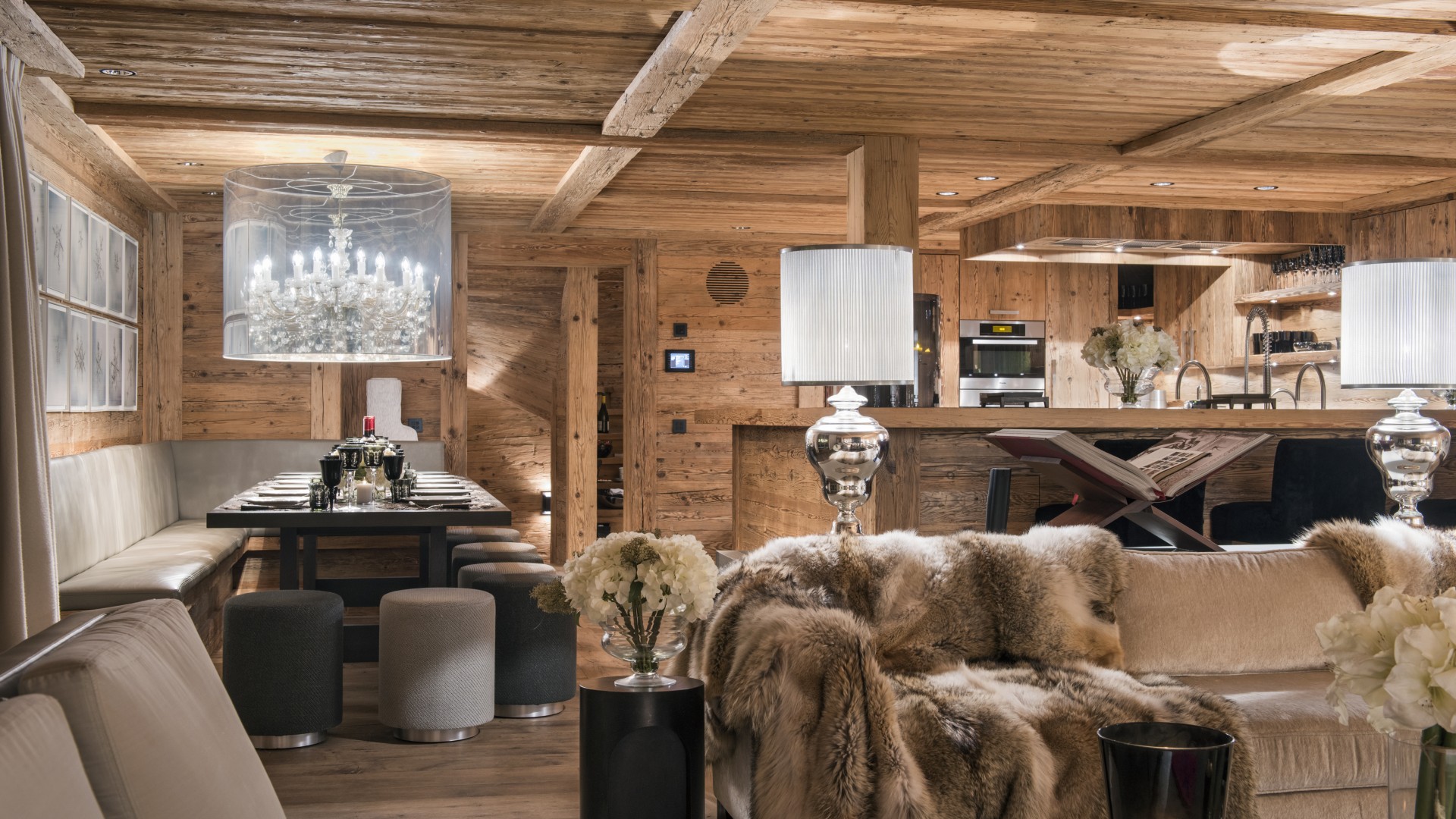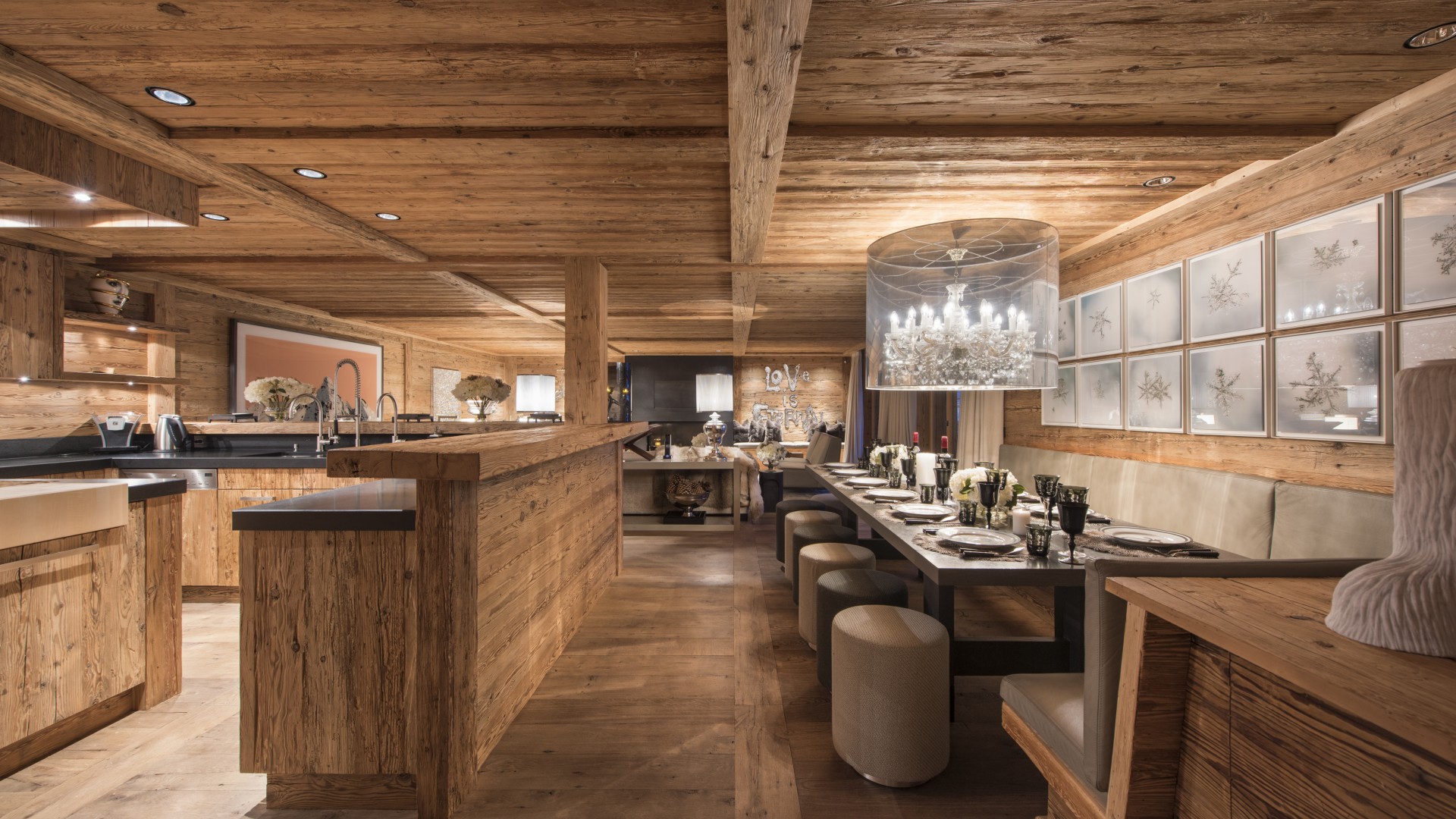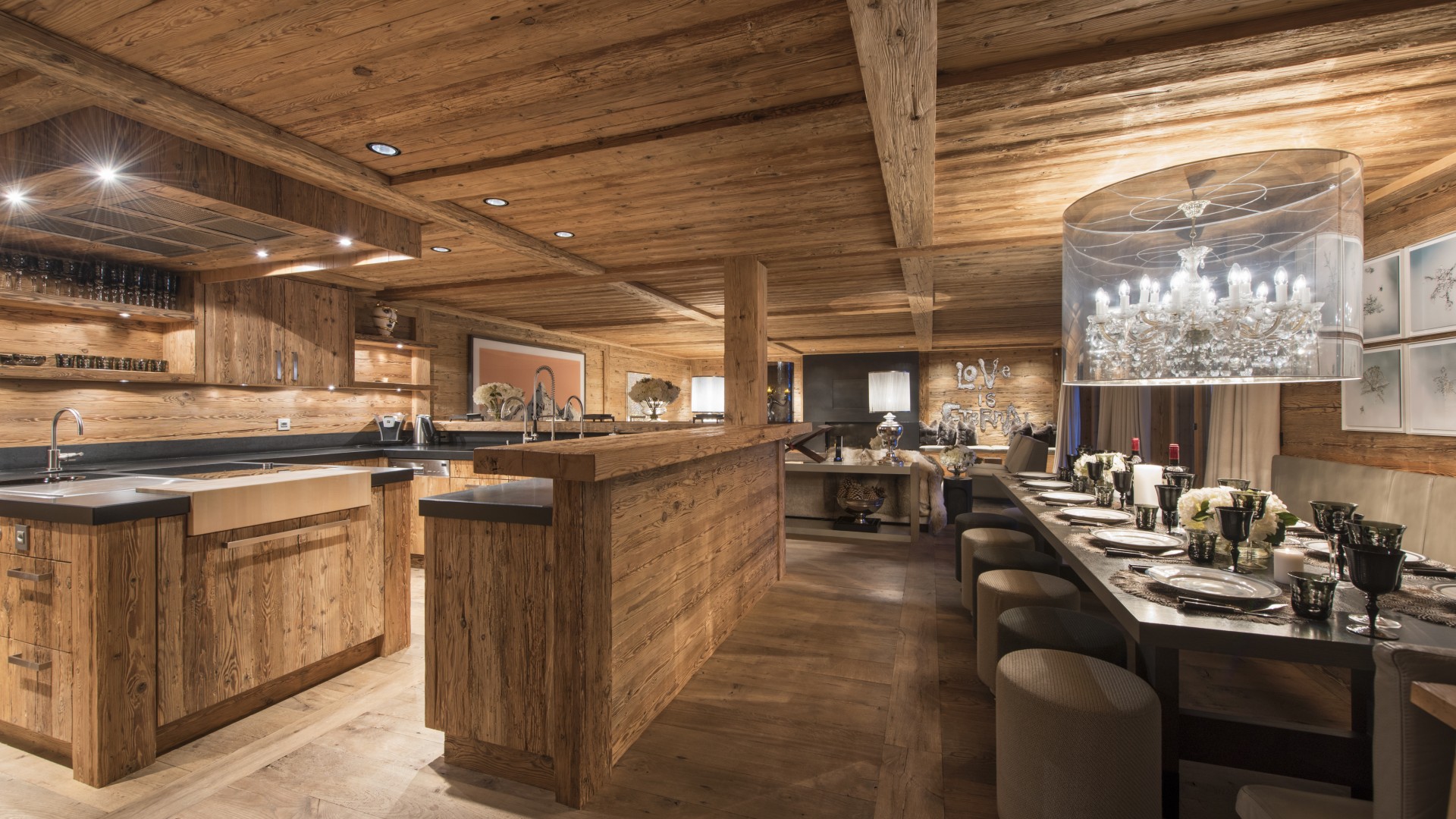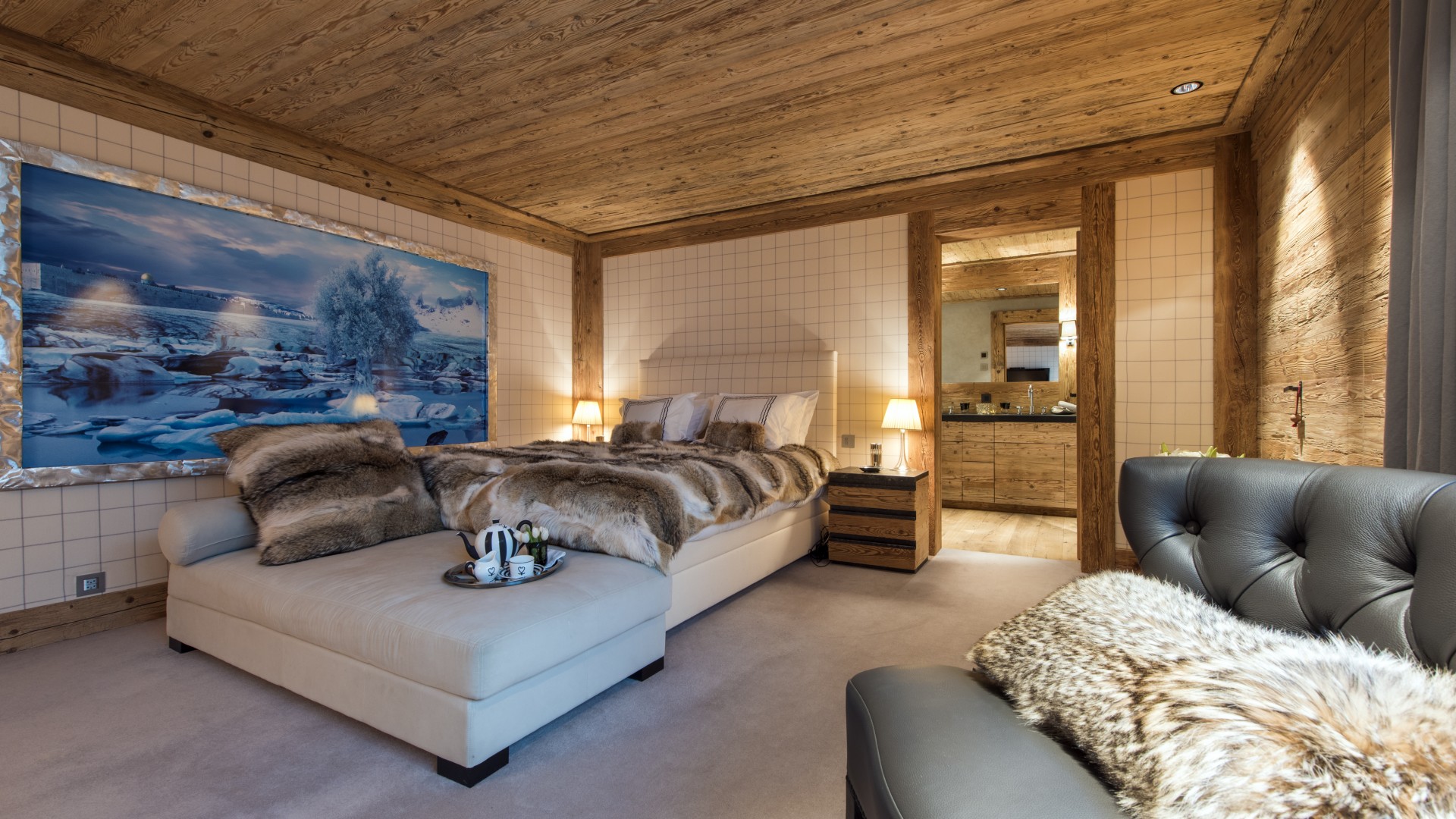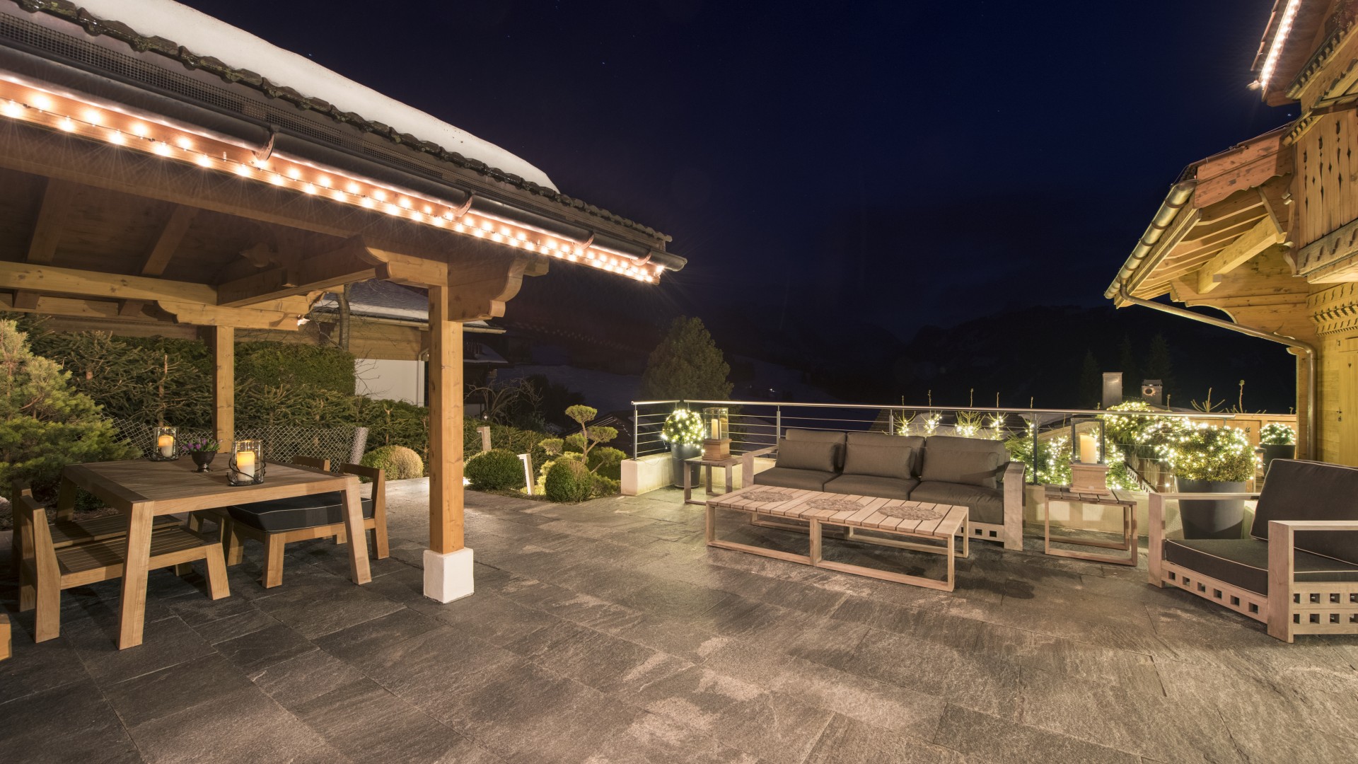Surrounded by panoramic views of a breathtaking mountain scene, there is a large outdoor barbecue area on this level with a contemporary fireplace and comfy seating. The chalet is an impressive alpine retreat for the most discerning client.
