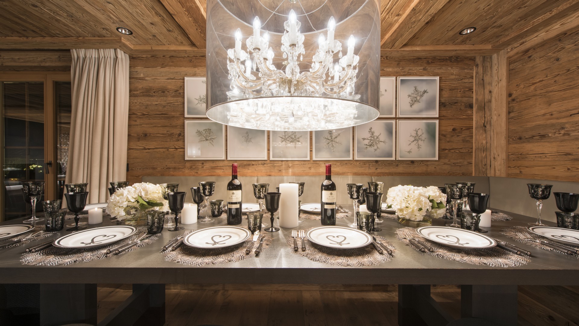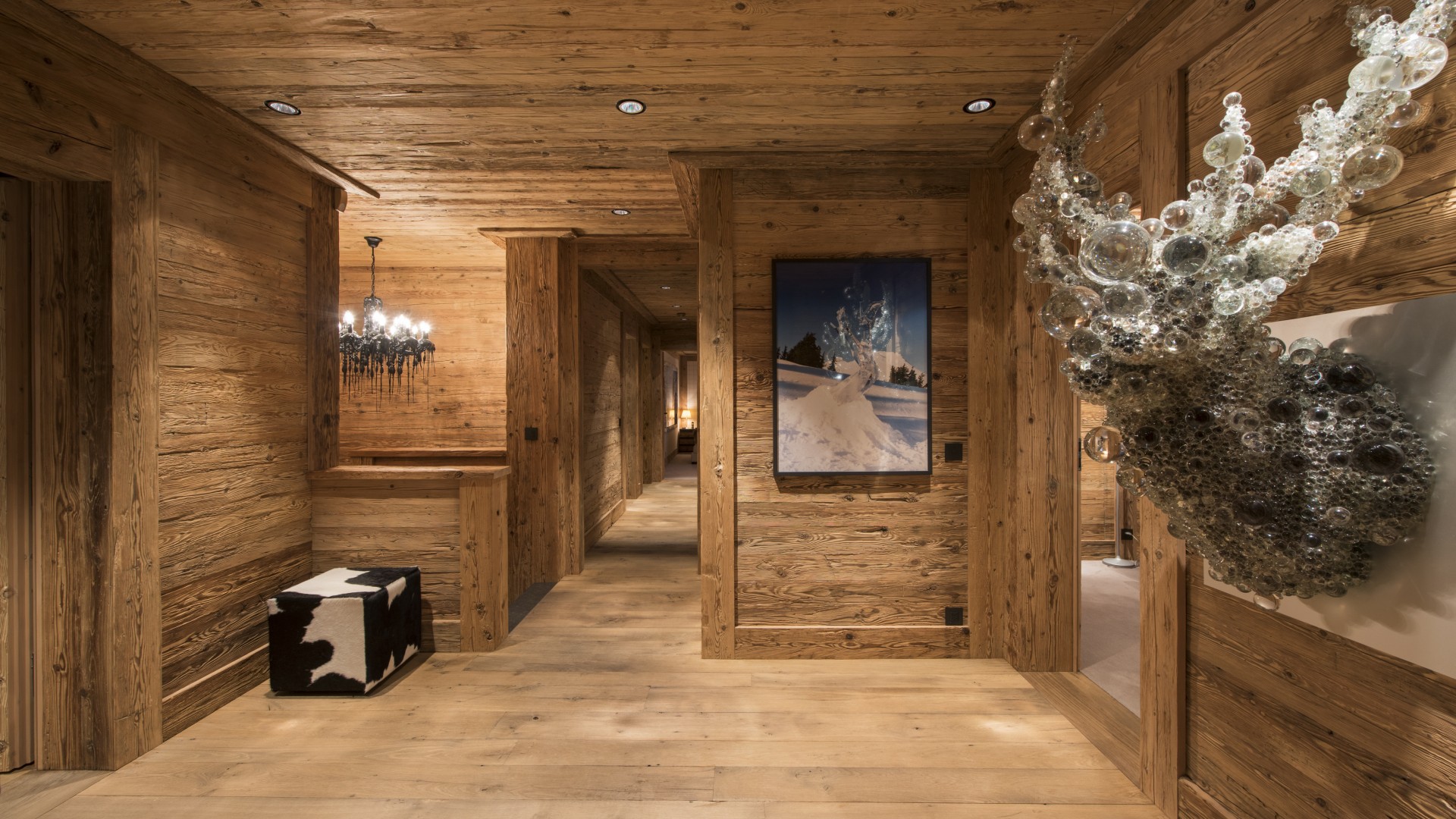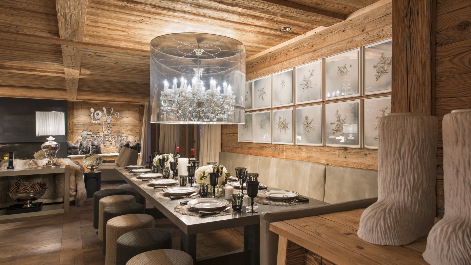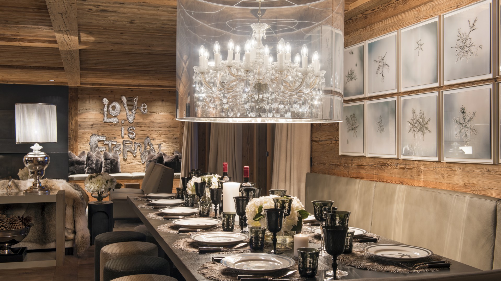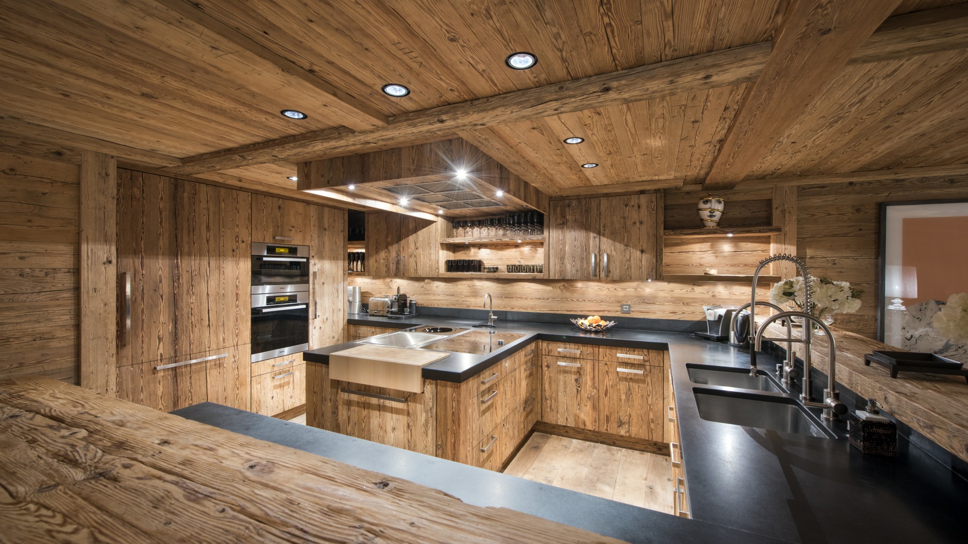 Surrounded by panoramic views of a breathtaking mountain scene, there is a large outdoor barbecue area on this level with a contemporary fireplace and comfy seating. The chalet is an impressive alpine retreat for the most discerning client.