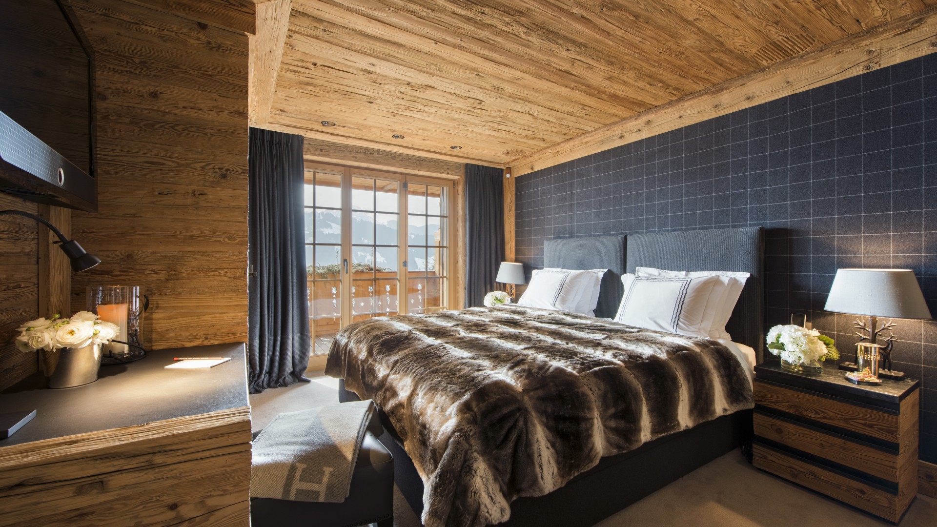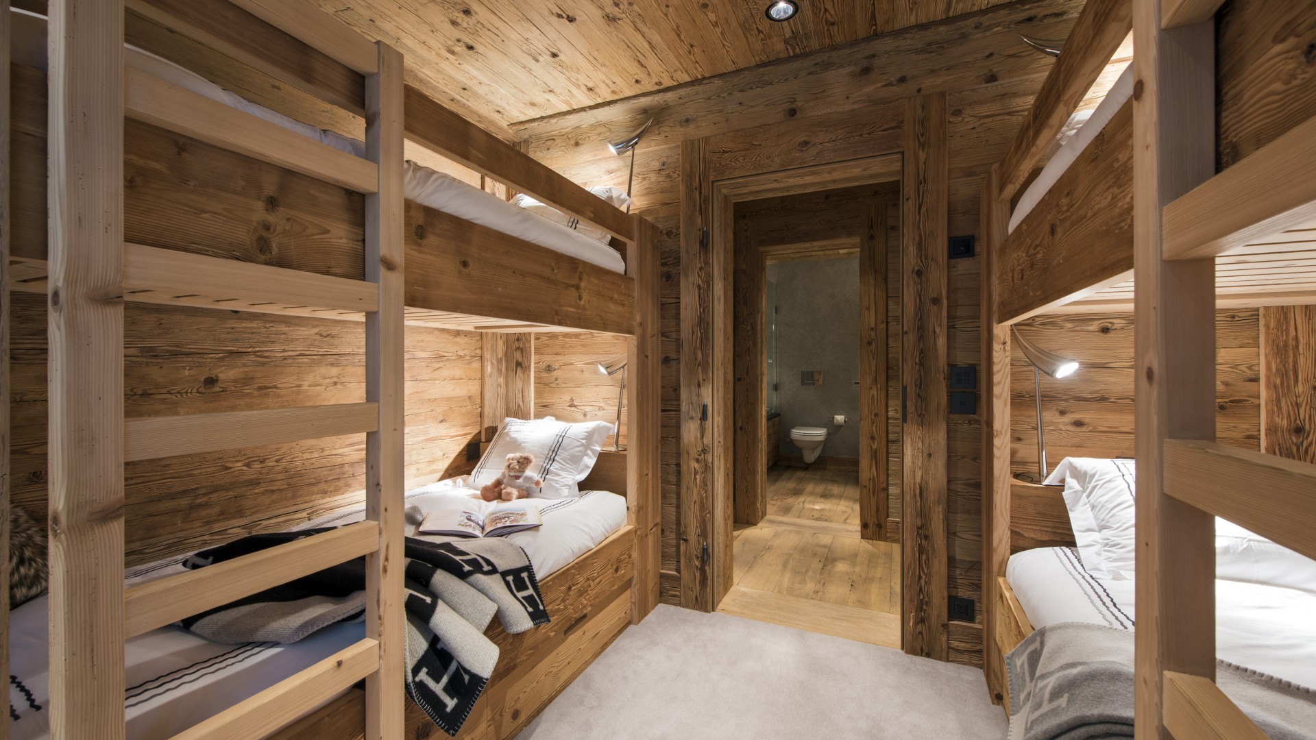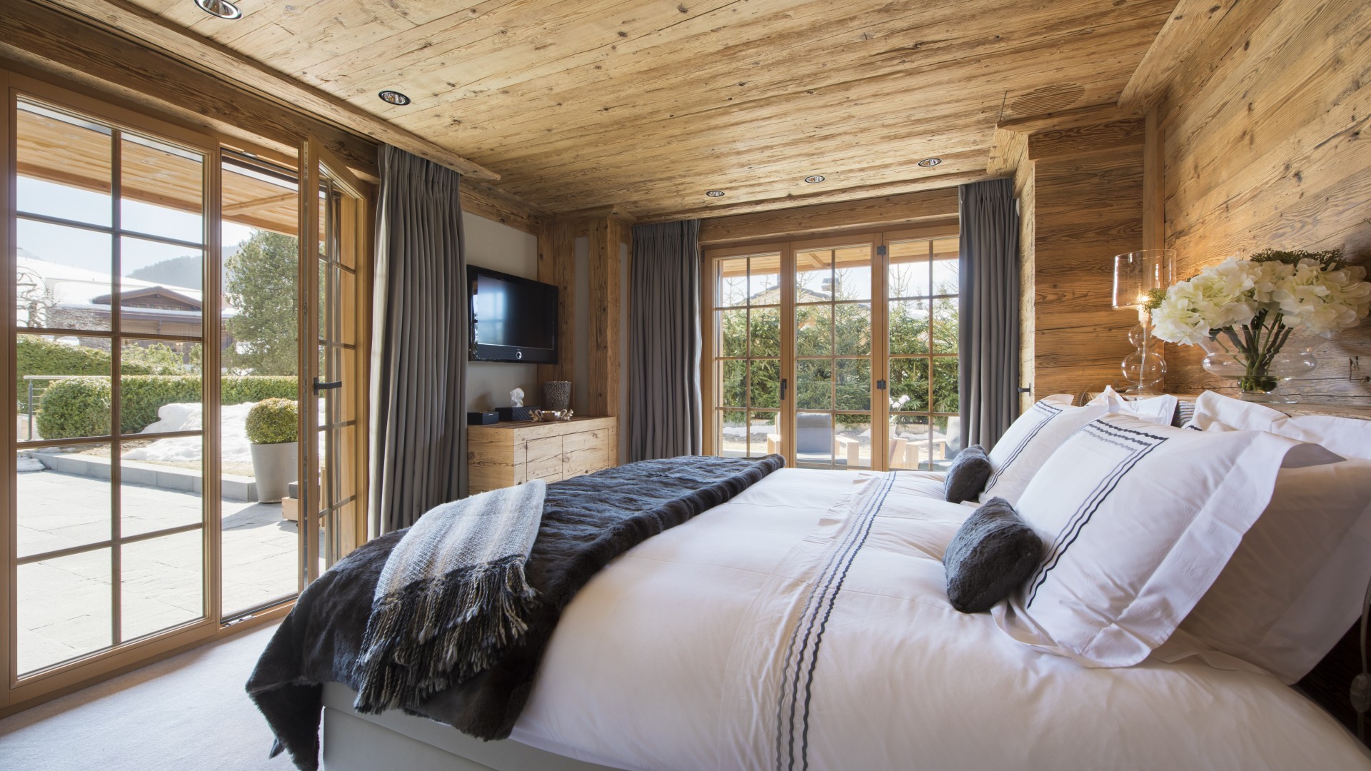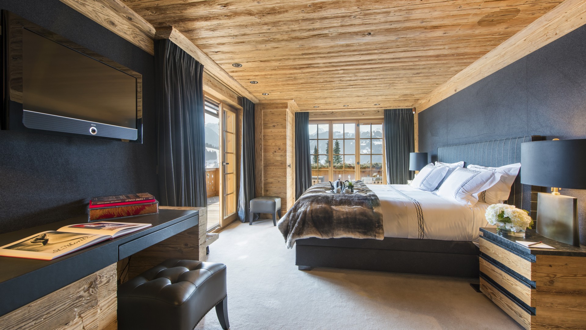 All the bedrooms in the chalet have desks, flat screen TVs with international channels, iPod docking stations and DVD players. On the ground floor, there are two double bedrooms, both with en-suite bathrooms and French windows which open out onto the beautiful terrace and garden.