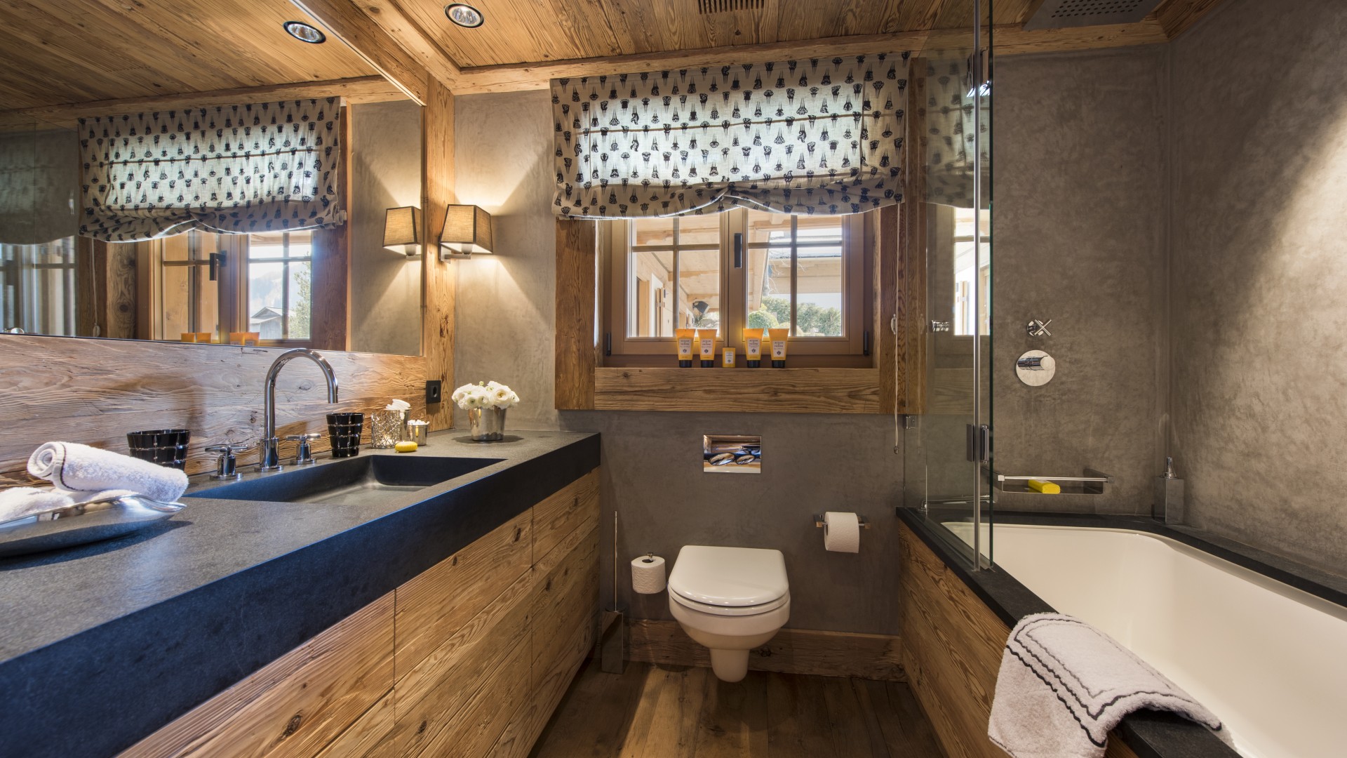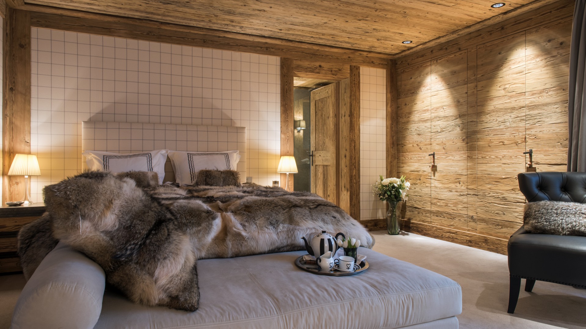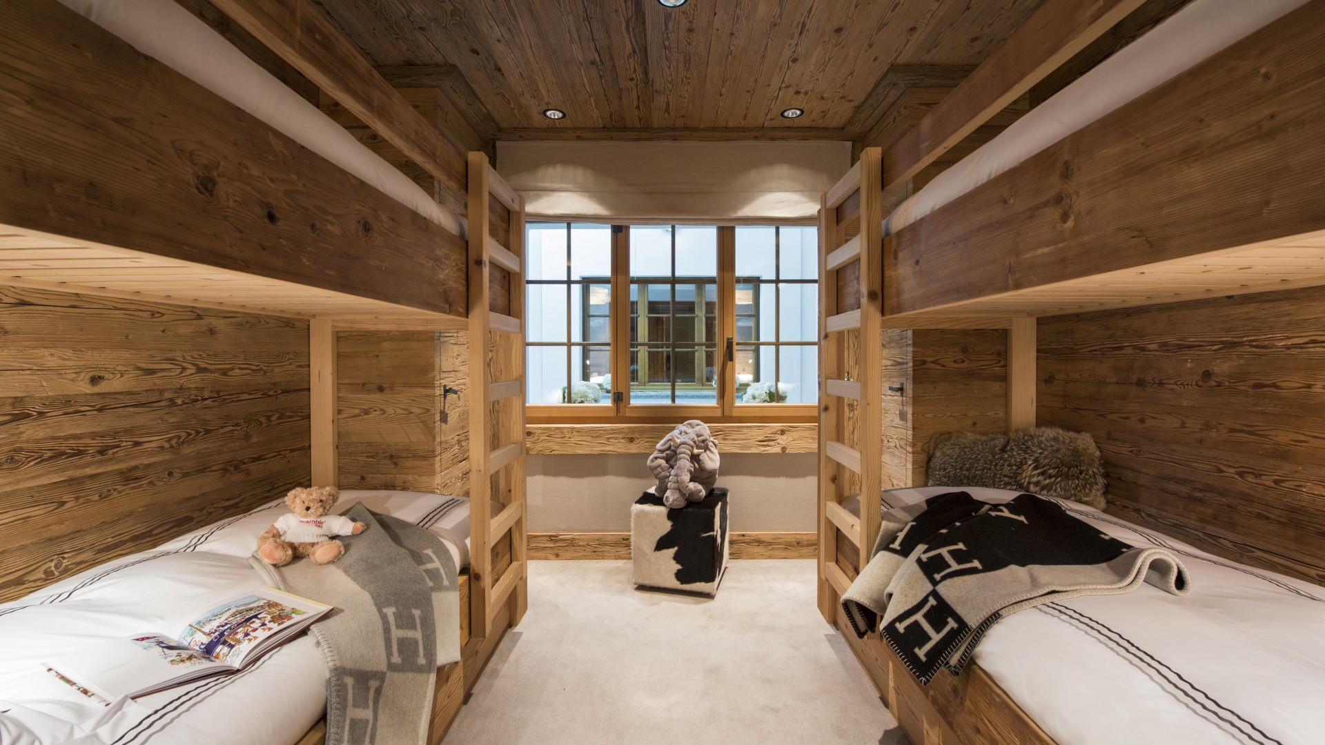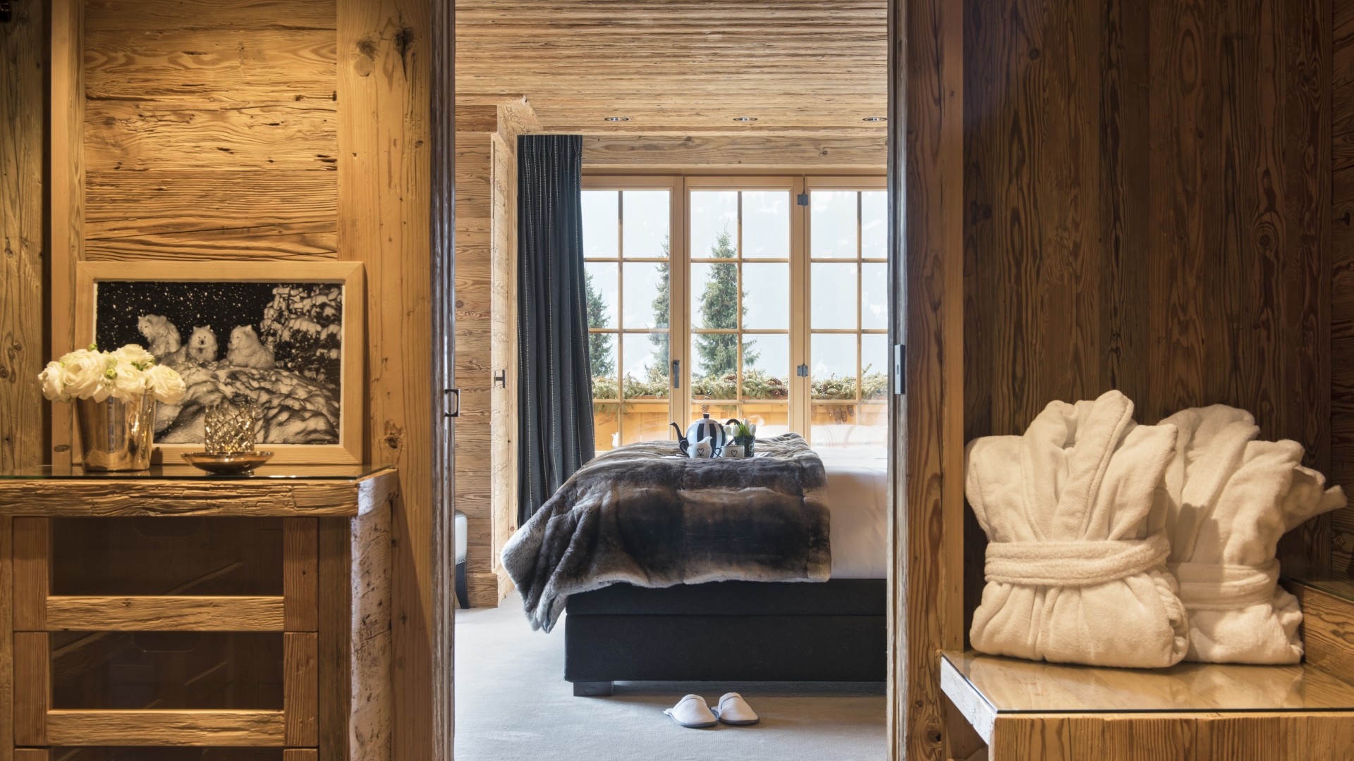 All the bedrooms in the chalet have desks, flat screen TVs with international channels, iPod docking stations and DVD players. On the ground floor, there are two double bedrooms, both with en-suite bathrooms and French windows which open out onto the beautiful terrace and garden.