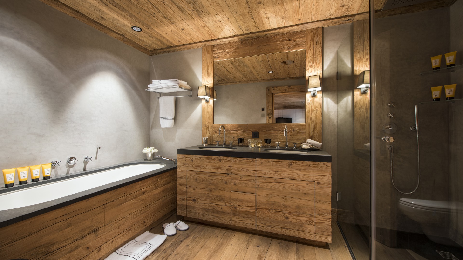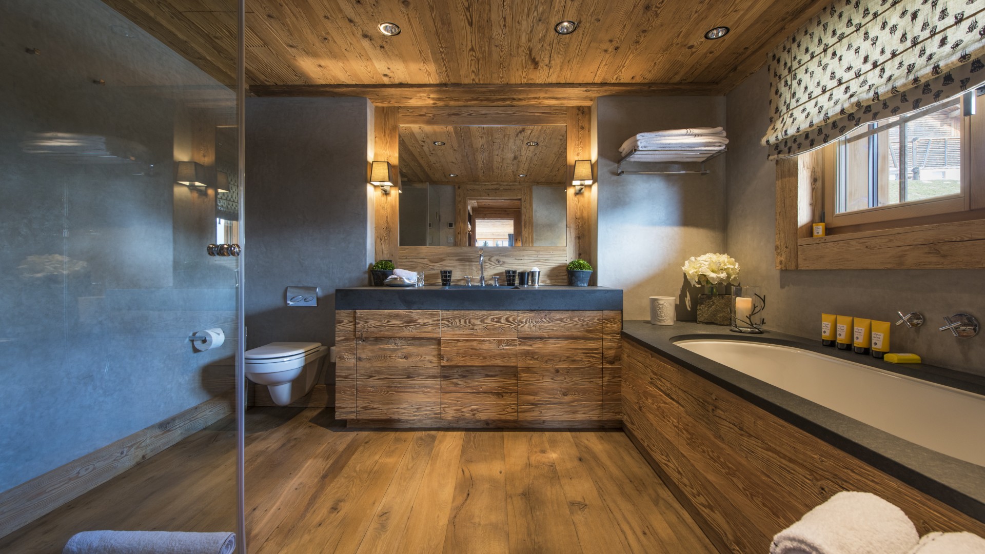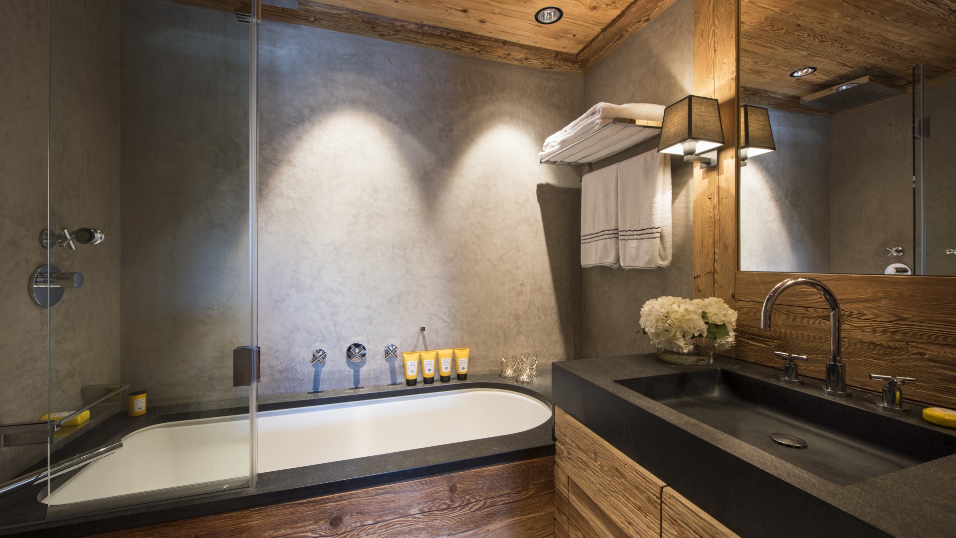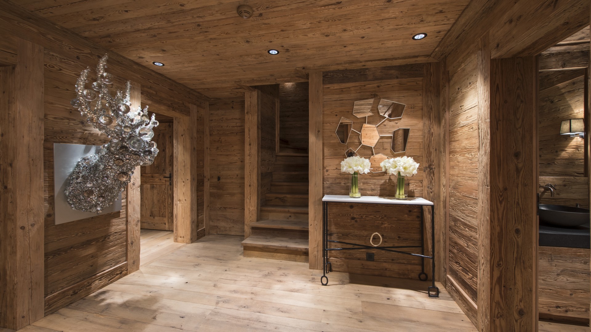 All the bedrooms in the chalet have desks, flat screen TVs with international channels, iPod docking stations and DVD players. On the ground floor, there are two double bedrooms, both with en-suite bathrooms and French windows which open out onto the beautiful terrace and garden.