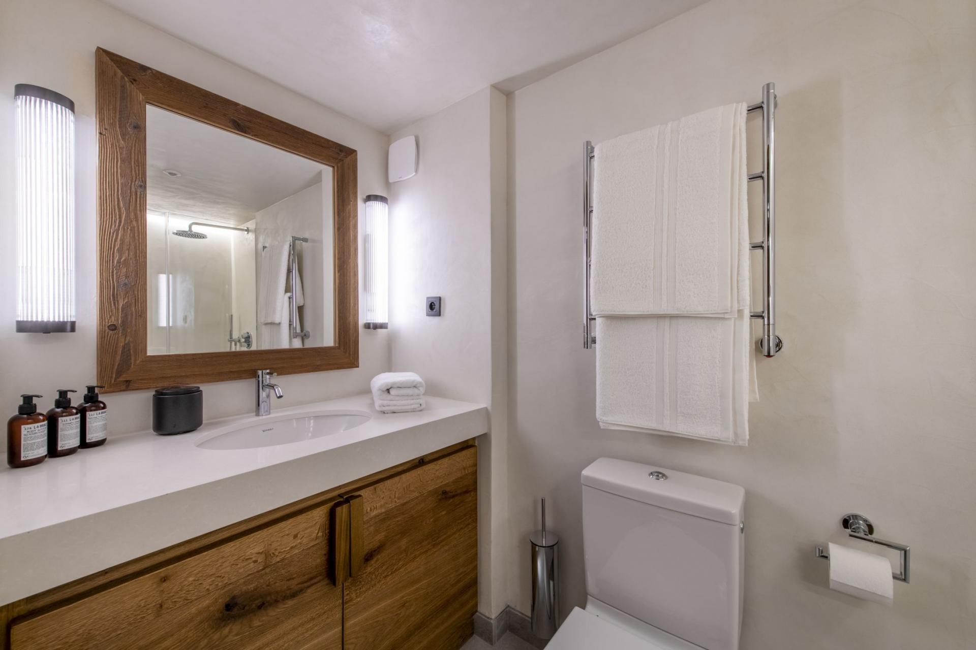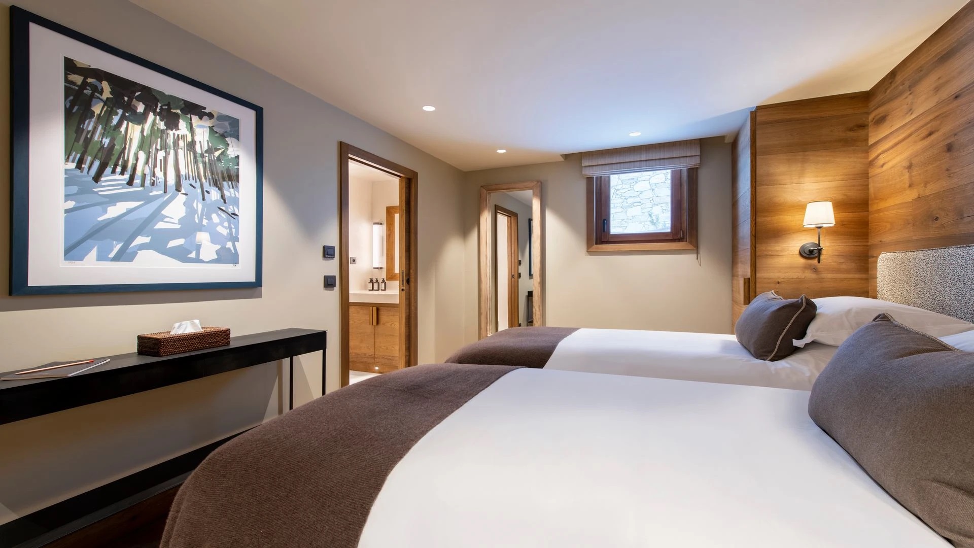 The staircase leads up to the top floor where you will find the two-impressive master double bedroom suites. The first master bedroom with en-suite bathroom and separate shower, has a private balcony. The second master suite comes with en-suite bathroom and separate shower. Both bedrooms have a tranquil and calm atmosphere and will leave you feeling rested and ready for a day on the slopes.