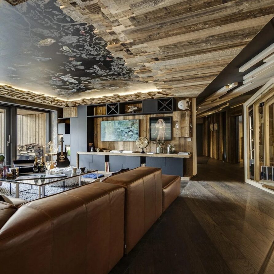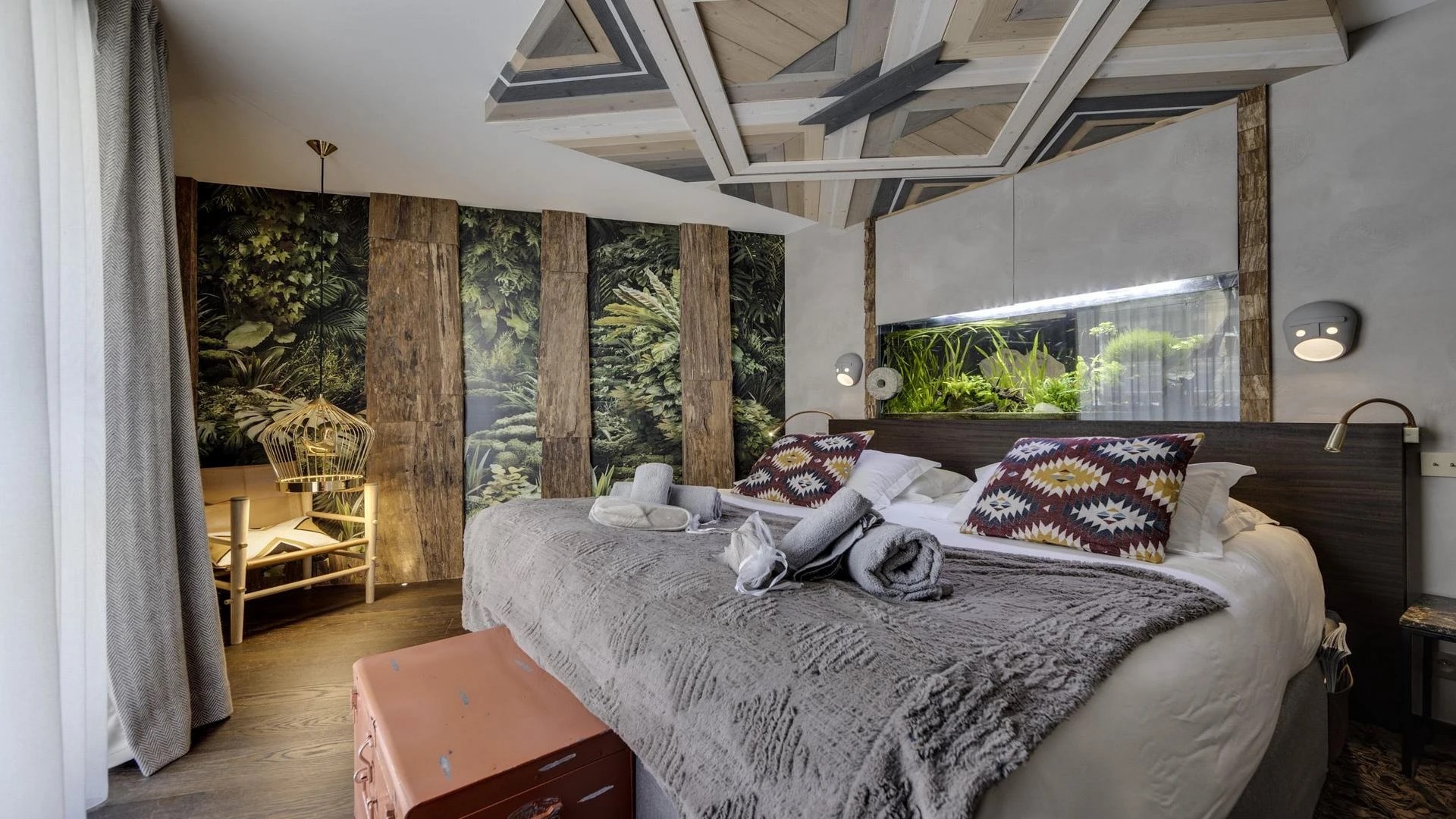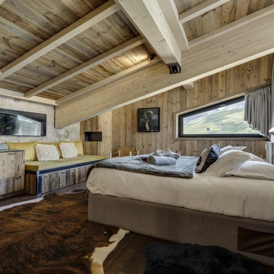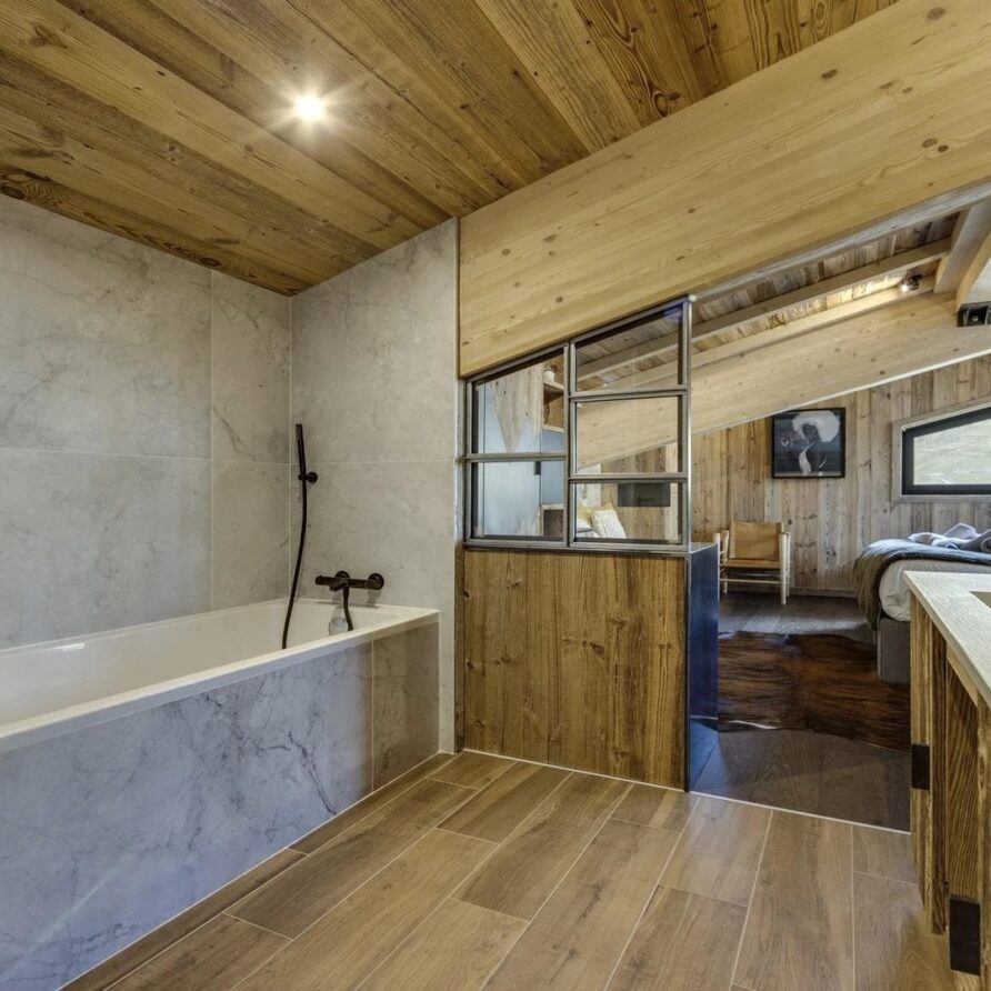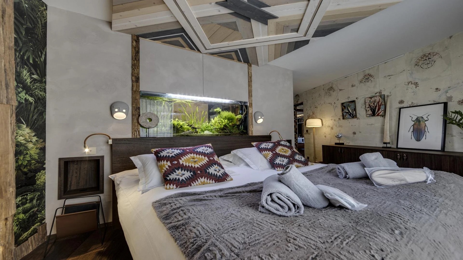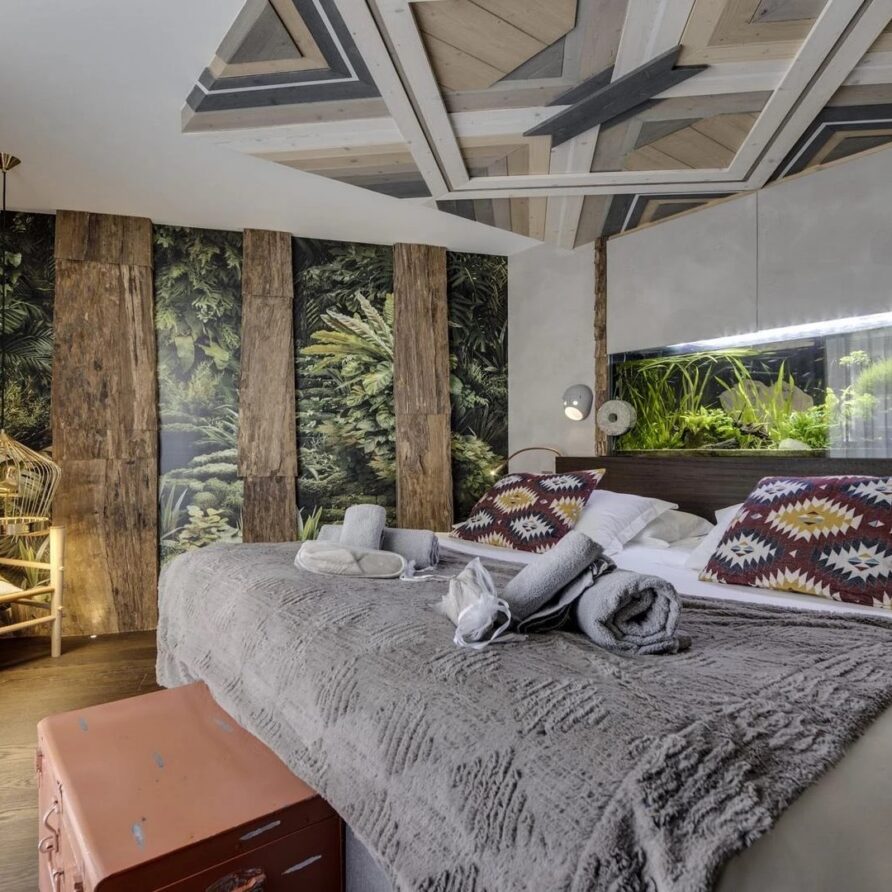 The chalet comfortably accommodates up to 10 guests across five beautifully-appointed double or twin bedrooms, making it the perfect retreat for a luxurious family ski holiday. Each bedroom is equipped with its own bath or shower room featuring walk-in showers, and one particularly charming suite boasts a unique aquarium headboard, adding a playful touch. The master bedroom and a second on-level bedroom come with seating areas and with the exception of two bedrooms, the bedchambers are equipped with flat-screen TV’s.