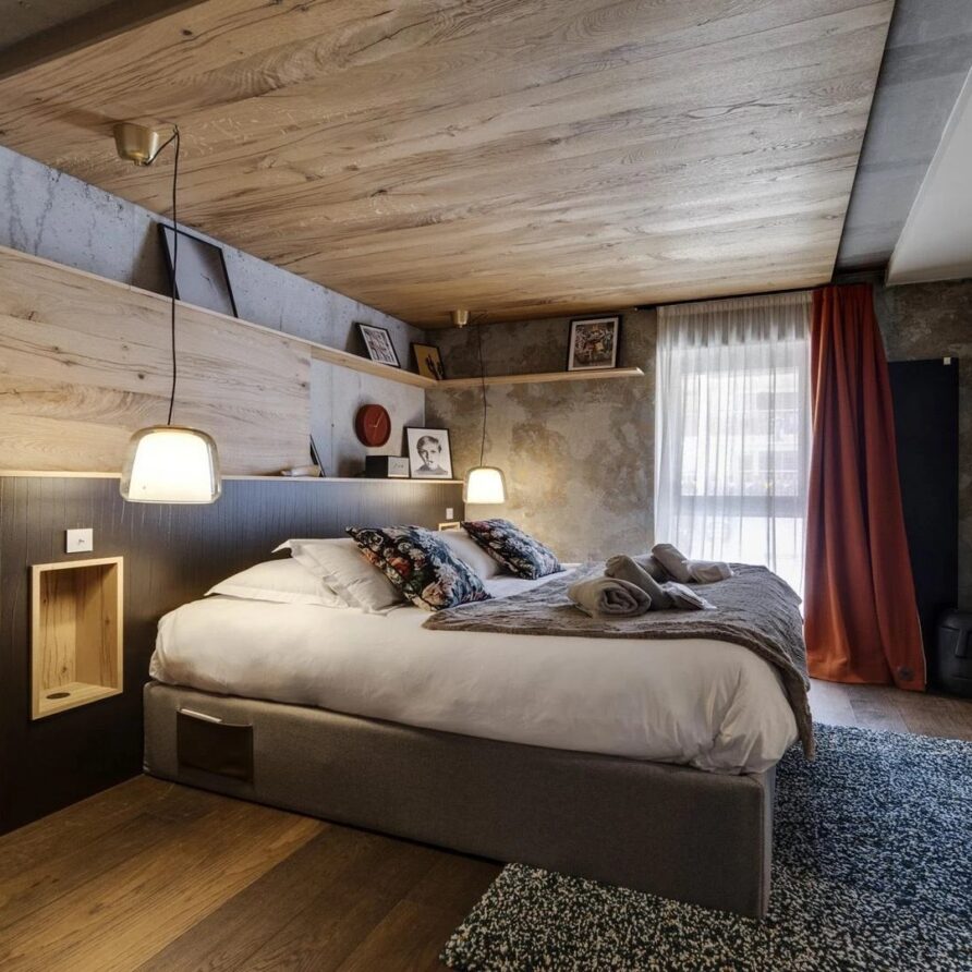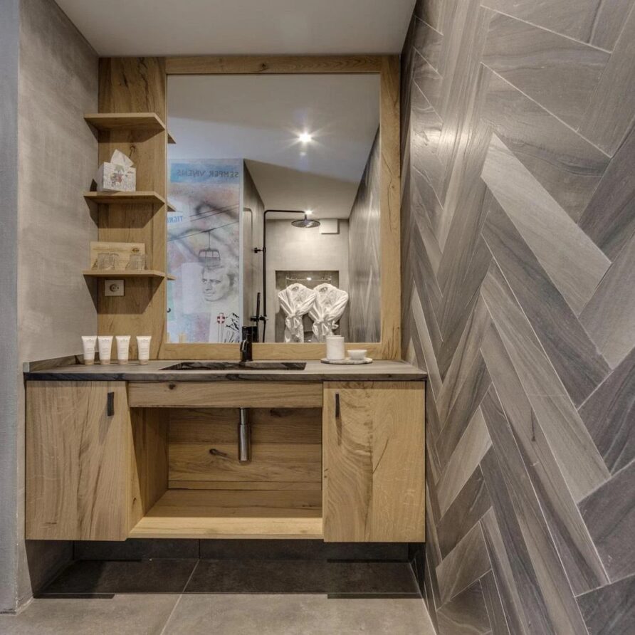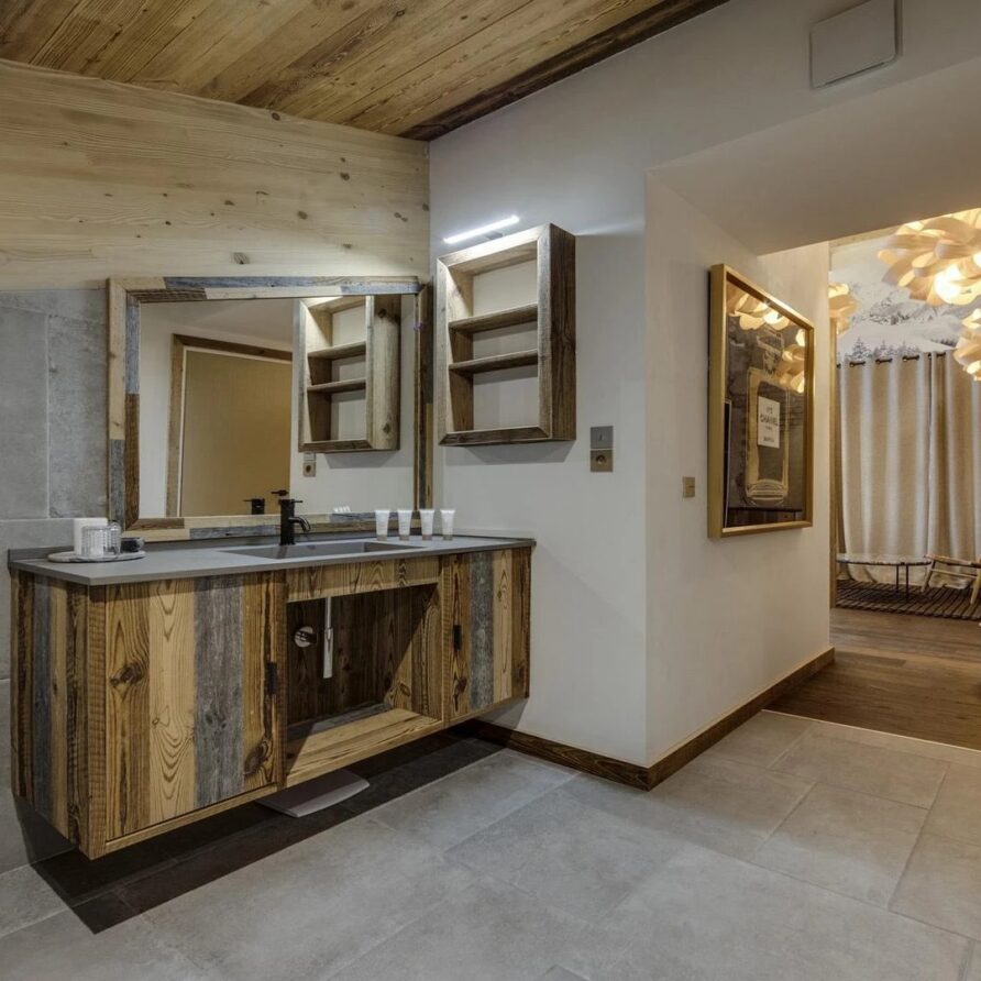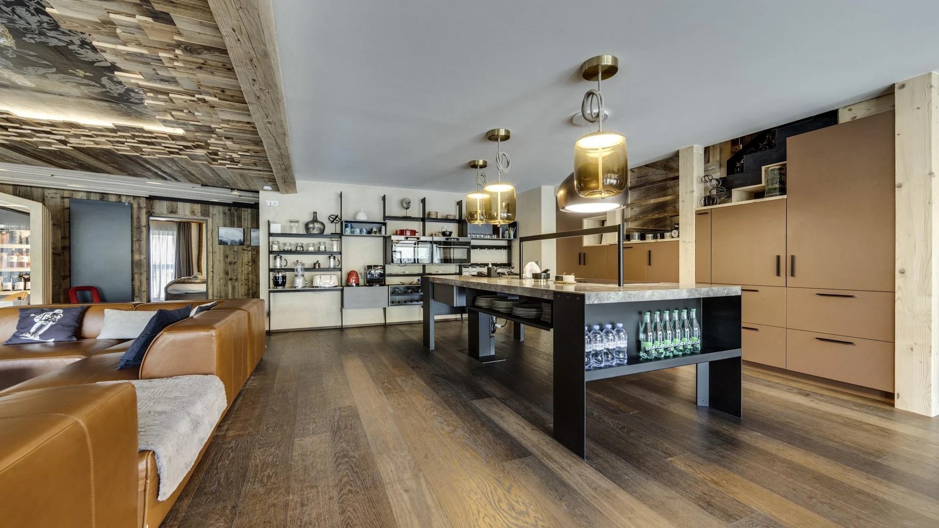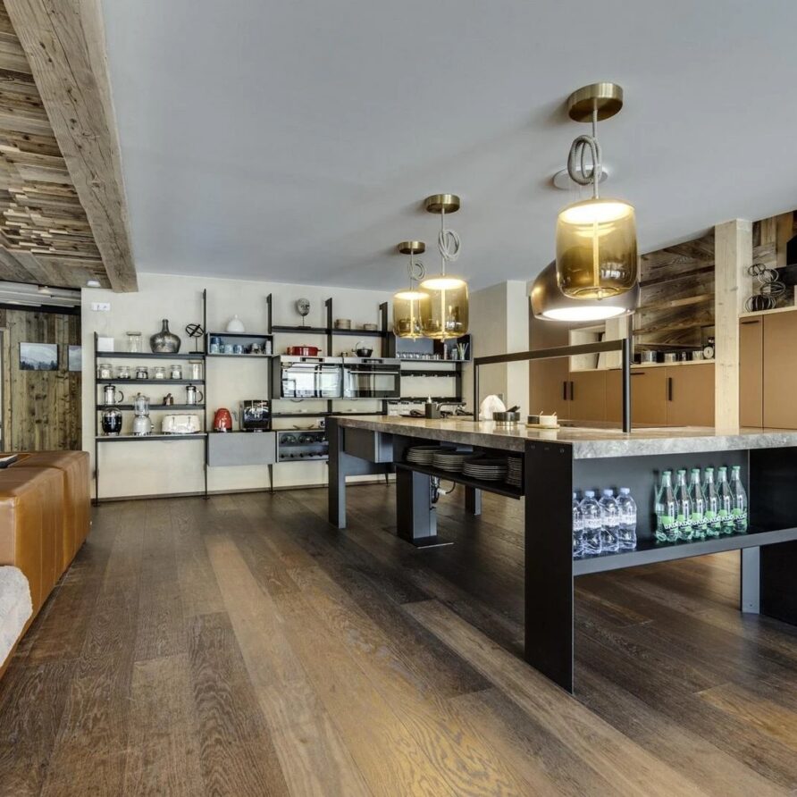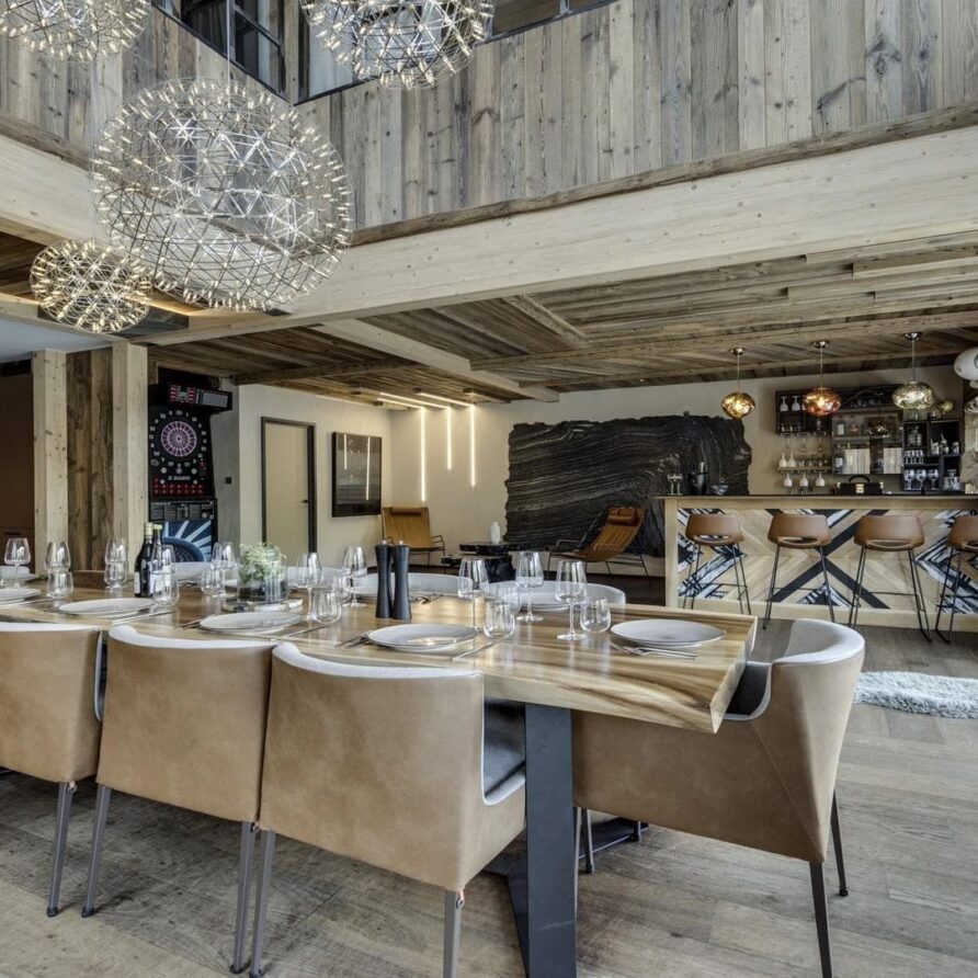 Within the chalet, open-plan living spaces, each with a unique character yet imbued with the chalet’s rustic elegance, immediately make you feel at home. Relax in style on the plush seating by the television, unwinding after a thrilling day on the world-class slopes. Adjacent to the living area, the kitchen offers a distinctive space to whip up delightful dishes or experiment with your culinary flair, if you choose to dine in. Share memorable meals around the expansive wooden dining table, illuminated by charming lights and framed by lofty ceilings, as you savor the delicacies lovingly prepared by your chosen cook.