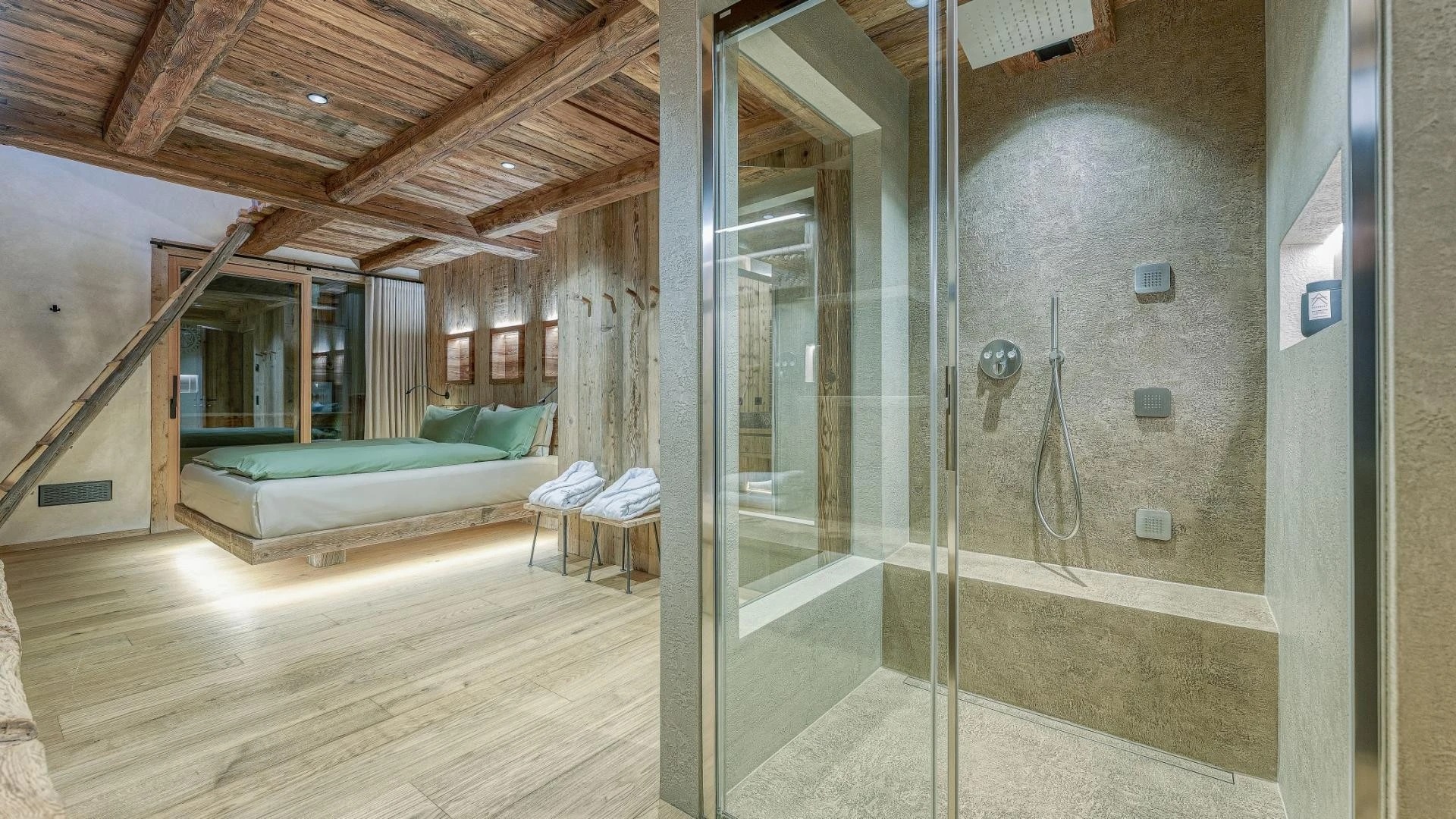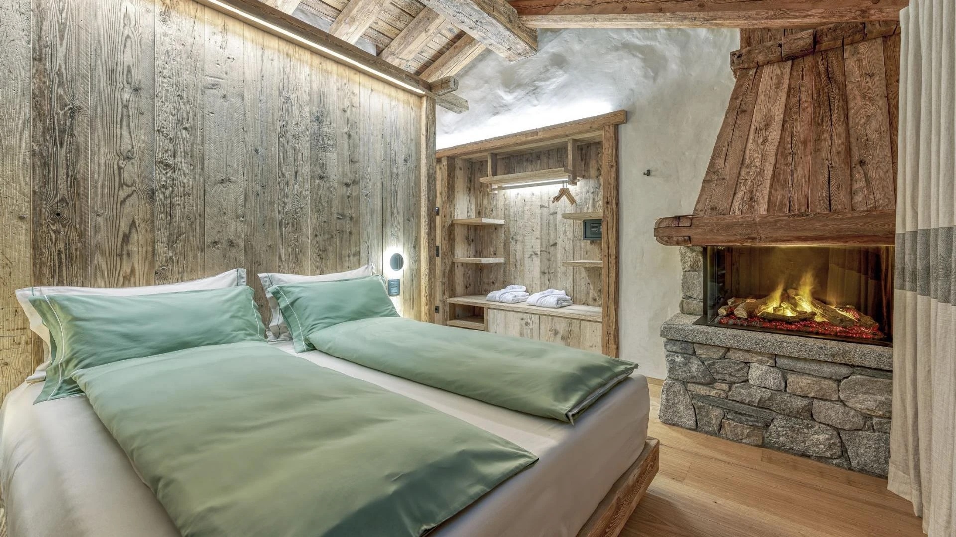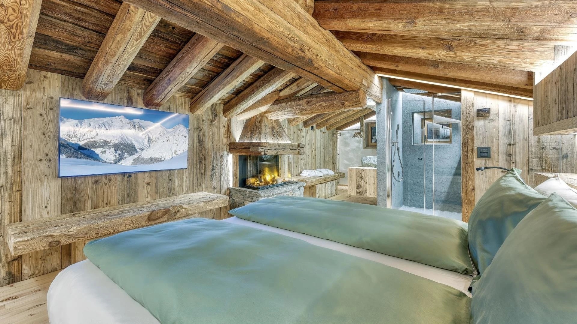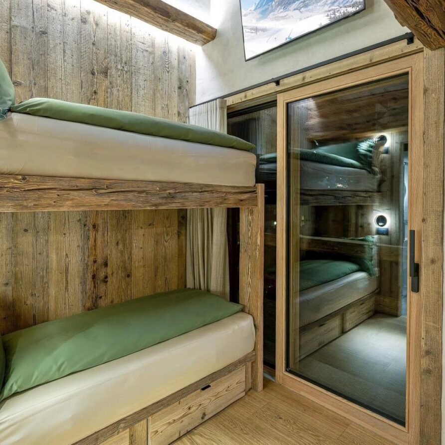Five beautifully designed bedrooms await you, thoughtfully spread across three stunning floors, each offering unique charm and luxurious amenities. On the top floor, you’ll find a serene double bedroom featuring a cozy fireplace that adds a warm ambiance to your stay. This room is complemented by an open-plan shower room, providing an inviting retreat after a day on the slopes. The first floor boasts three additional bedrooms, perfect for accommodating families or groups. A spacious double bedroom with private balconies, where you can savor your morning coffee while enjoying breathtaking views. This room also includes a charming fireplace, and an en-suite bathroom equipped with a double shower, ensuring a comfortable and indulgent experience.