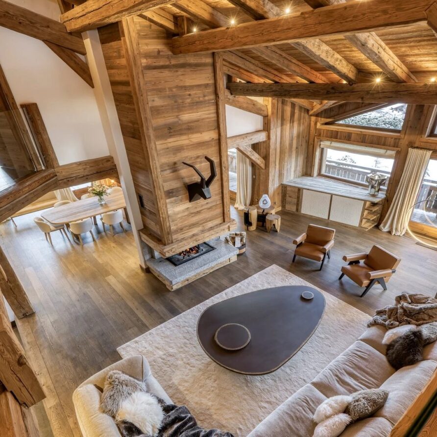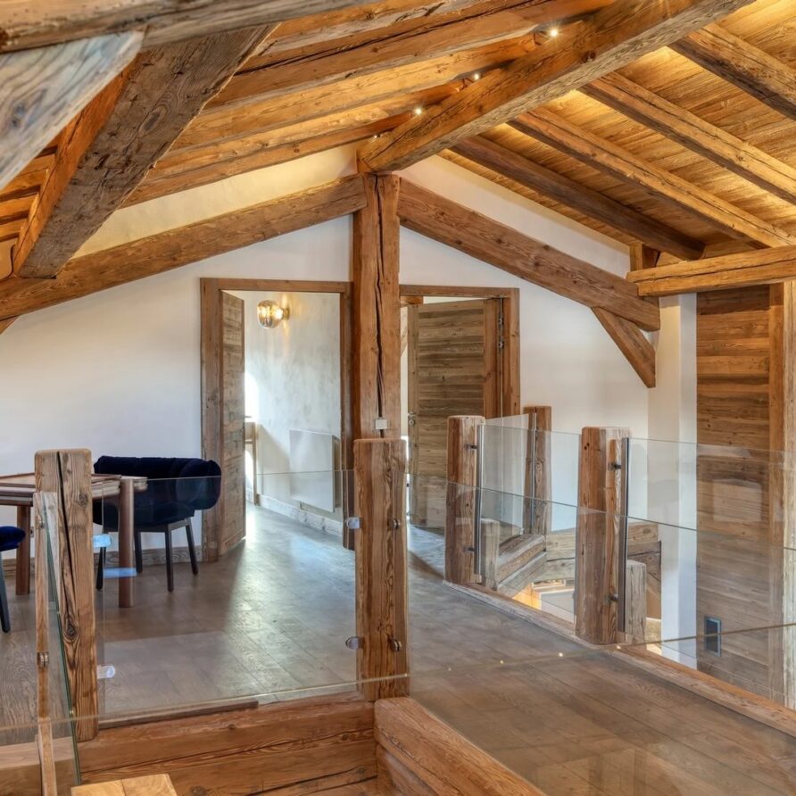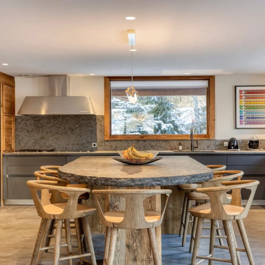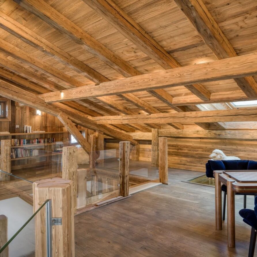 The chalet, which extends over three floors, has a traditional outside construction, typical for this area, with its use of stone and wood, and a surprisingly contemporary design inside. With five en-suites bedrooms and a large dormitory for little ones, holiday chalet can host up to 13 people. The main hub is the open-plan living room on the ground floor with cathedral high ceilings giving a feel of grandeur and spaciousness. Underlining this are a slightly separated intimate sofa corner in soft natural tones with wooden, rustic side table, leather armchairs scattered around, a large L-shaped couch and a massive wooden staircase leading to a mezzanine. Its centerpiece is the wood-burning fireplace, which reaches up to the exposed wooden beams and divides the generous space. Like the entire ski lodge, with the exception of the kitchen and bathrooms, the room has wooden flooring.