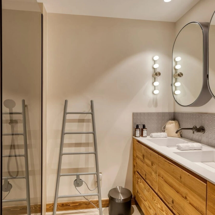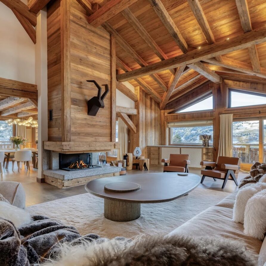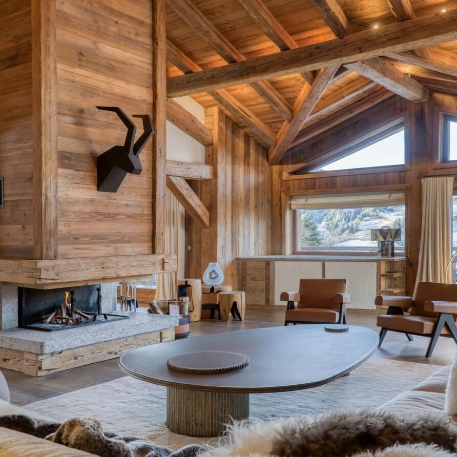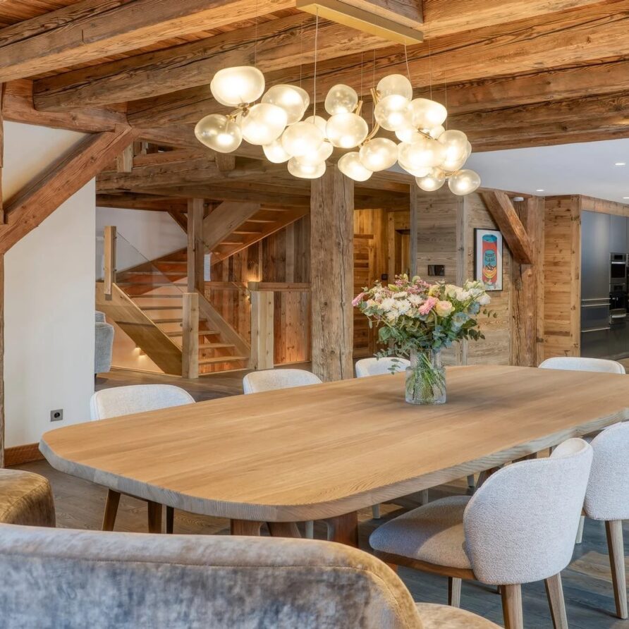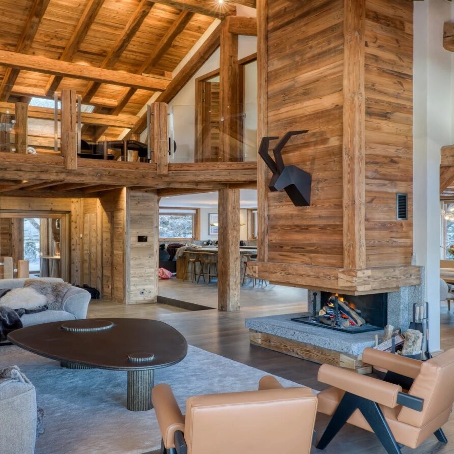 The chalet, which extends over three floors, has a traditional outside construction, typical for this area, with its use of stone and wood, and a surprisingly contemporary design inside. With five en-suites bedrooms and a large dormitory for little ones, holiday chalet can host up to 13 people. The main hub is the open-plan living room on the ground floor with cathedral high ceilings giving a feel of grandeur and spaciousness. Underlining this are a slightly separated intimate sofa corner in soft natural tones with wooden, rustic side table, leather armchairs scattered around, a large L-shaped couch and a massive wooden staircase leading to a mezzanine. Its centerpiece is the wood-burning fireplace, which reaches up to the exposed wooden beams and divides the generous space. Like the entire ski lodge, with the exception of the kitchen and bathrooms, the room has wooden flooring.