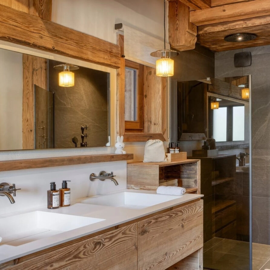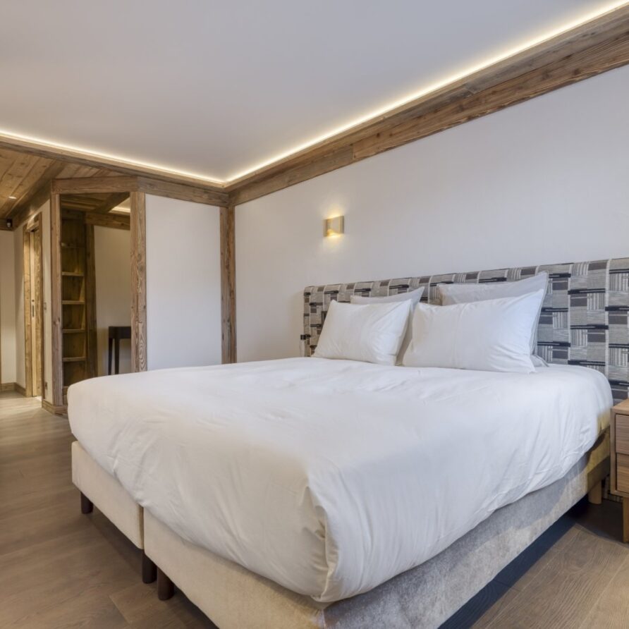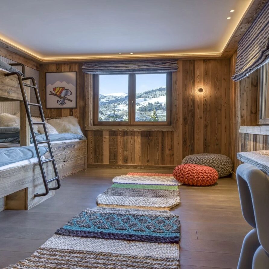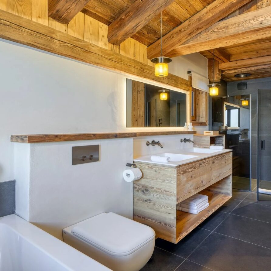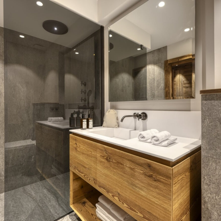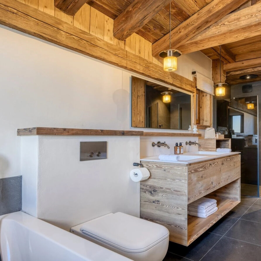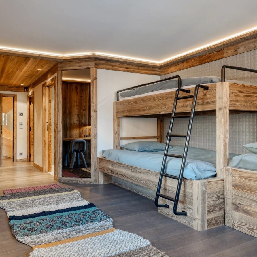 The bedrooms are distributed across all floors within Alpine holiday home, which is 500 square meters in size. The largest, the master suite, lies on the ground floor with private access to the terrace. Two double bedrooms, one with shower room, the other with bathroom and balcony, are on the first floor. Further downstairs, at garden level, there are two more bedrooms, one of which can be used as either a double or twin. Both have attached shower rooms. Finally, the garden level houses the sixth bedroom, the children’s dormitory with three bunk beds and private shower room. Common to most of the bedrooms is the generous use of wood, be it wall paneling or exposed wooden beams.