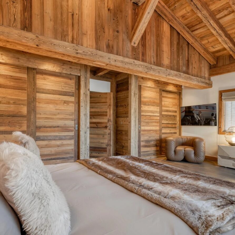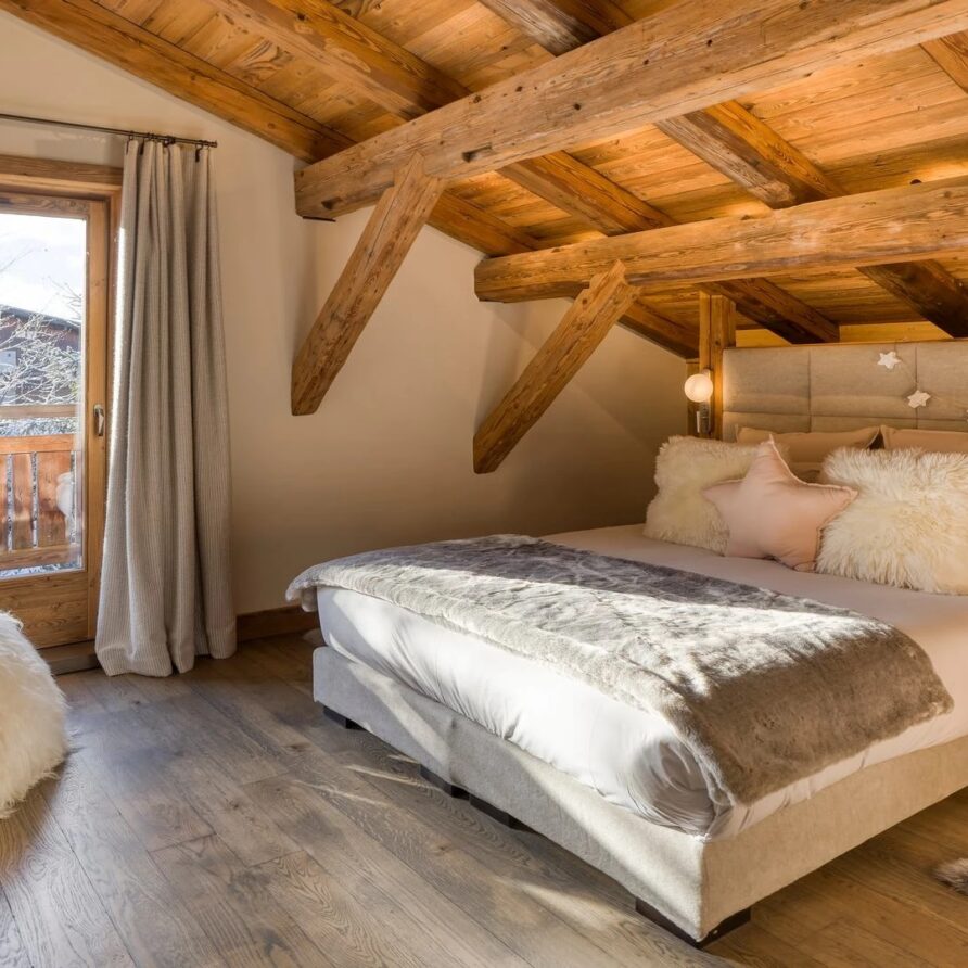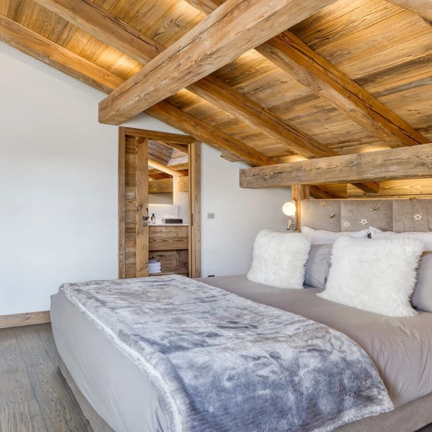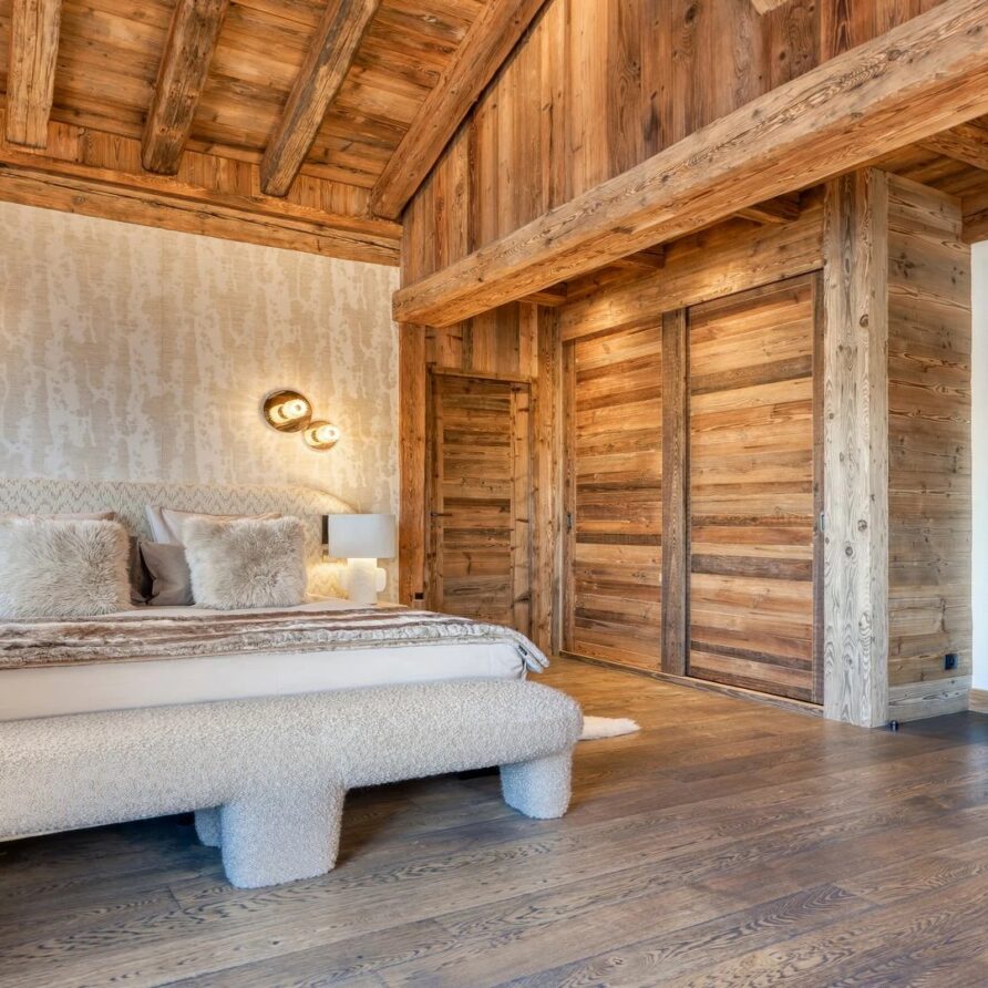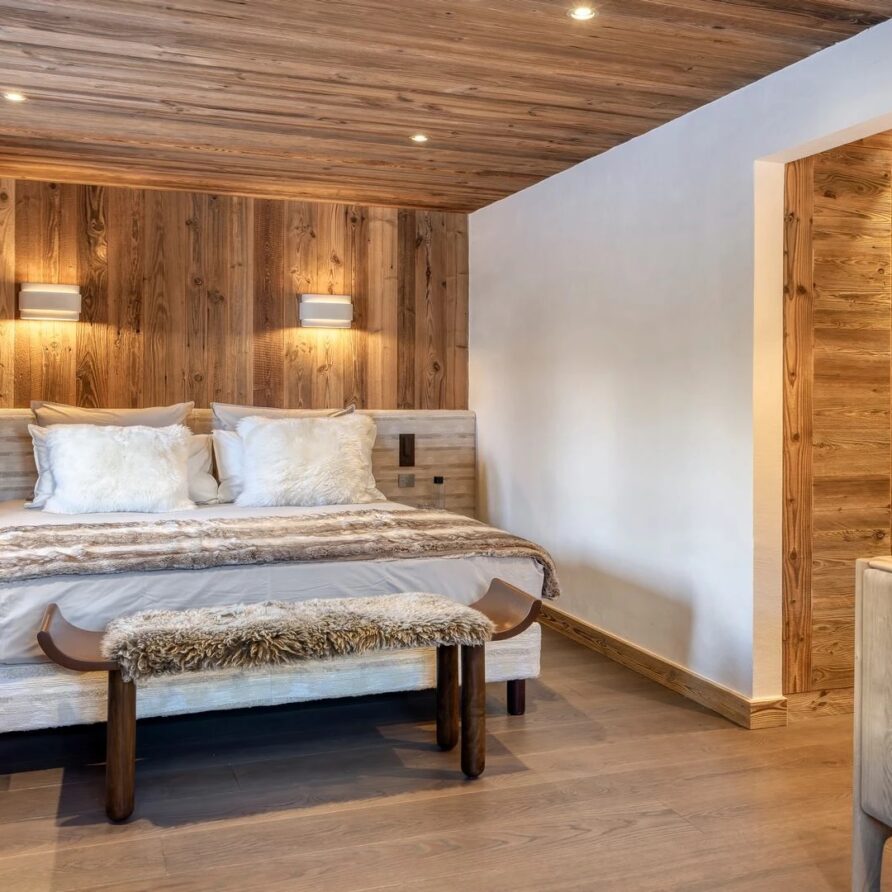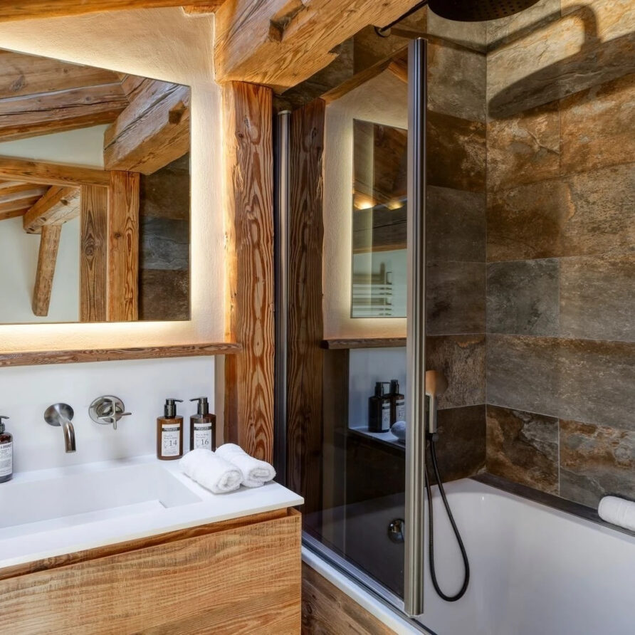 The bedrooms are distributed across all floors within Alpine holiday home, which is 500 square meters in size. The largest, the master suite, lies on the ground floor with private access to the terrace. Two double bedrooms, one with shower room, the other with bathroom and balcony, are on the first floor. Further downstairs, at garden level, there are two more bedrooms, one of which can be used as either a double or twin. Both have attached shower rooms. Finally, the garden level houses the sixth bedroom, the children’s dormitory with three bunk beds and private shower room. Common to most of the bedrooms is the generous use of wood, be it wall paneling or exposed wooden beams.