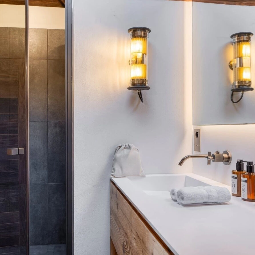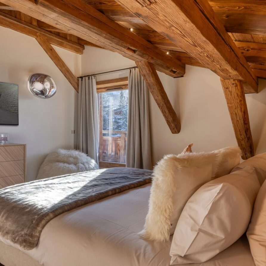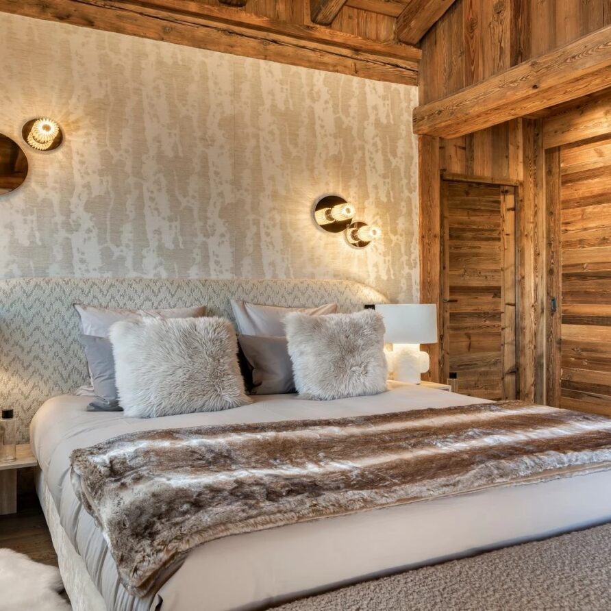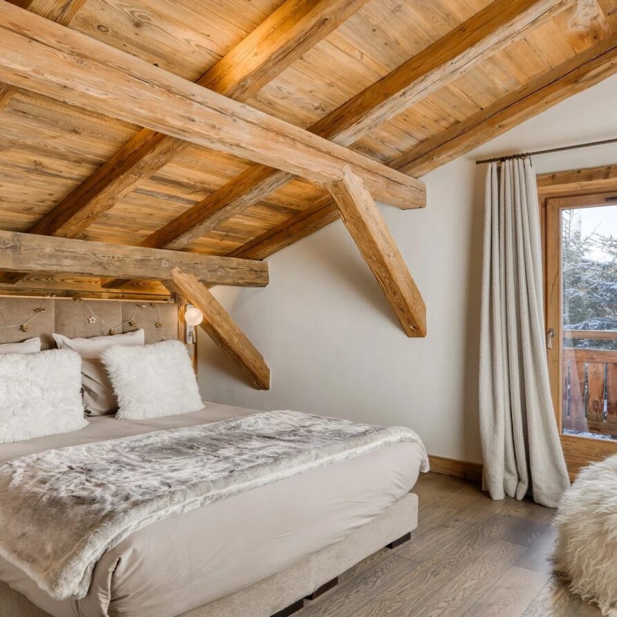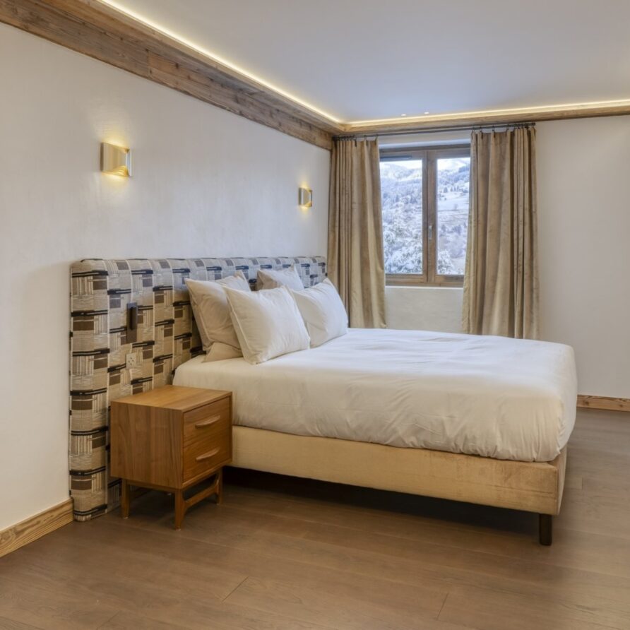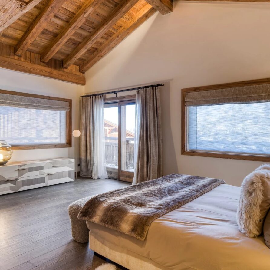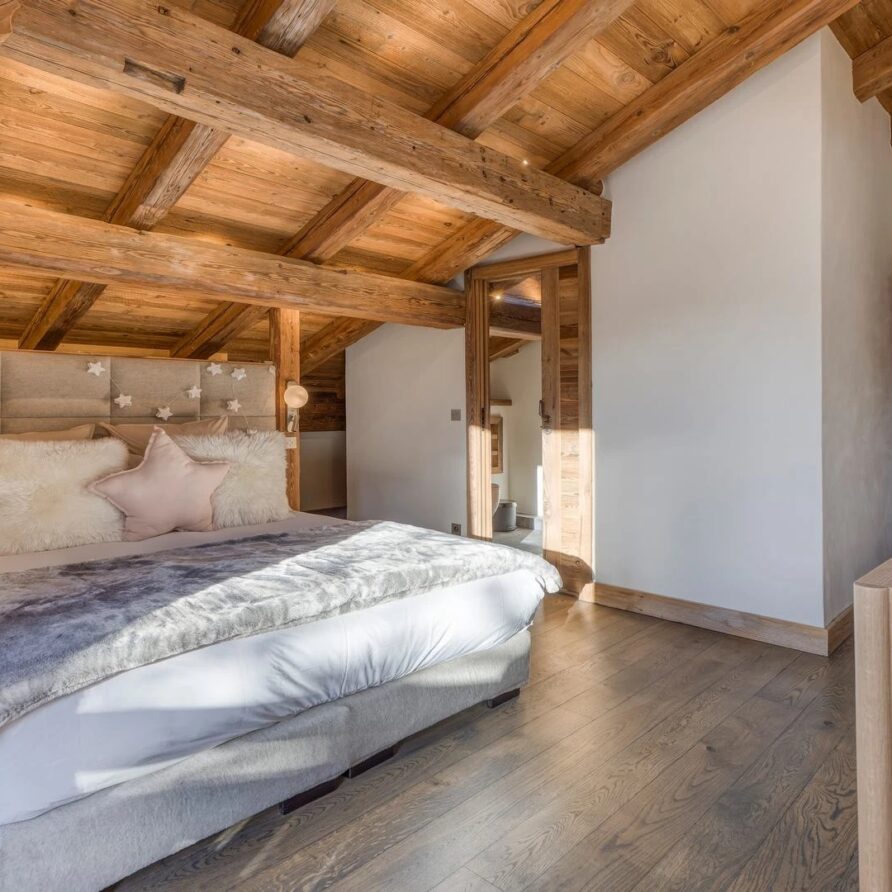 The bedrooms are distributed across all floors within Alpine holiday home, which is 500 square meters in size. The largest, the master suite, lies on the ground floor with private access to the terrace. Two double bedrooms, one with shower room, the other with bathroom and balcony, are on the first floor. Further downstairs, at garden level, there are two more bedrooms, one of which can be used as either a double or twin. Both have attached shower rooms. Finally, the garden level houses the sixth bedroom, the children’s dormitory with three bunk beds and private shower room. Common to most of the bedrooms is the generous use of wood, be it wall paneling or exposed wooden beams.