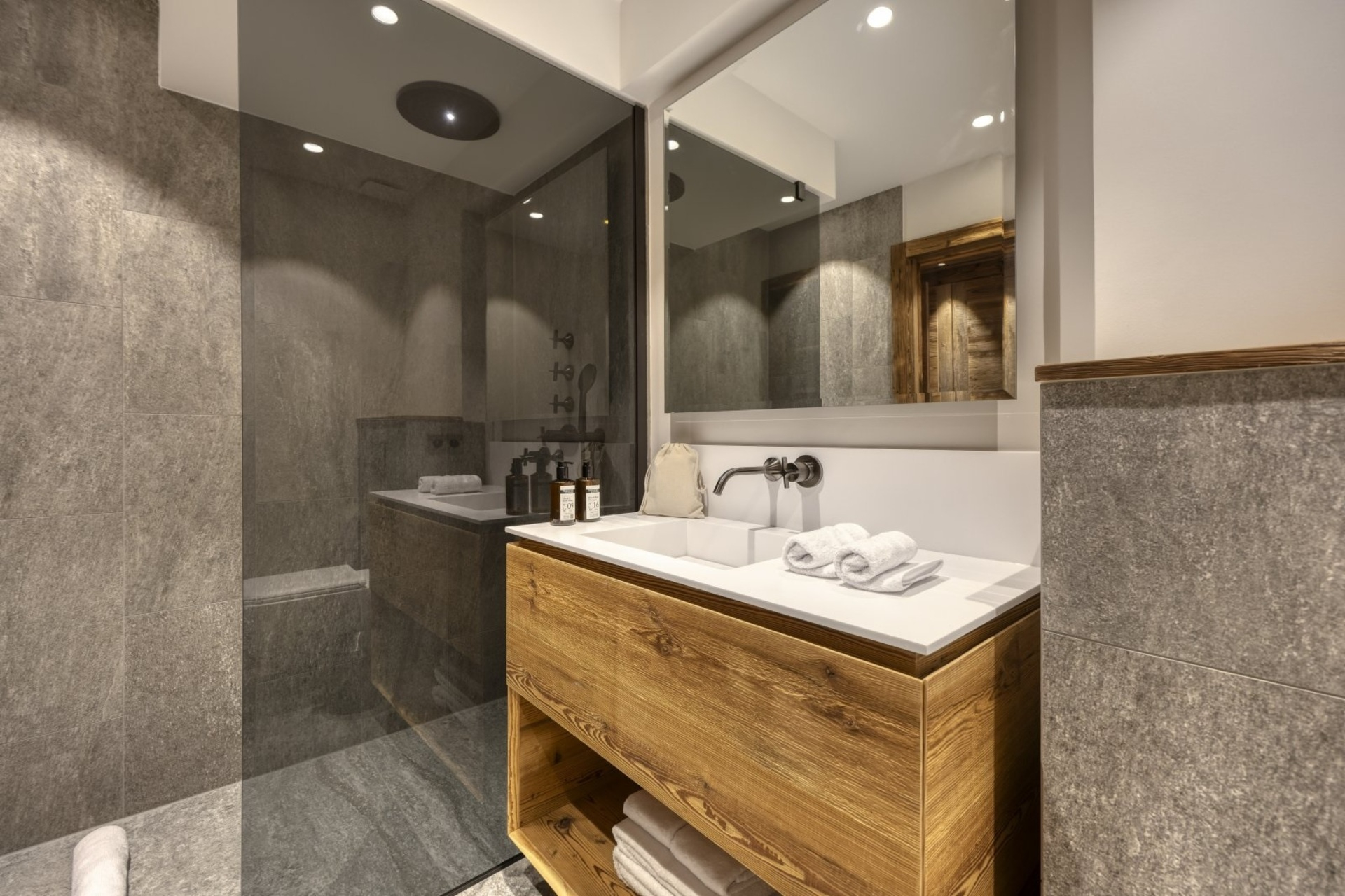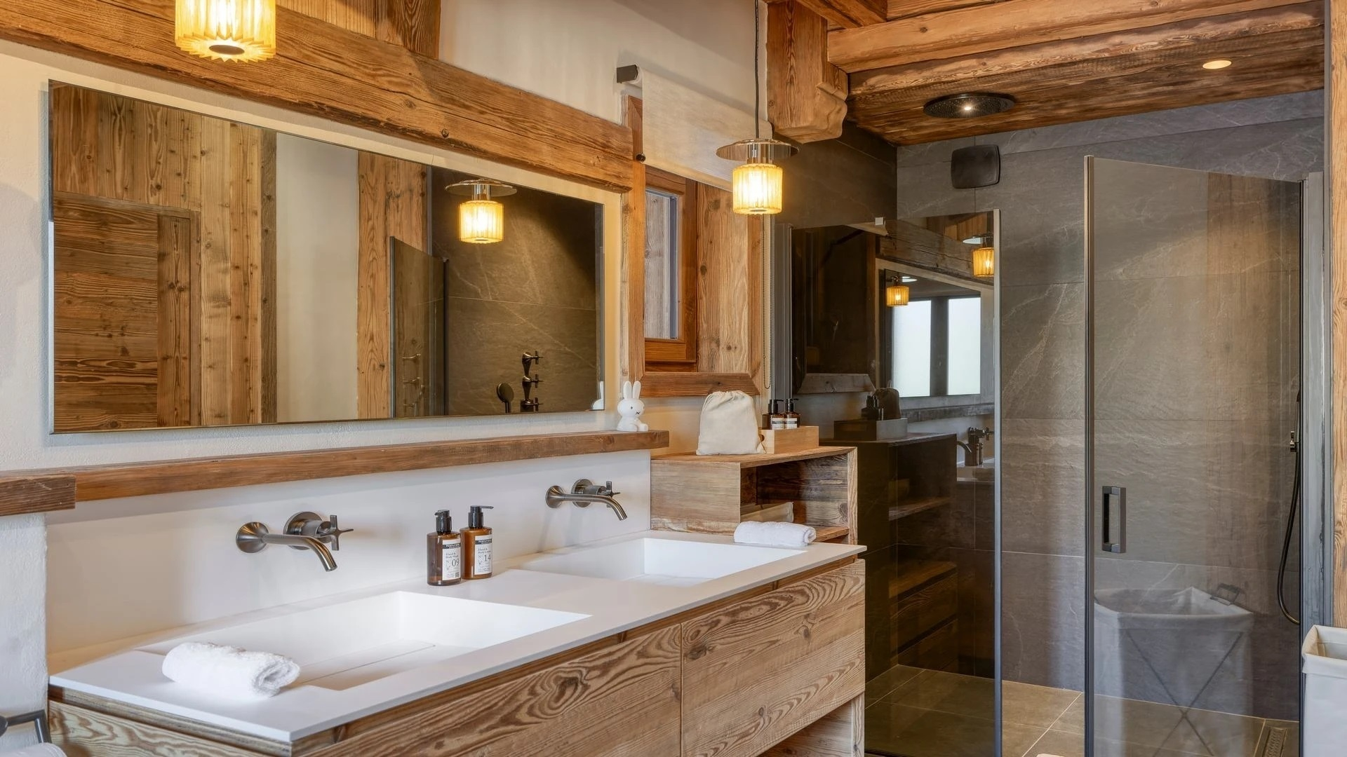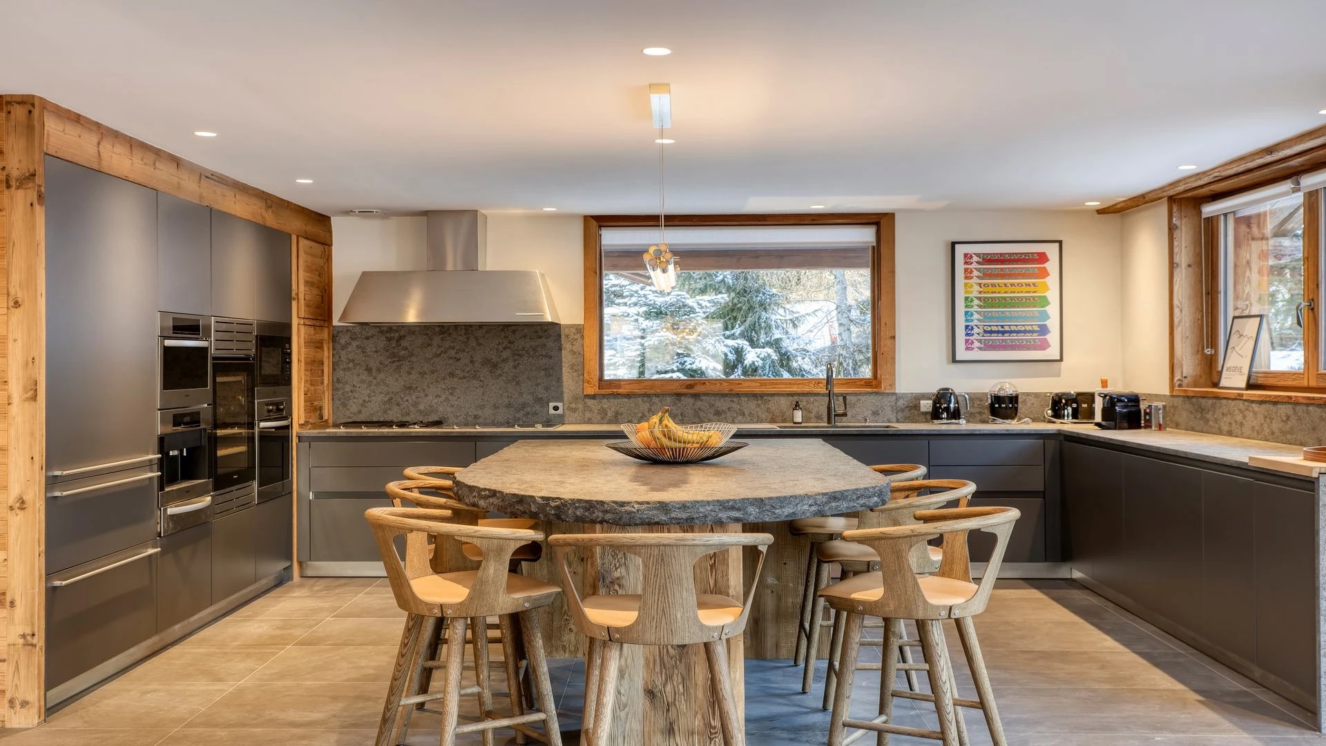 The chalet, which extends over three floors, has a traditional outside construction, typical for this area, with its use of stone and wood, and a surprisingly contemporary design inside. With five en-suites bedrooms and a large dormitory for little ones, holiday chalet can host up to 13 people. The main hub is the open-plan living room on the ground floor with cathedral high ceilings giving a feel of grandeur and spaciousness. Underlining this are a slightly separated intimate sofa corner in soft natural tones with wooden, rustic side table, leather armchairs scattered around, a large L-shaped couch and a massive wooden staircase leading to a mezzanine. Its centerpiece is the wood-burning fireplace, which reaches up to the exposed wooden beams and divides the generous space. Like the entire ski lodge, with the exception of the kitchen and bathrooms, the room has wooden flooring.