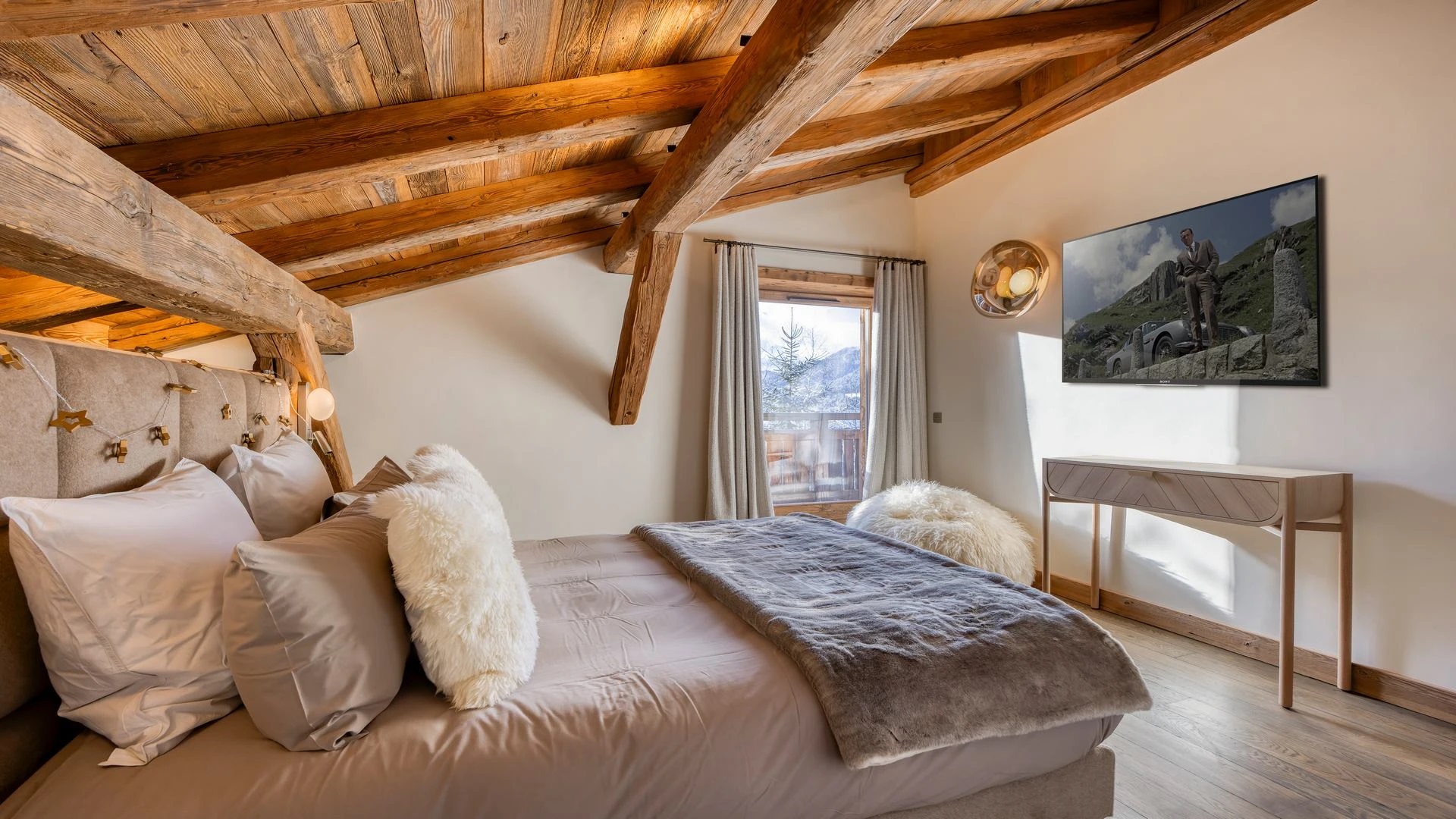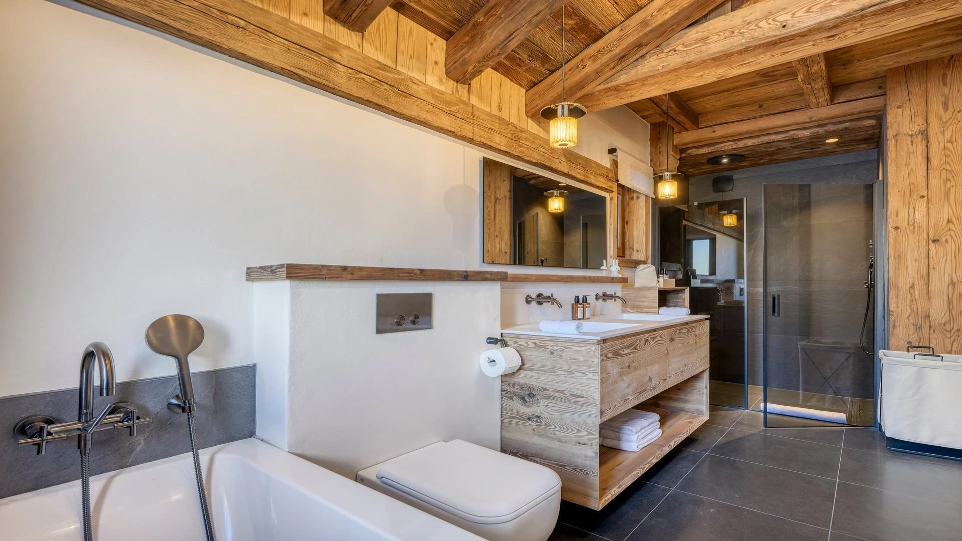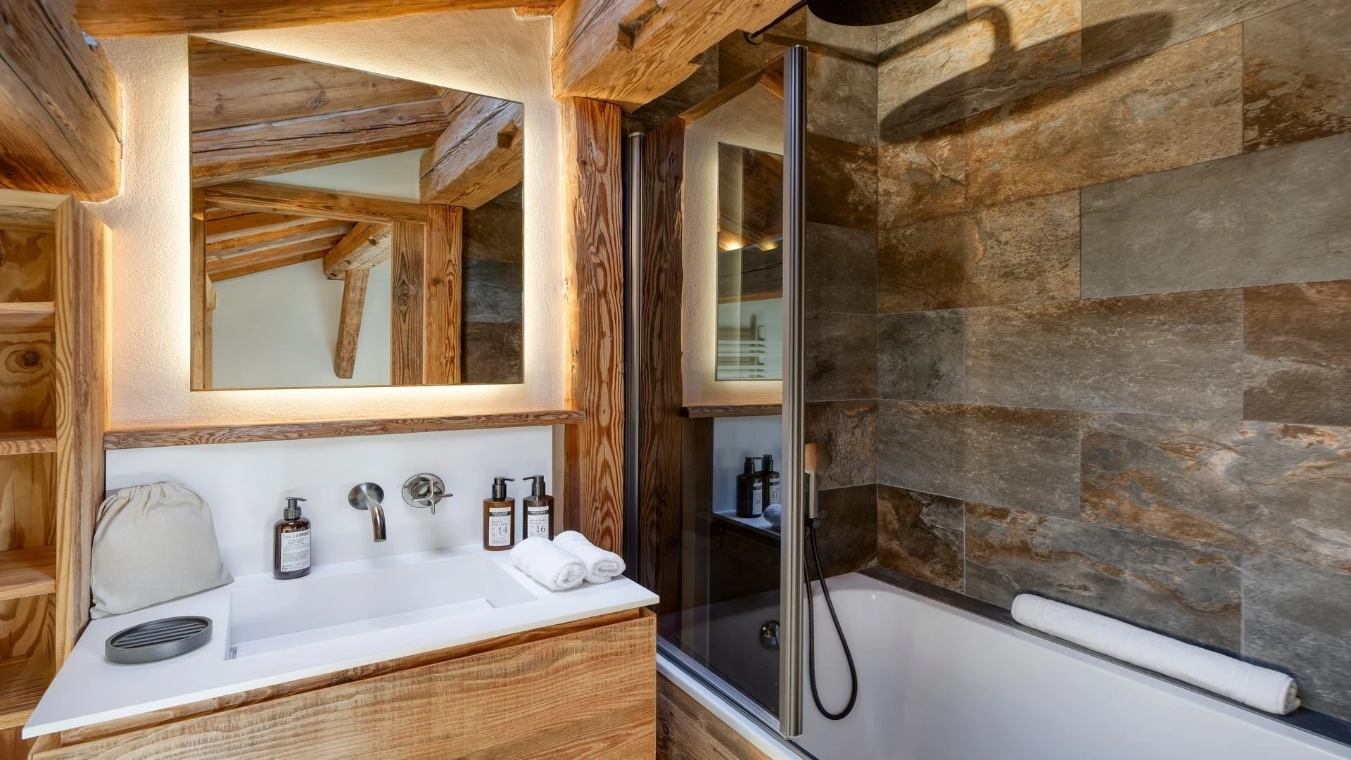 The chalet, which extends over three floors, has a traditional outside construction, typical for this area, with its use of stone and wood, and a surprisingly contemporary design inside. With five en-suites bedrooms and a large dormitory for little ones, holiday chalet can host up to 13 people. The main hub is the open-plan living room on the ground floor with cathedral high ceilings giving a feel of grandeur and spaciousness. Underlining this are a slightly separated intimate sofa corner in soft natural tones with wooden, rustic side table, leather armchairs scattered around, a large L-shaped couch and a massive wooden staircase leading to a mezzanine. Its centerpiece is the wood-burning fireplace, which reaches up to the exposed wooden beams and divides the generous space. Like the entire ski lodge, with the exception of the kitchen and bathrooms, the room has wooden flooring.
