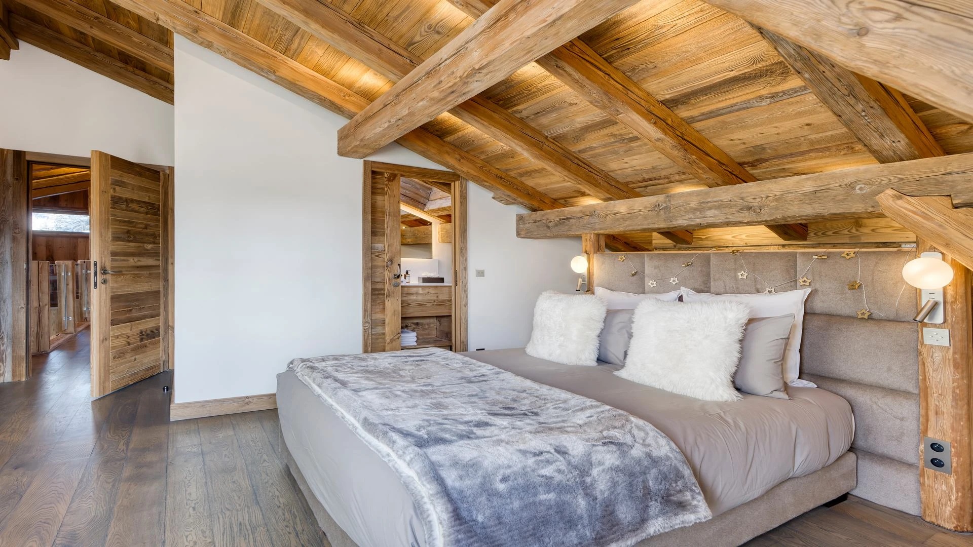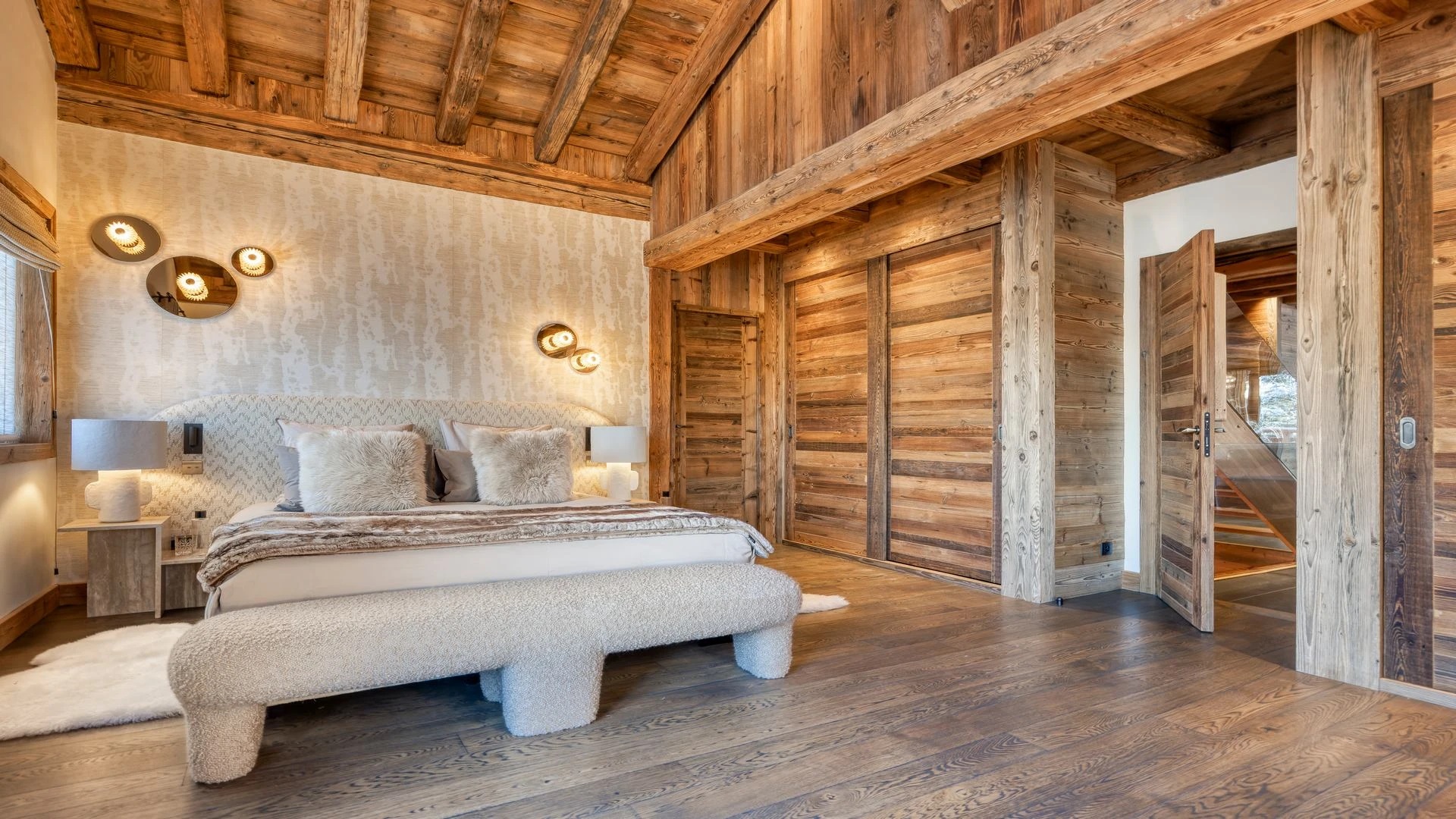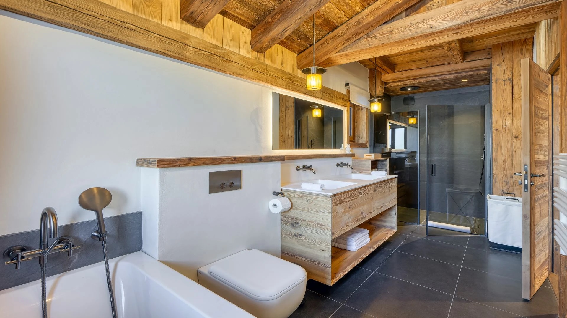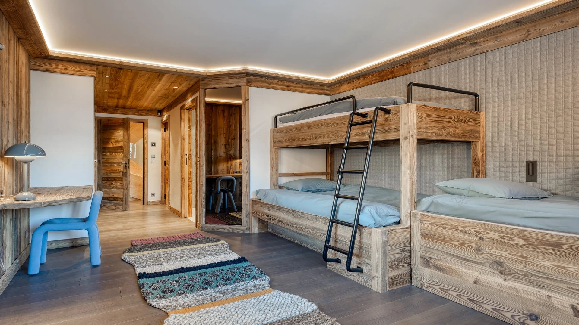 The bedrooms are distributed across all floors within Alpine holiday home, which is 500 square meters in size. The largest, the master suite, lies on the ground floor with private access to the terrace. Two double bedrooms, one with shower room, the other with bathroom and balcony, are on the first floor. Further downstairs, at garden level, there are two more bedrooms, one of which can be used as either a double or twin. Both have attached shower rooms. Finally, the garden level houses the sixth bedroom, the children’s dormitory with three bunk beds and private shower room. Common to most of the bedrooms is the generous use of wood, be it wall paneling or exposed wooden beams.