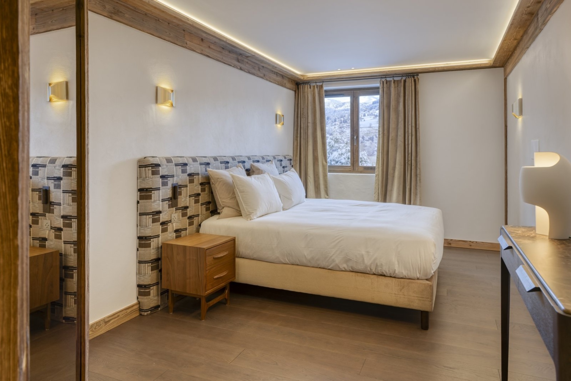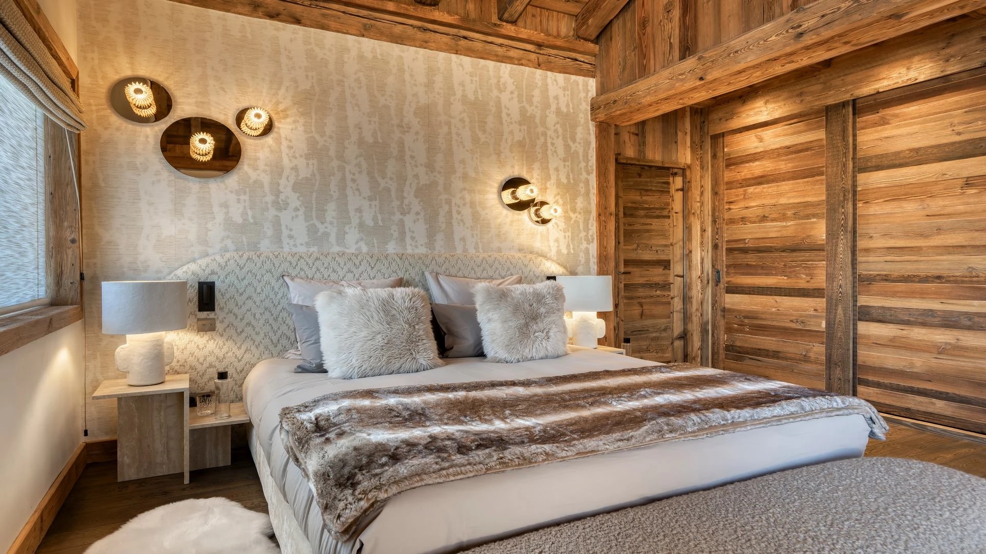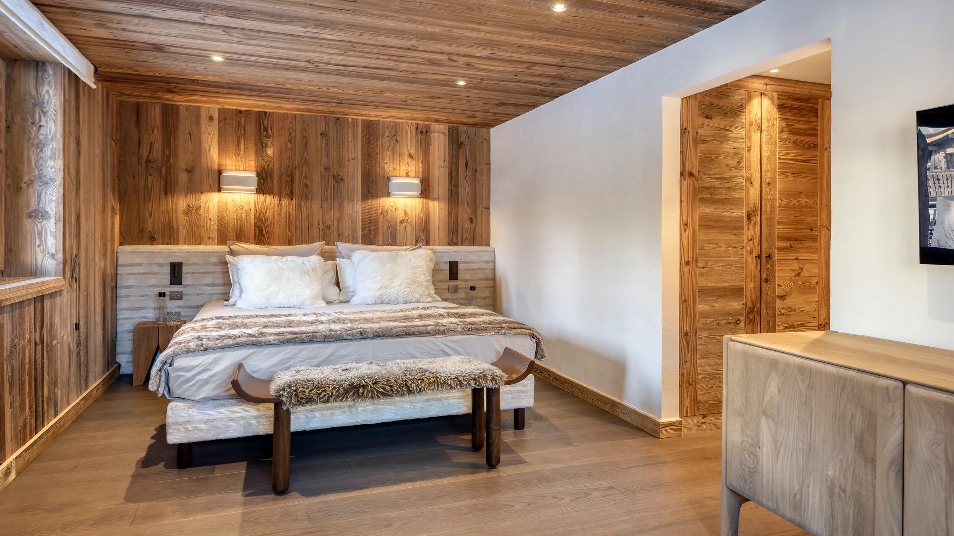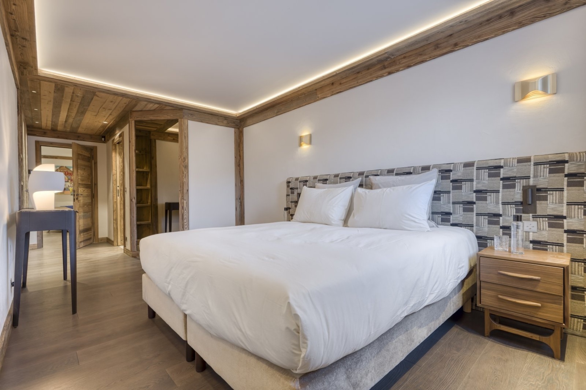 The bedrooms are distributed across all floors within Alpine holiday home, which is 500 square meters in size. The largest, the master suite, lies on the ground floor with private access to the terrace. Two double bedrooms, one with shower room, the other with bathroom and balcony, are on the first floor. Further downstairs, at garden level, there are two more bedrooms, one of which can be used as either a double or twin. Both have attached shower rooms. Finally, the garden level houses the sixth bedroom, the children’s dormitory with three bunk beds and private shower room. Common to most of the bedrooms is the generous use of wood, be it wall paneling or exposed wooden beams.