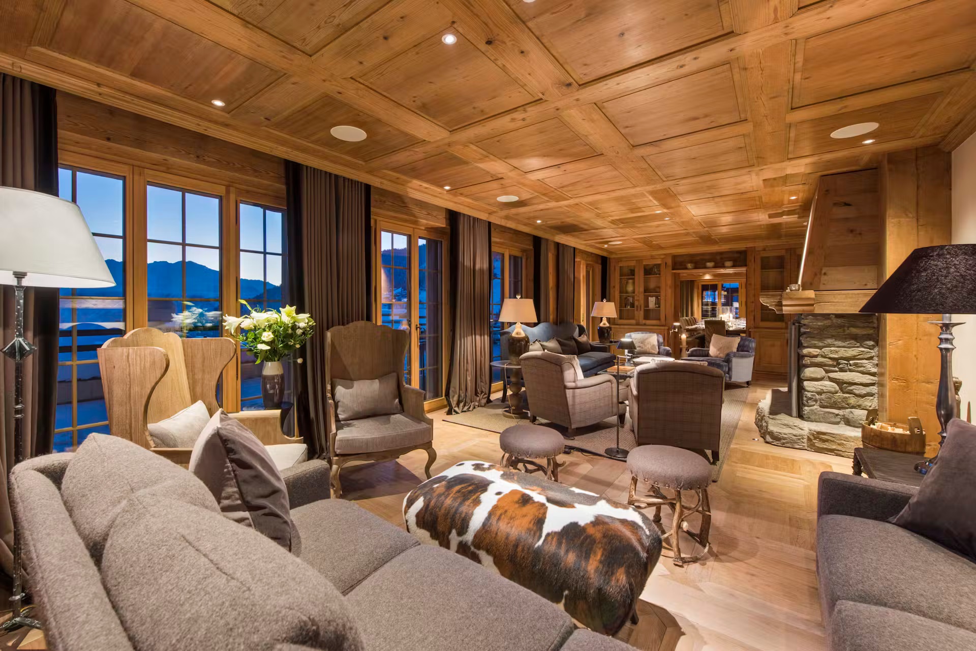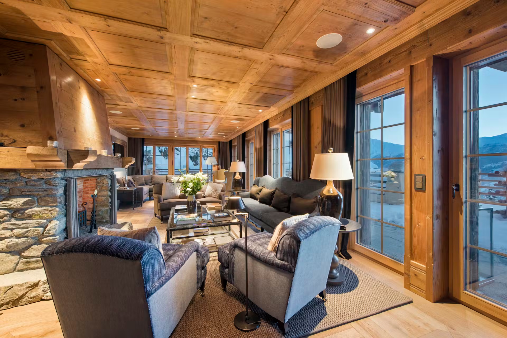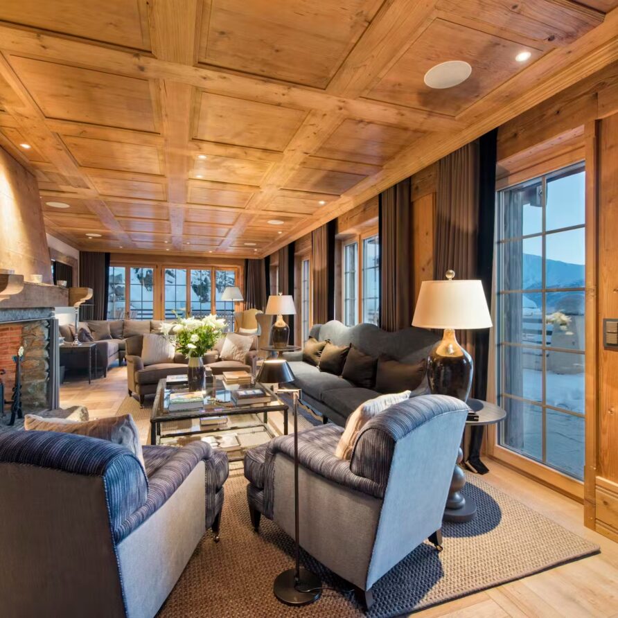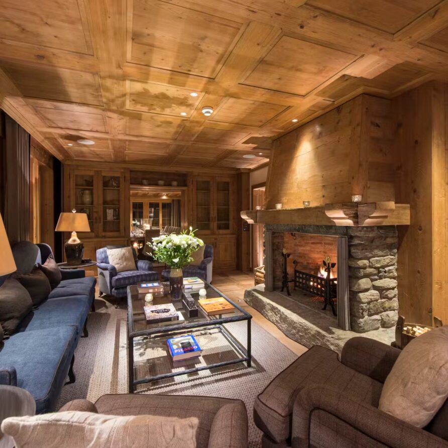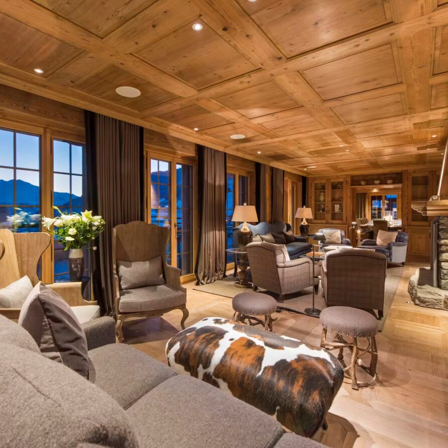 Found on the first floor of the chalet, you will find two cozy, elegant sitting rooms. Perhaps most reminiscent of a country manor house, with some more alpine features to one of them, these rooms provide ample comfortable, designer furniture to gather around the open stone fireplaces. A formal dining room offers a sophisticated space for gourmet dining. These living and dining spaces are surrounded by windows that offer picture postcard views towards the stunning mountain vistas. To further enjoy the incredible views, on warmer spring evenings or crisp bluebird days, head outside to the expansive sun terrace.