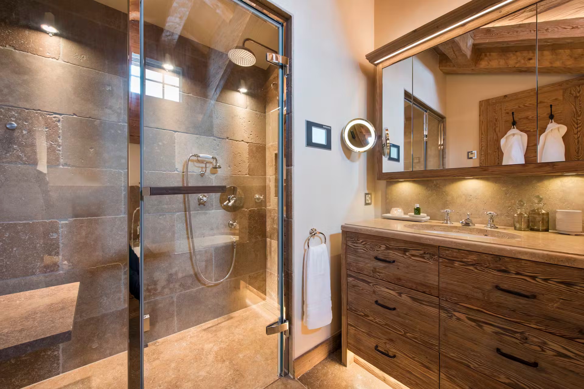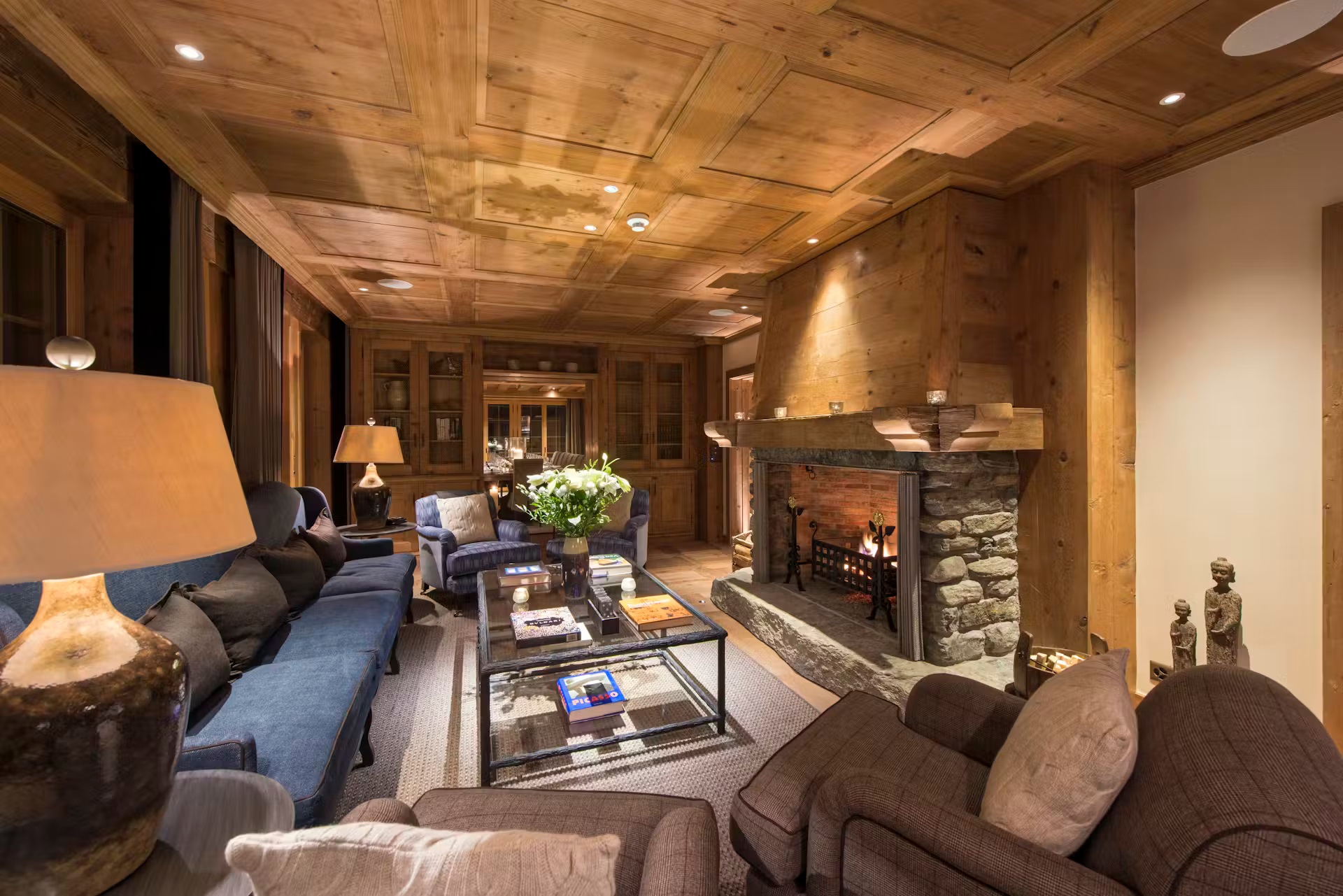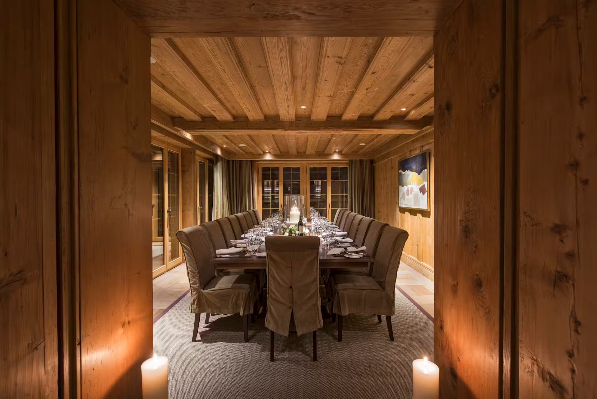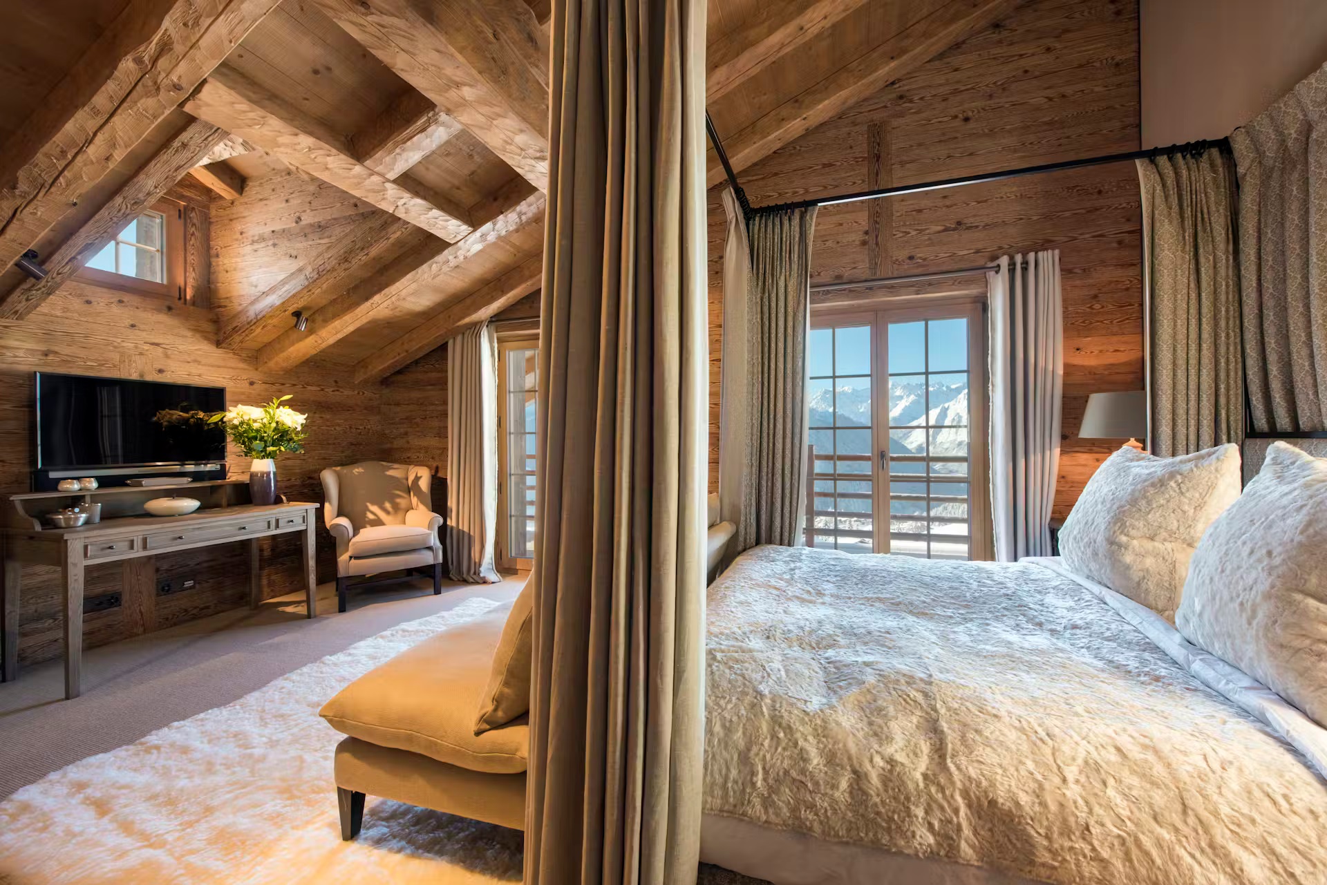 Found on the first floor of the chalet, you will find two cozy, elegant sitting rooms. Perhaps most reminiscent of a country manor house, with some more alpine features to one of them, these rooms provide ample comfortable, designer furniture to gather around the open stone fireplaces. A formal dining room offers a sophisticated space for gourmet dining. These living and dining spaces are surrounded by windows that offer picture postcard views towards the stunning mountain vistas. To further enjoy the incredible views, on warmer spring evenings or crisp bluebird days, head outside to the expansive sun terrace.