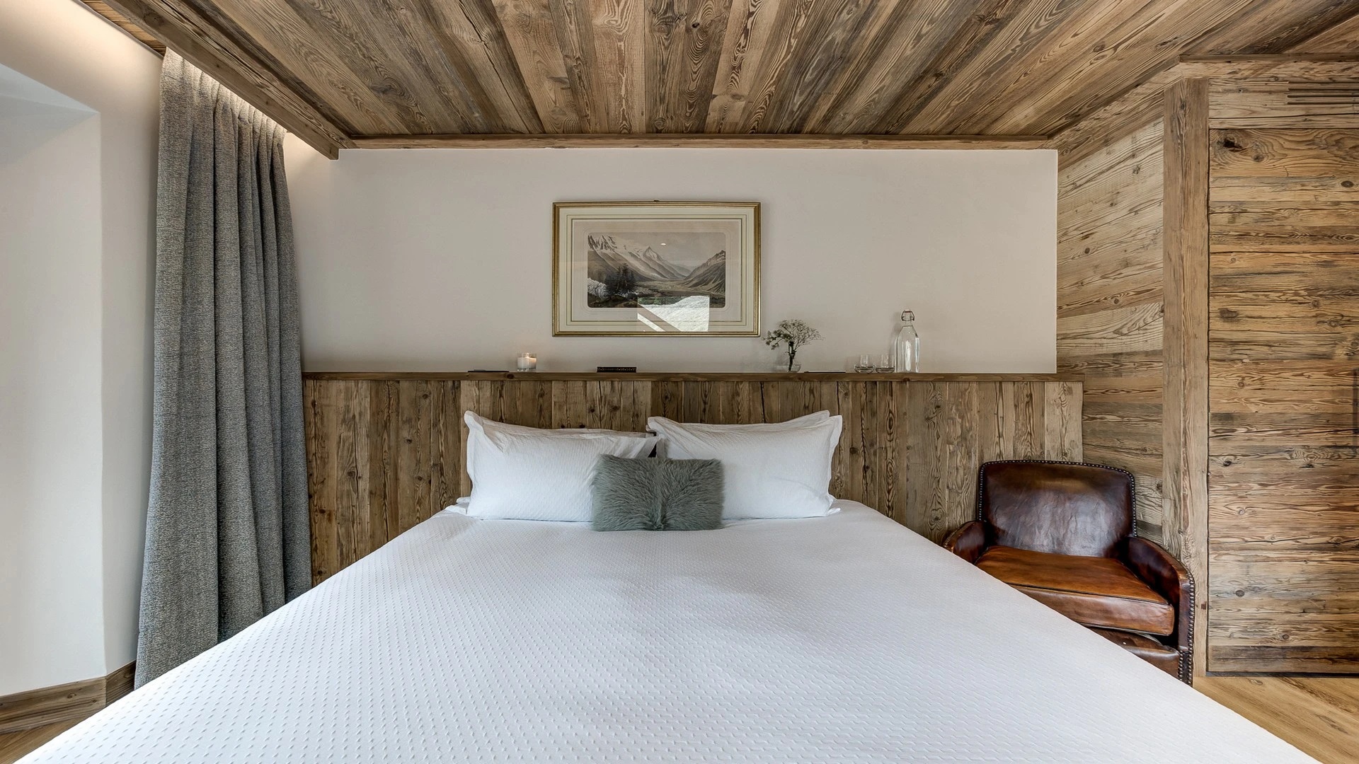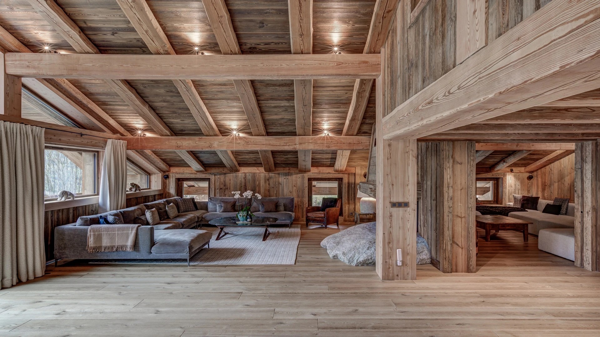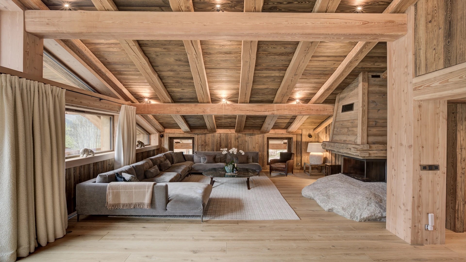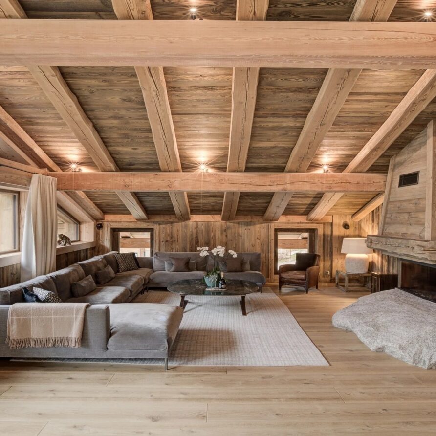 Nestled atop a picturesque vista the chalet extends a warm welcome into a sanctuary of luxury and comfort. Upon entering the top floor, holiday guests are greeted by an expansive open-plan living area adorned with a magnificent fireplace, serving as the heart of the room’s charm. A soft, grey U-shaped sofa, inviting guests to sink into relaxation after a day on the slopes.