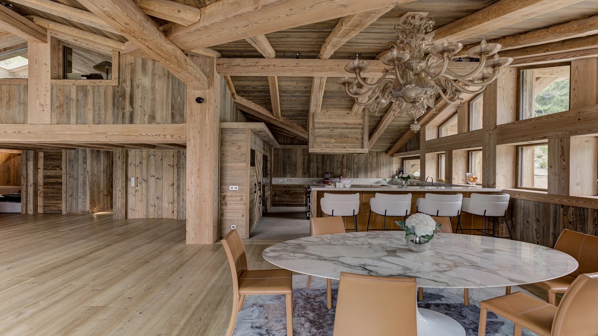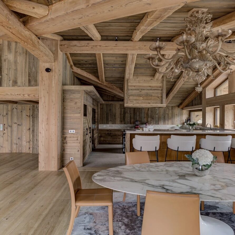 Blending contemporary elegance with alpine allure, the ambiance is one of seamless sophistication. It’s the perfect setting to gather and unwind in the crackling warmth of the fire while indulging in a steaming cup of coffee paired with delectable cake or a savory snack alongside a chilled wine or beer. The living space seamlessly transitions into a dining area, boasting a beautiful marble-topped table surrounded by modern chairs – a stage for convivial gatherings, whether it’s a leisurely breakfast or a sumptuous dinner shared with loved ones.