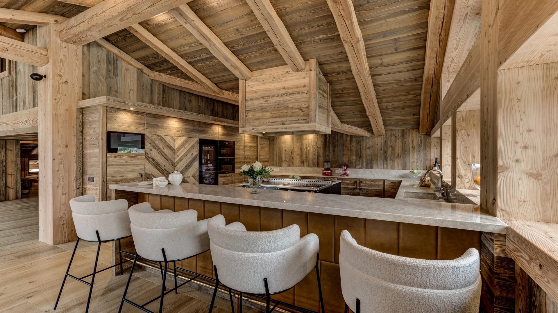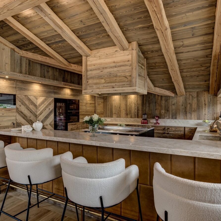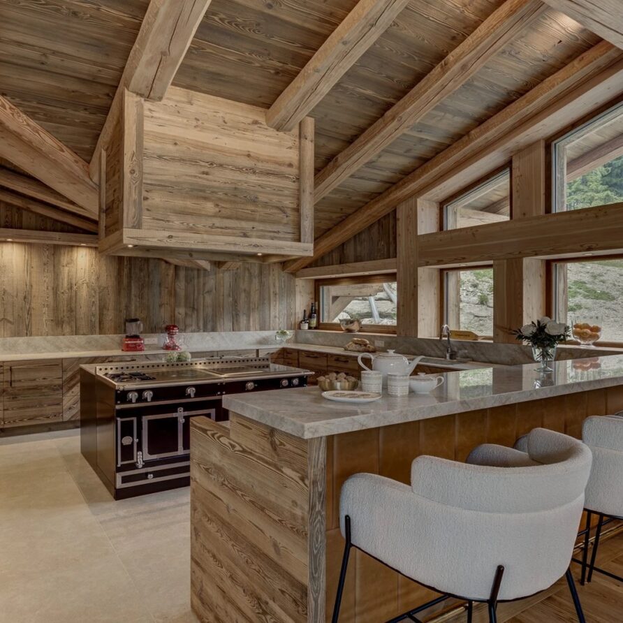 The open kitchen, adorned with high-quality appliances, serves as a focal point of culinary creativity. A sleek kitchen bar, accompanied by inviting bar stools, provides a cozy spot for onlookers to observe the culinary magic unfold, all while delectable aromas waft through the air. Whether you opt for self-catering or book the family chalet catered, this inviting space promises unforgettable culinary experiences and cherished moments.