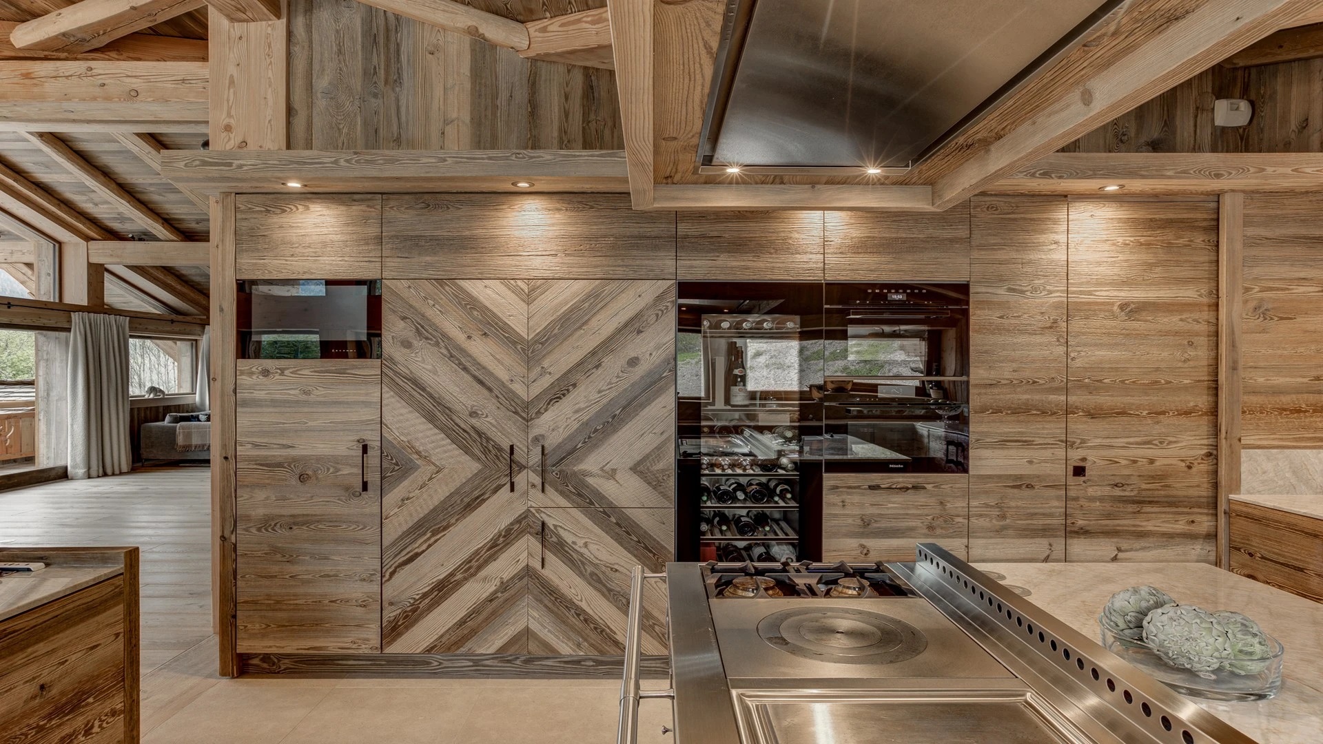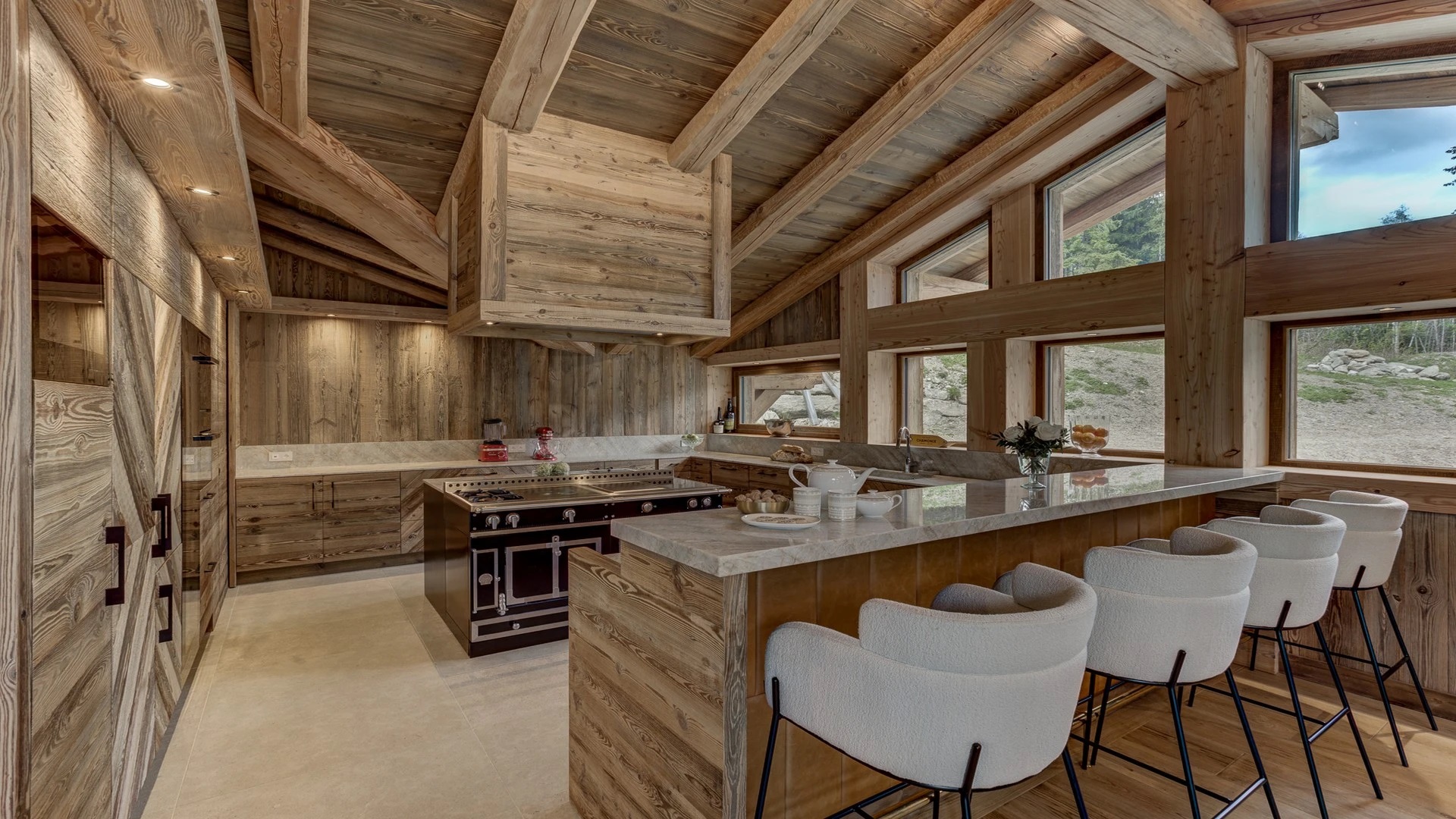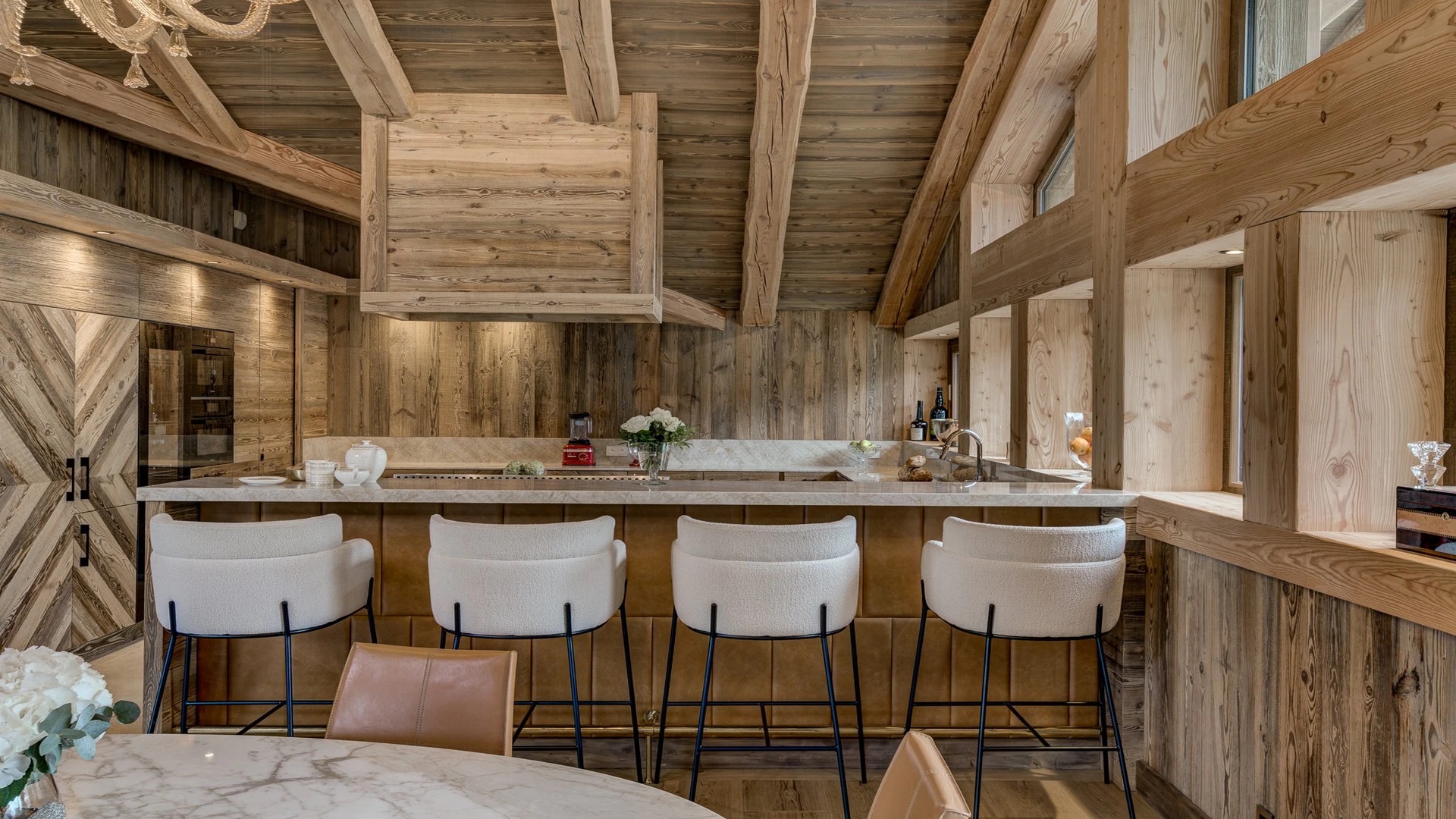 The open kitchen, adorned with high-quality appliances, serves as a focal point of culinary creativity. A sleek kitchen bar, accompanied by inviting bar stools, provides a cozy spot for onlookers to observe the culinary magic unfold, all while delectable aromas waft through the air. Whether you opt for self-catering or book the family chalet catered, this inviting space promises unforgettable culinary experiences and cherished moments.