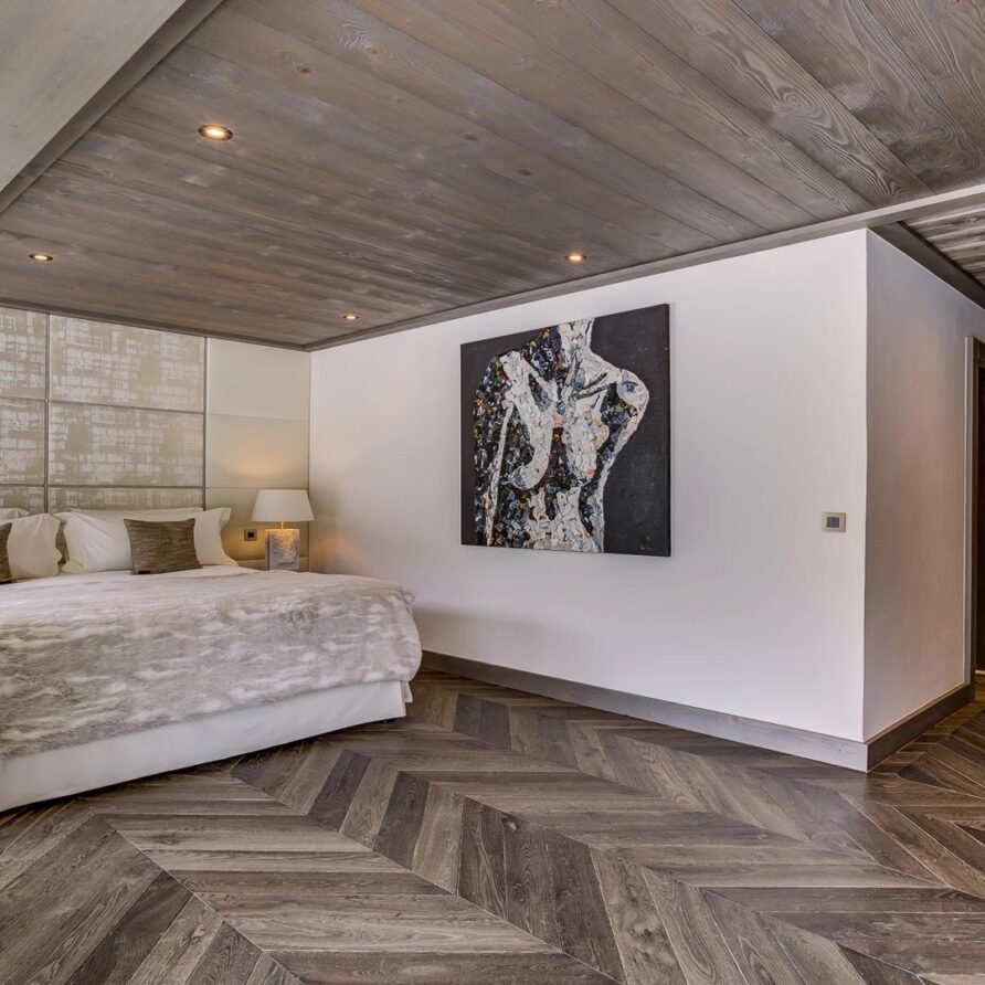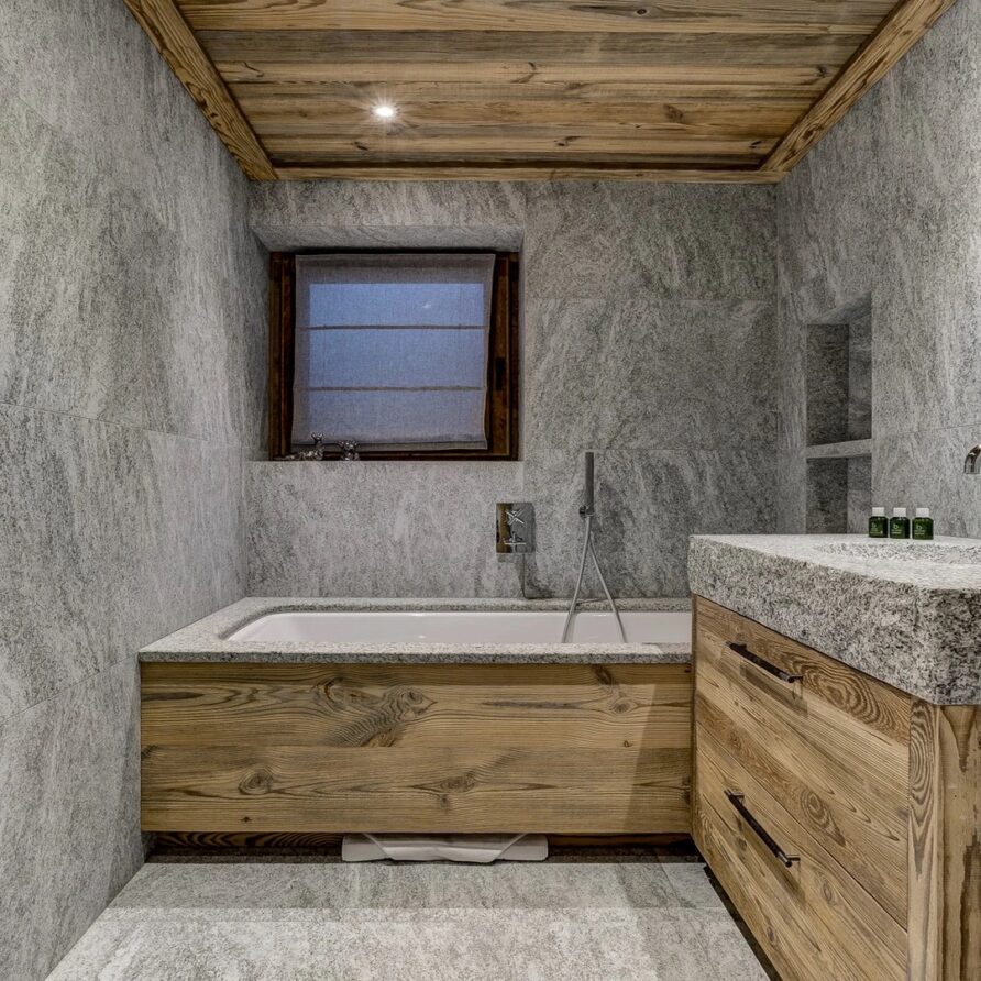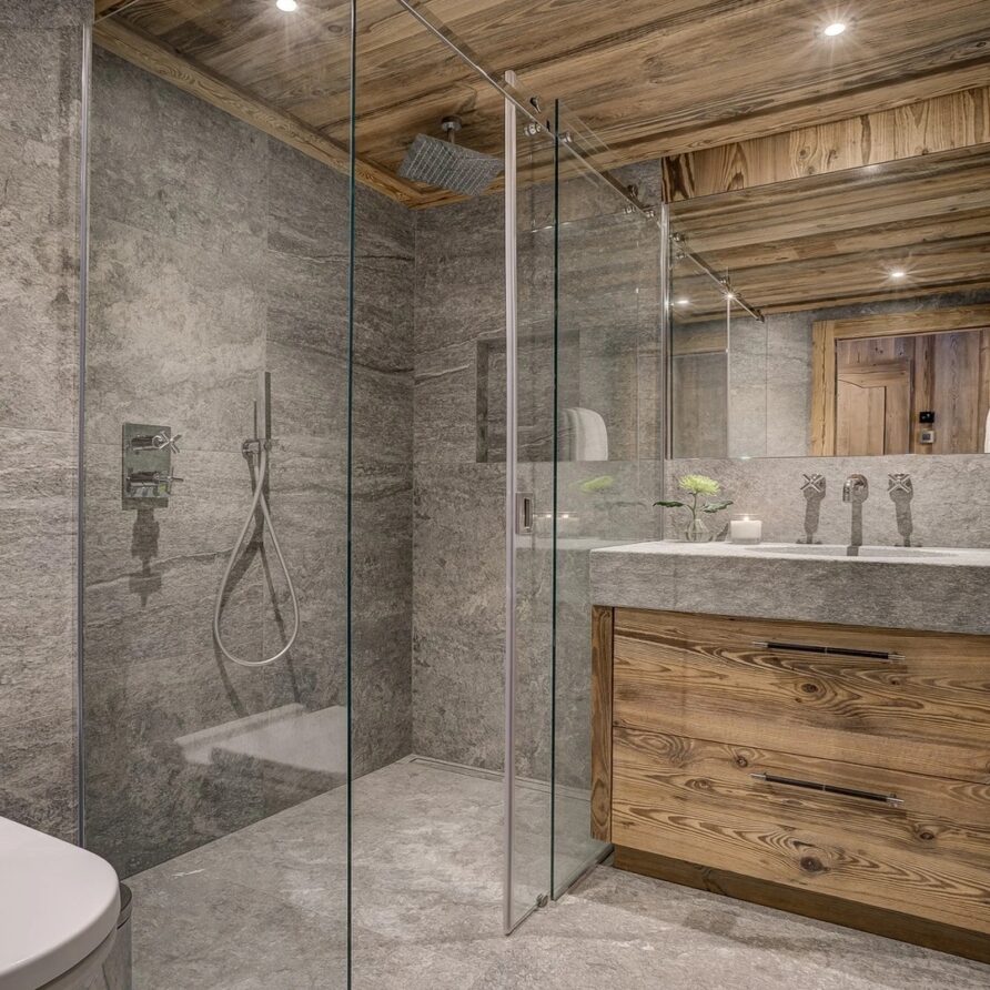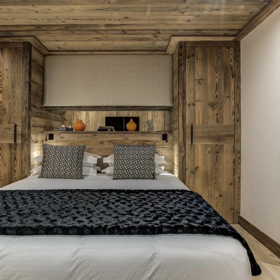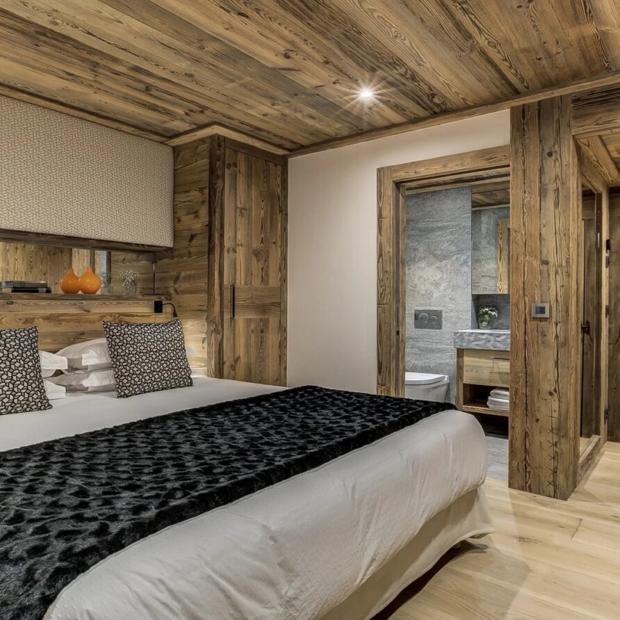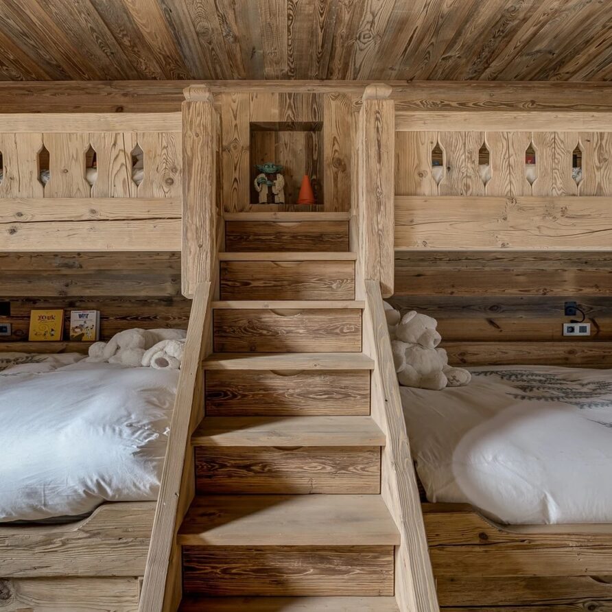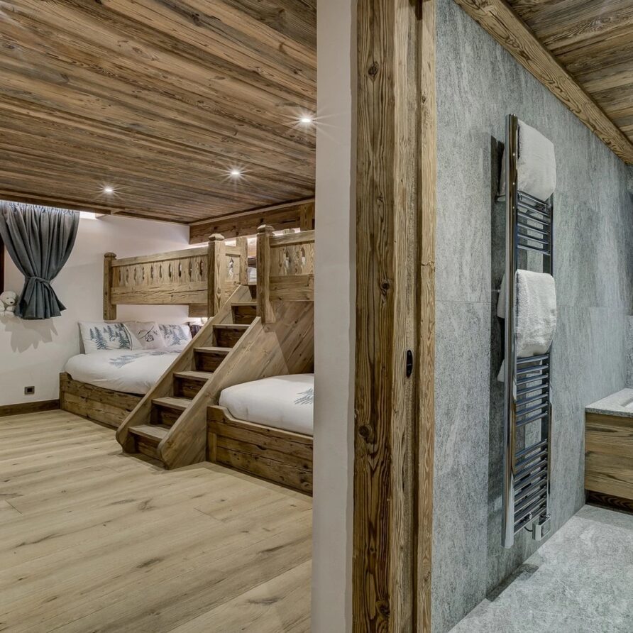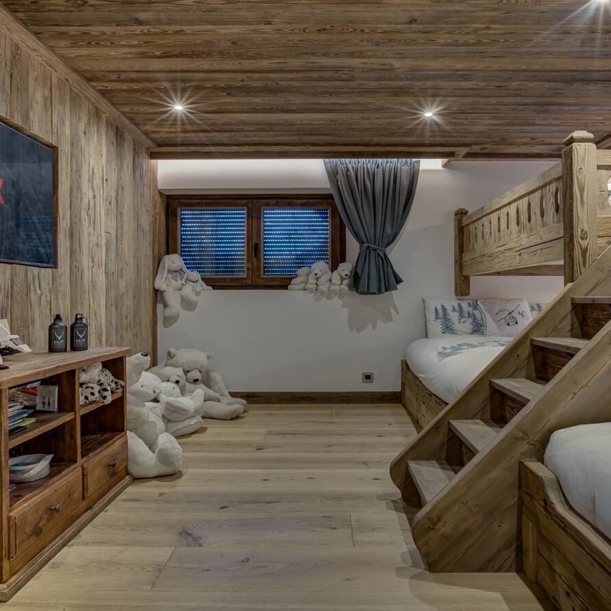 Sleeping quarters span both floors, offering a haven of tranquillity. The master Suite boasts a lavish marble en-suite bathroom, while four double bedrooms each feature en-suite facilities, exuding alpine charm with a modern twist. A children’s bunk bedroom accommodating up to six guests with its cozy ambiance and en-suite convenience.