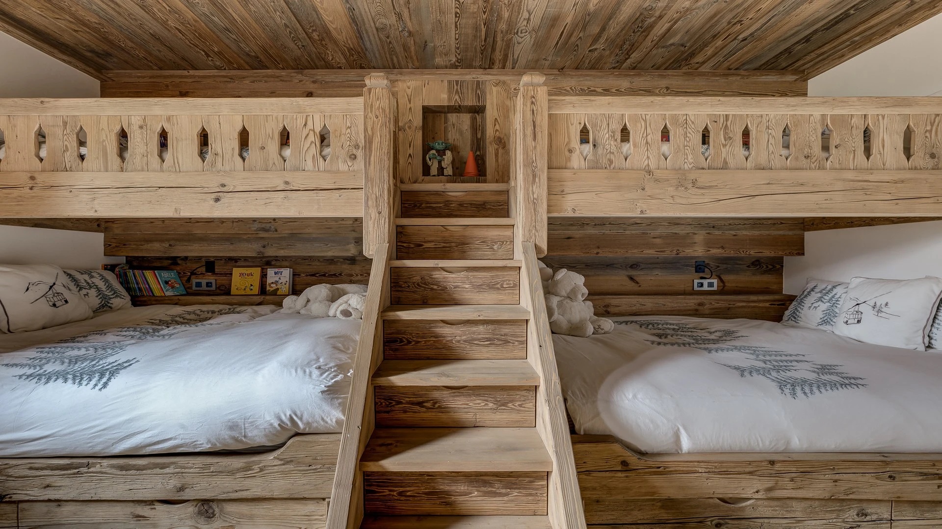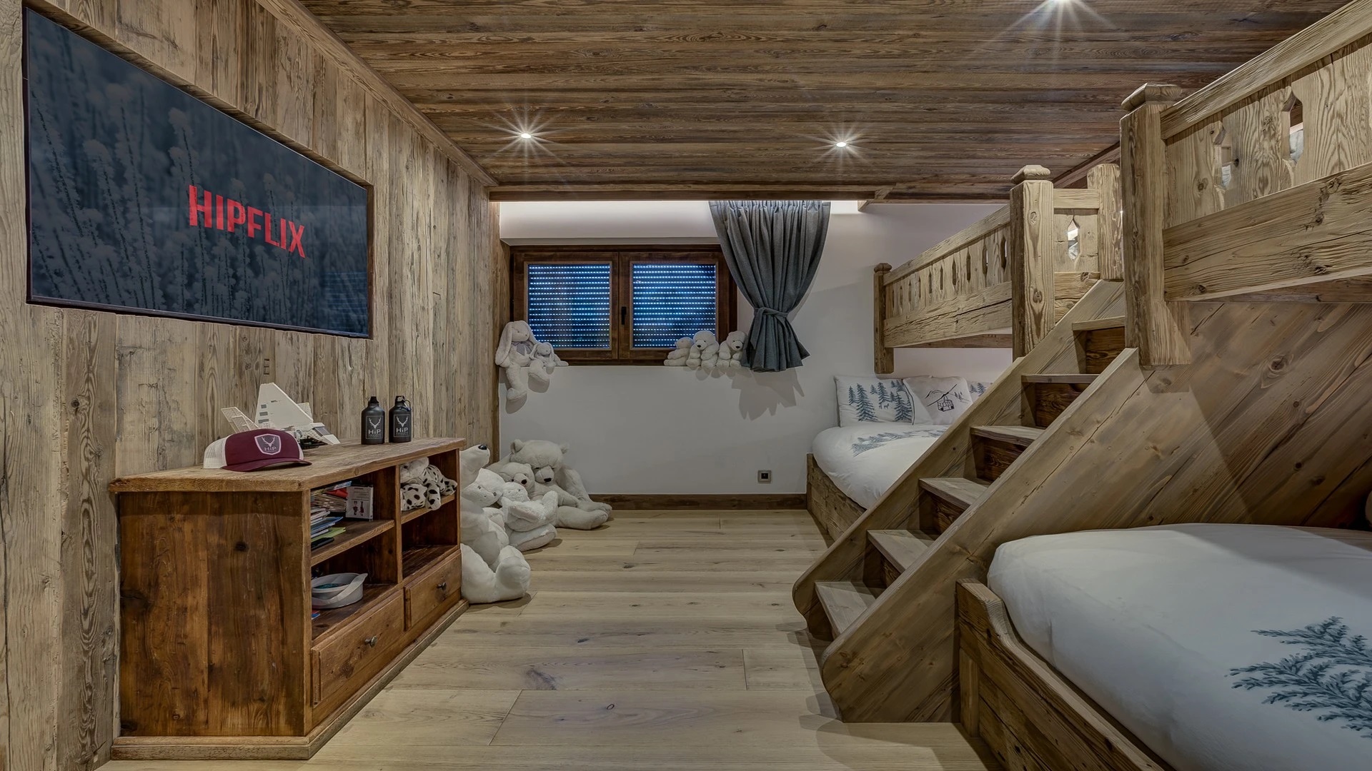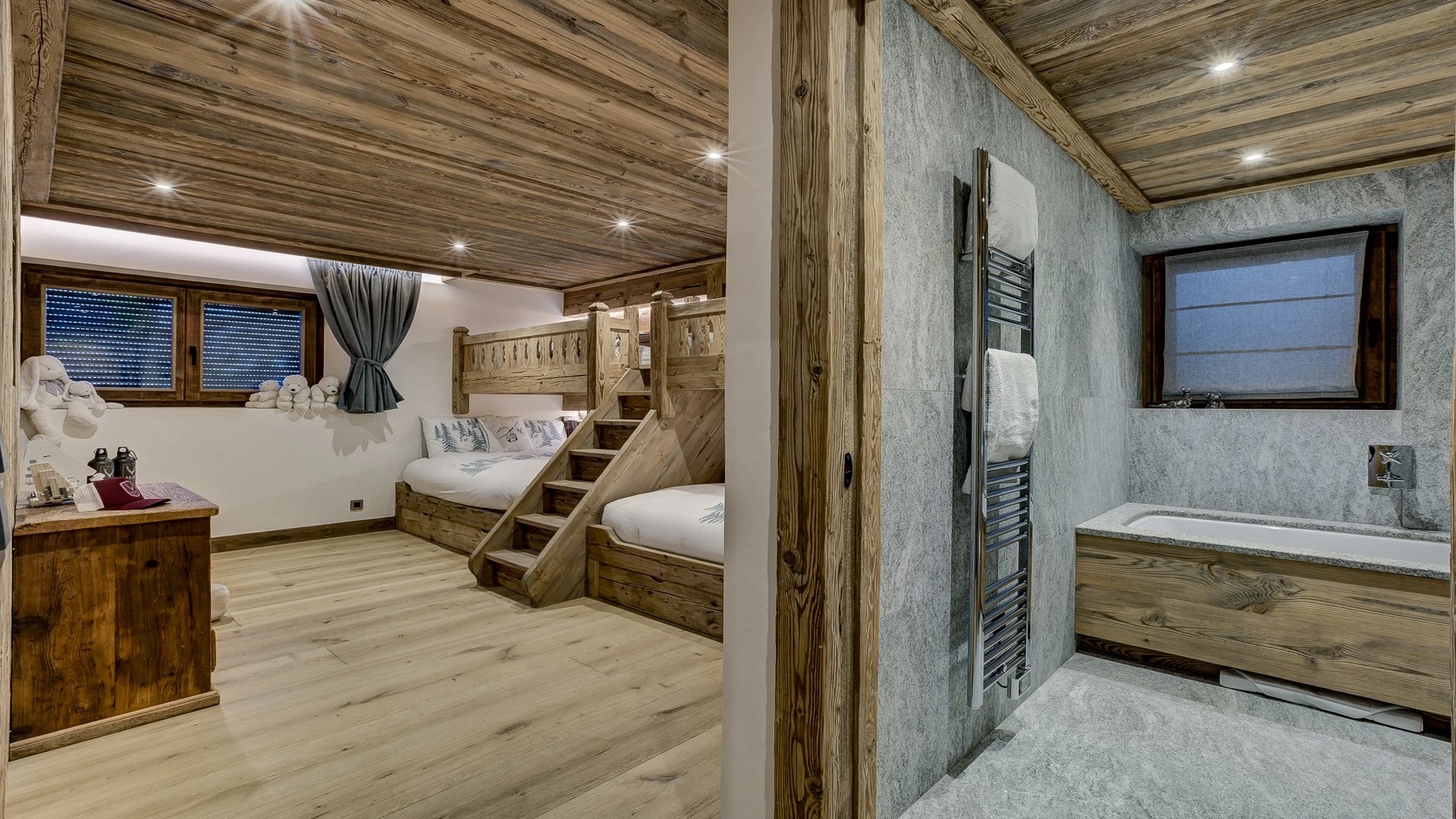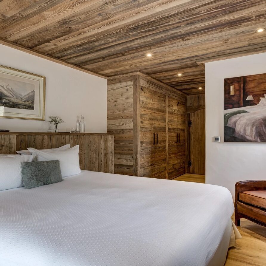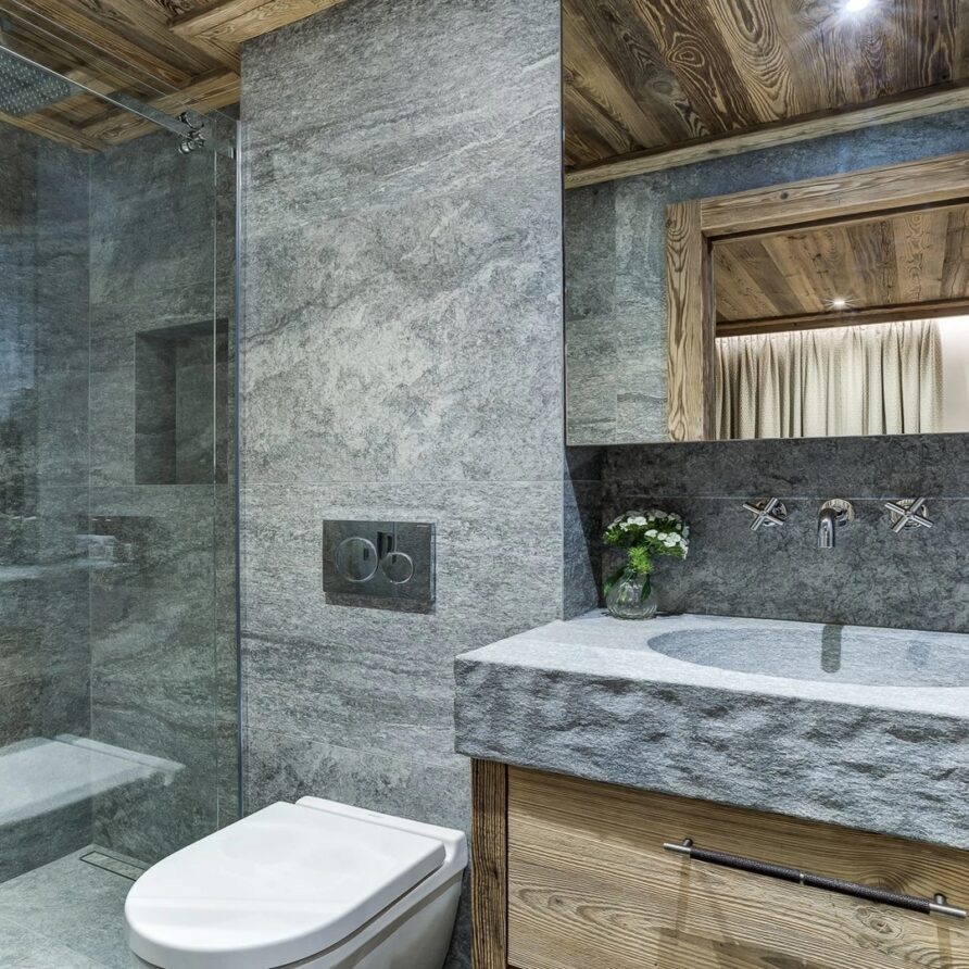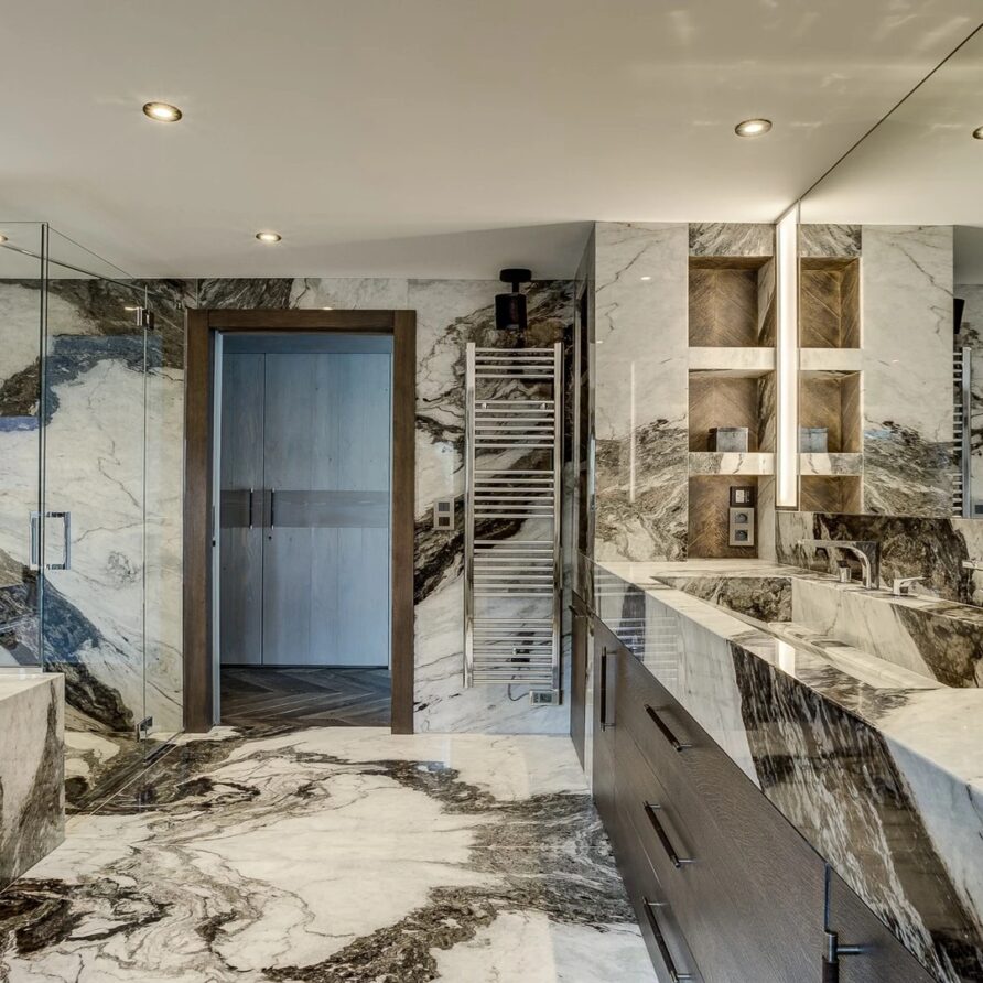 Sleeping quarters span both floors, offering a haven of tranquillity. The master Suite boasts a lavish marble en-suite bathroom, while four double bedrooms each feature en-suite facilities, exuding alpine charm with a modern twist. A children’s bunk bedroom accommodating up to six guests with its cozy ambiance and en-suite convenience.