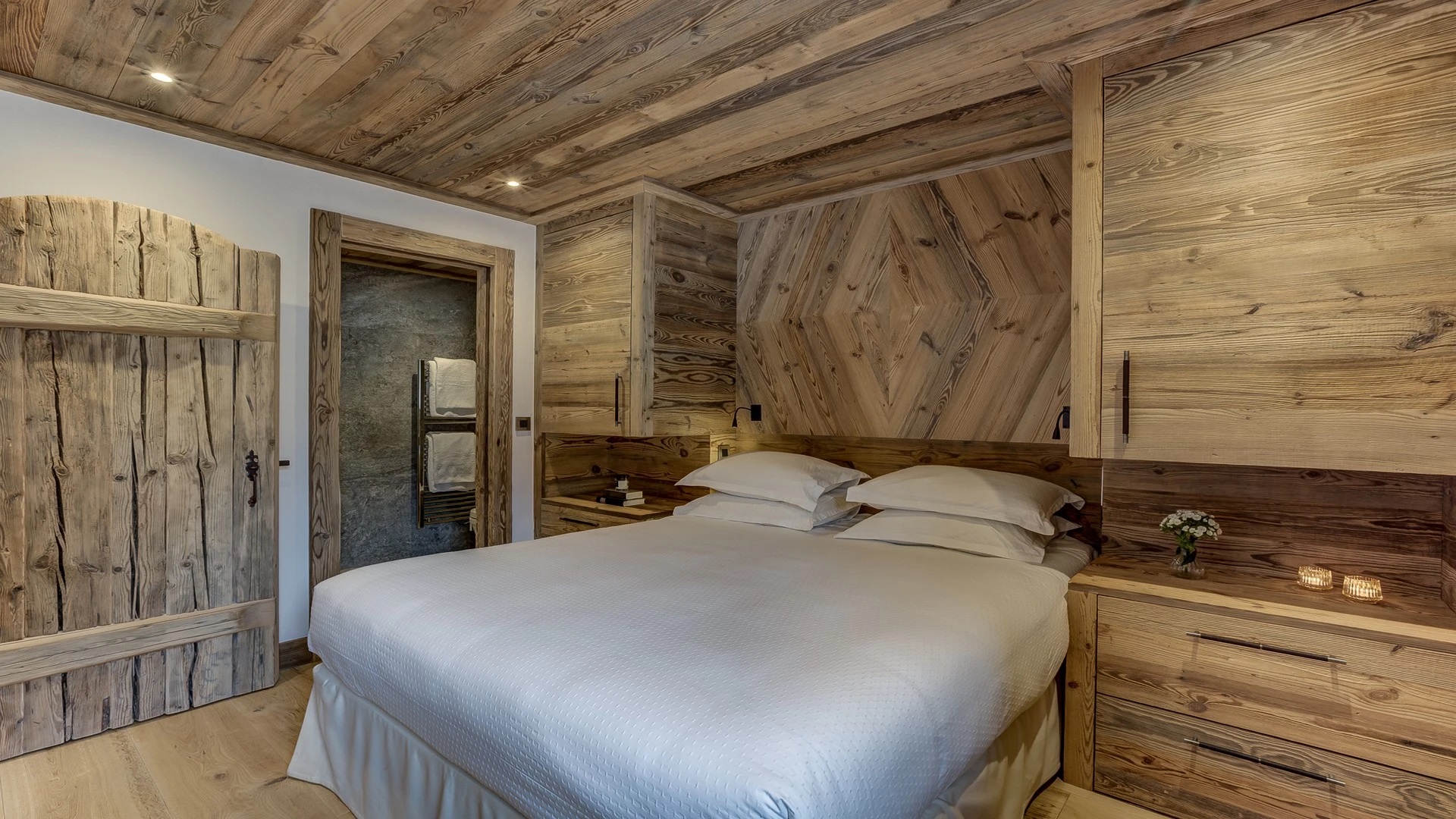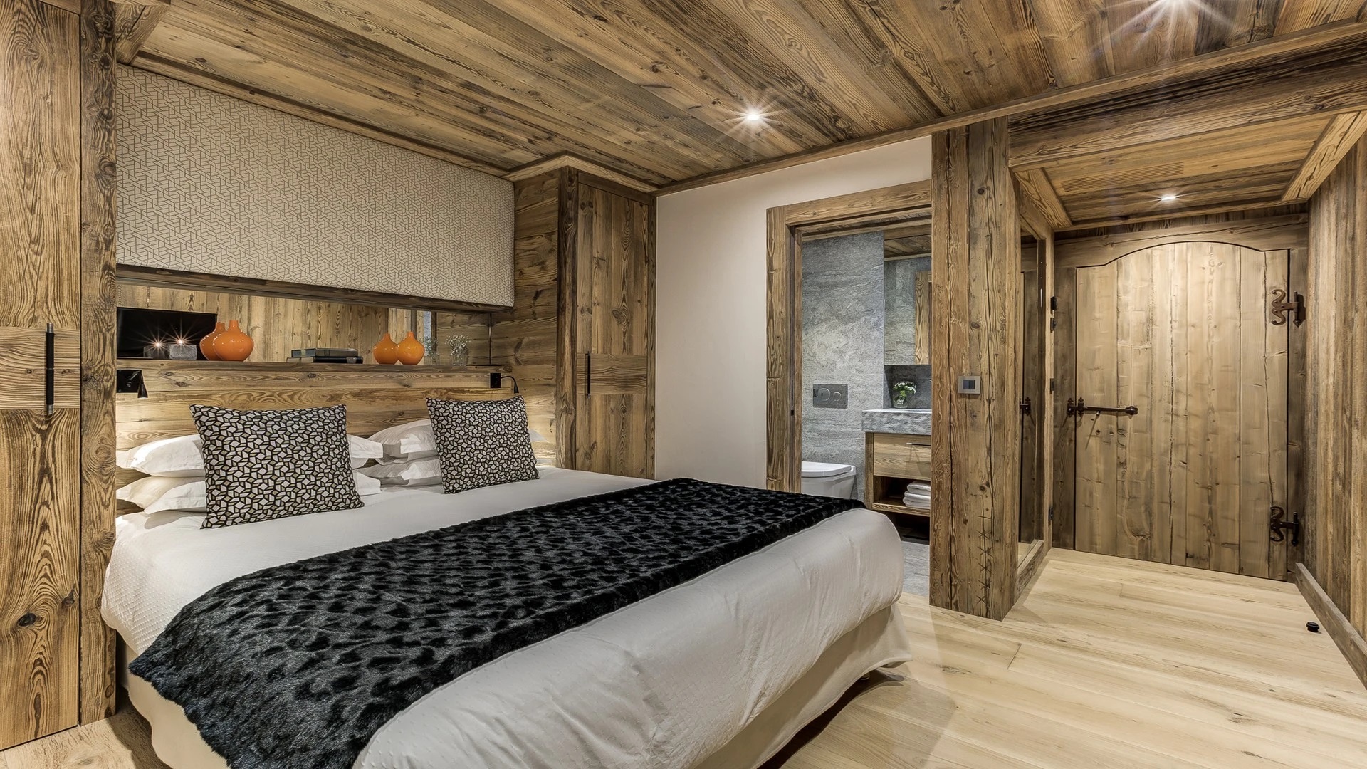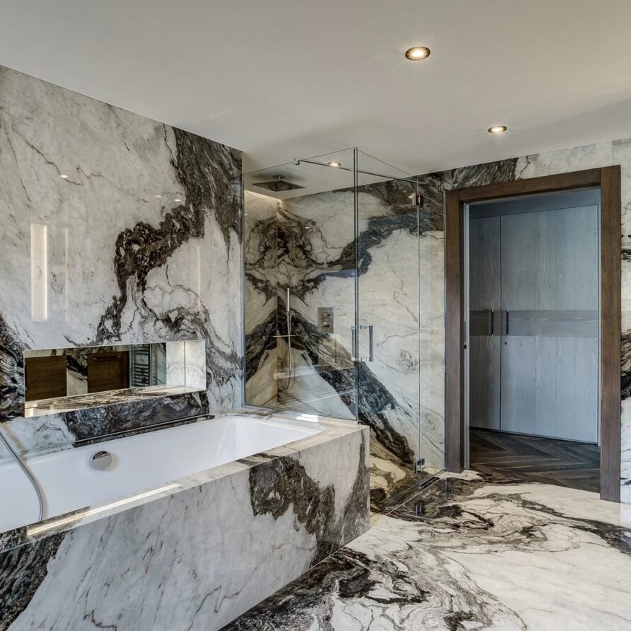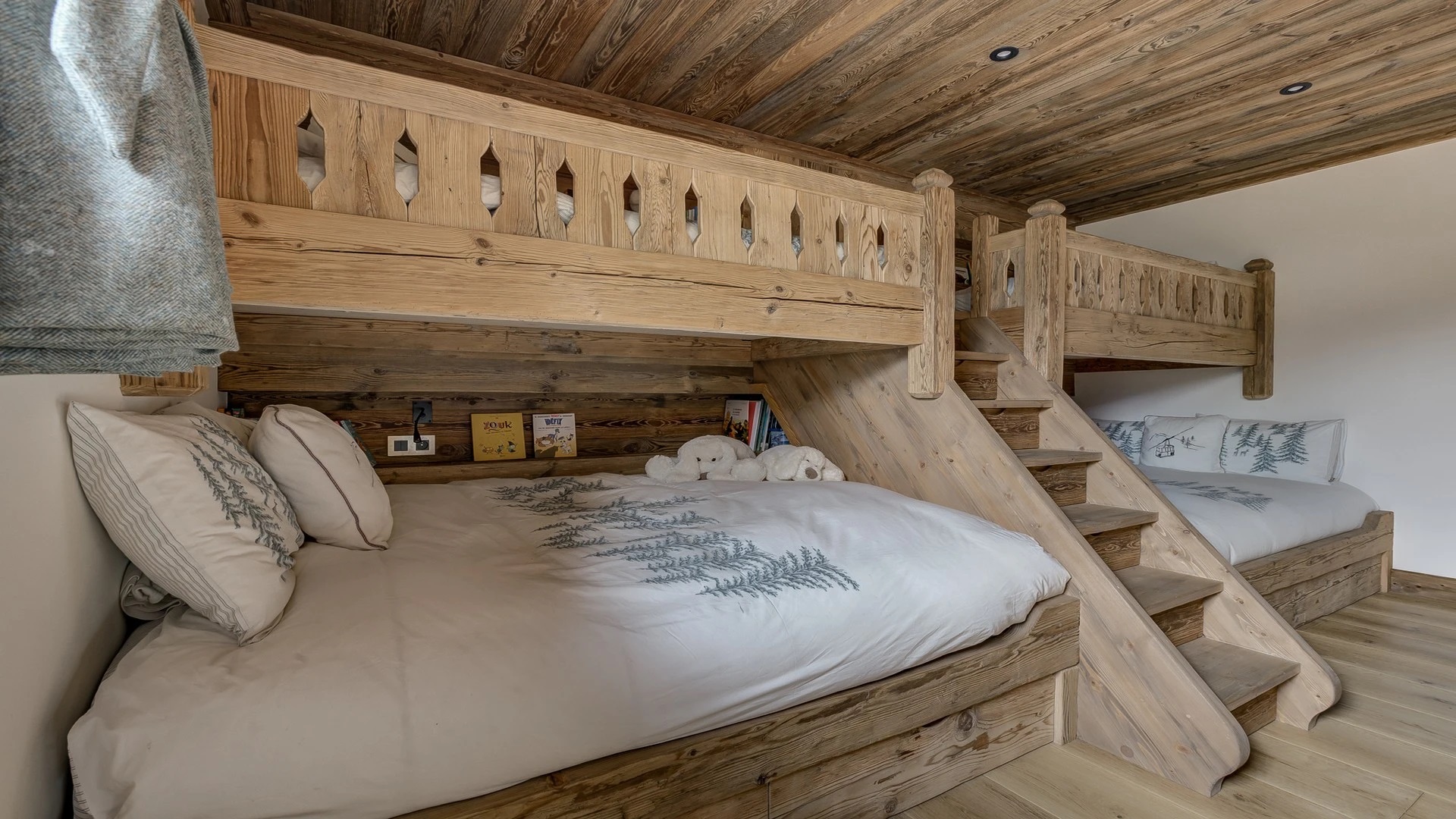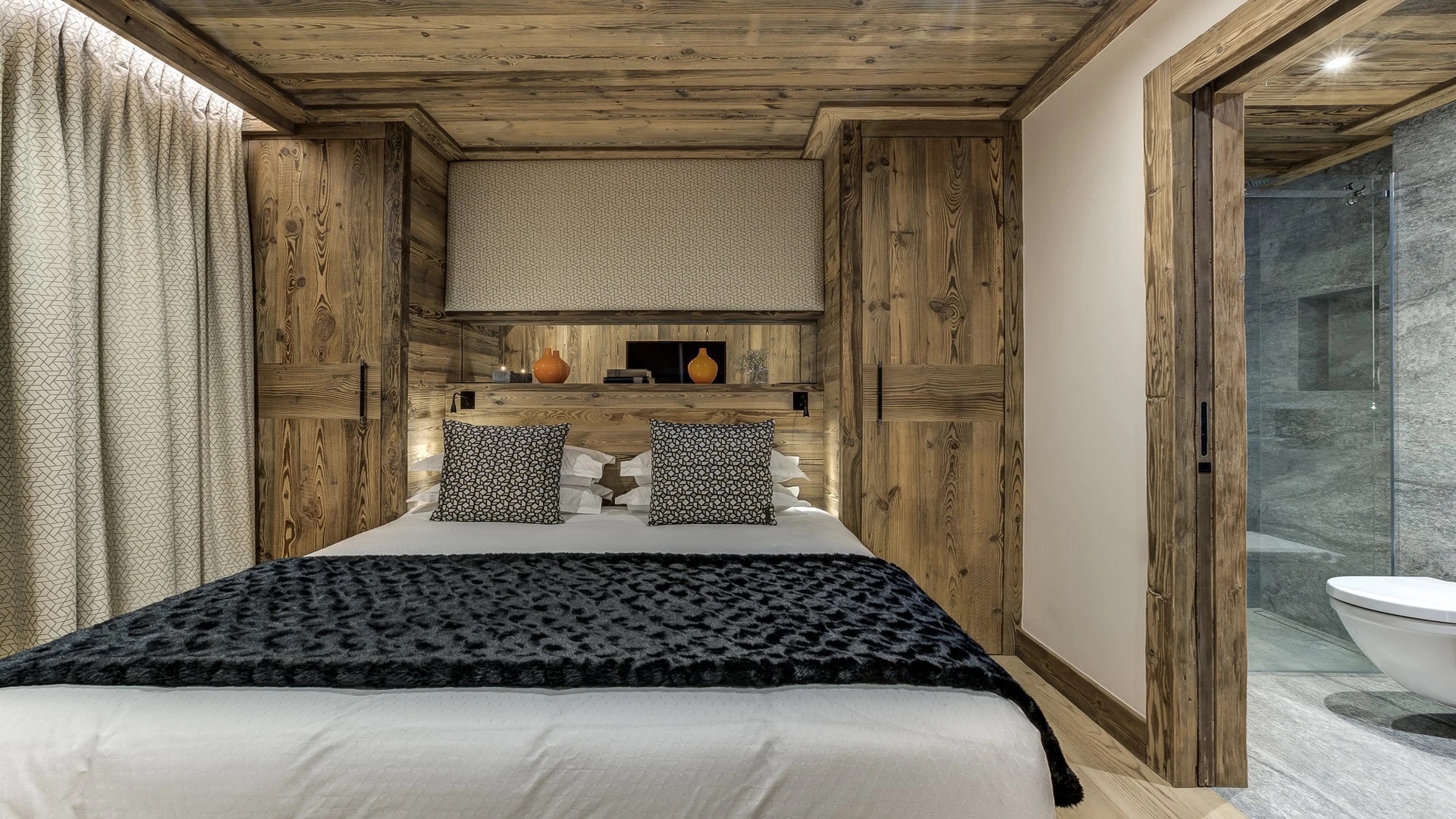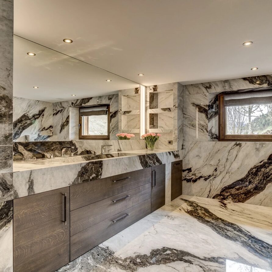 Sleeping quarters span both floors, offering a haven of tranquillity. The master Suite boasts a lavish marble en-suite bathroom, while four double bedrooms each feature en-suite facilities, exuding alpine charm with a modern twist. A children’s bunk bedroom accommodating up to six guests with its cozy ambiance and en-suite convenience.