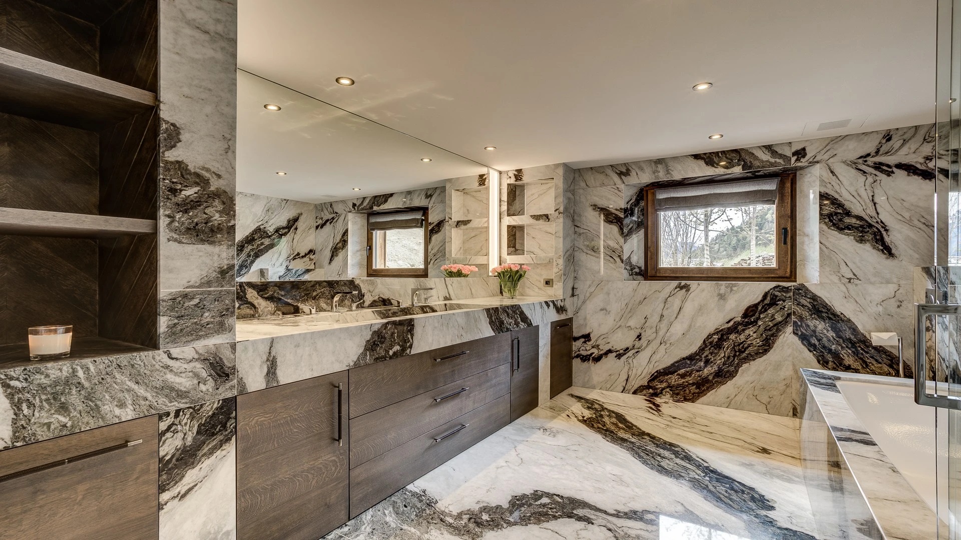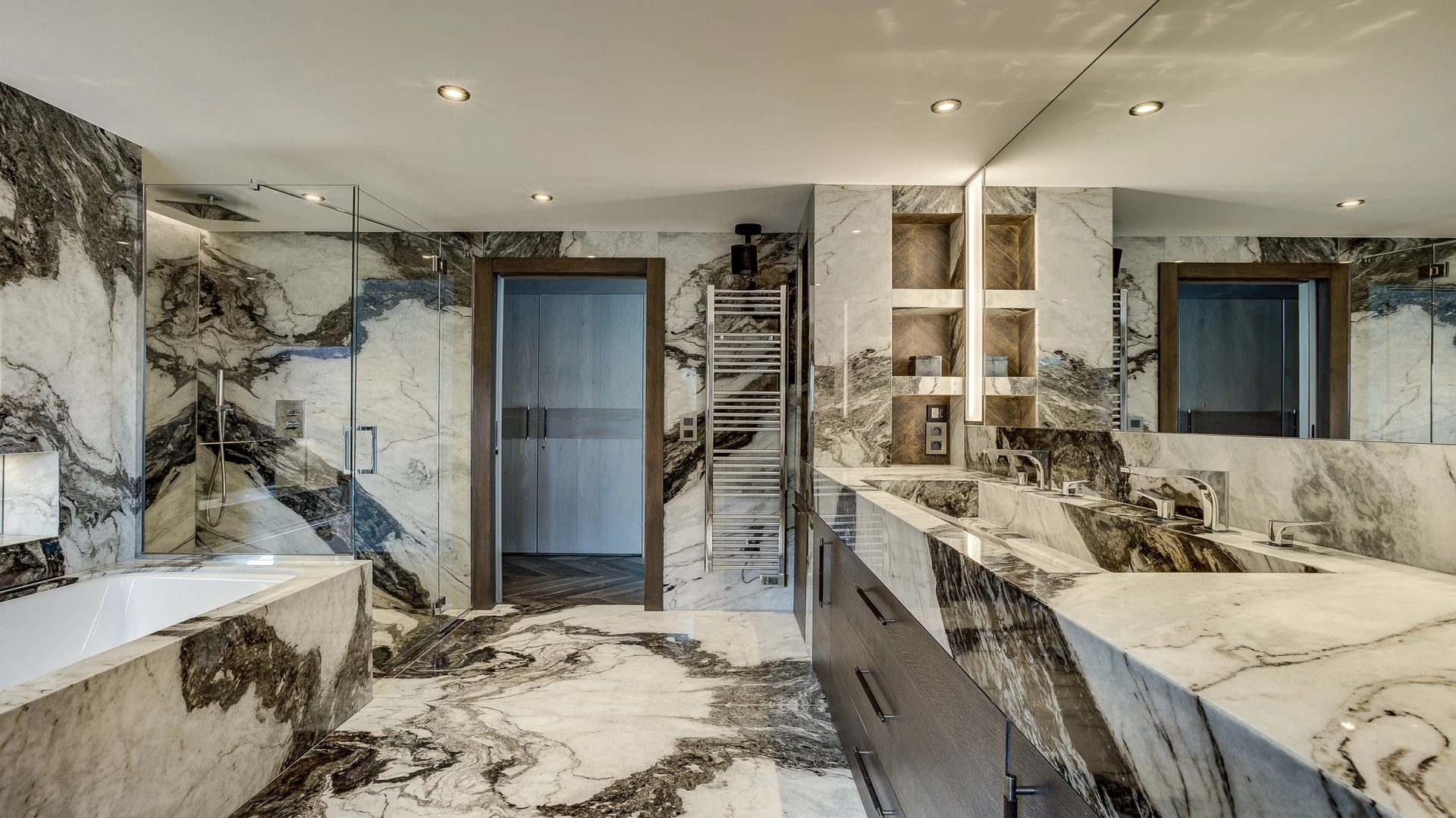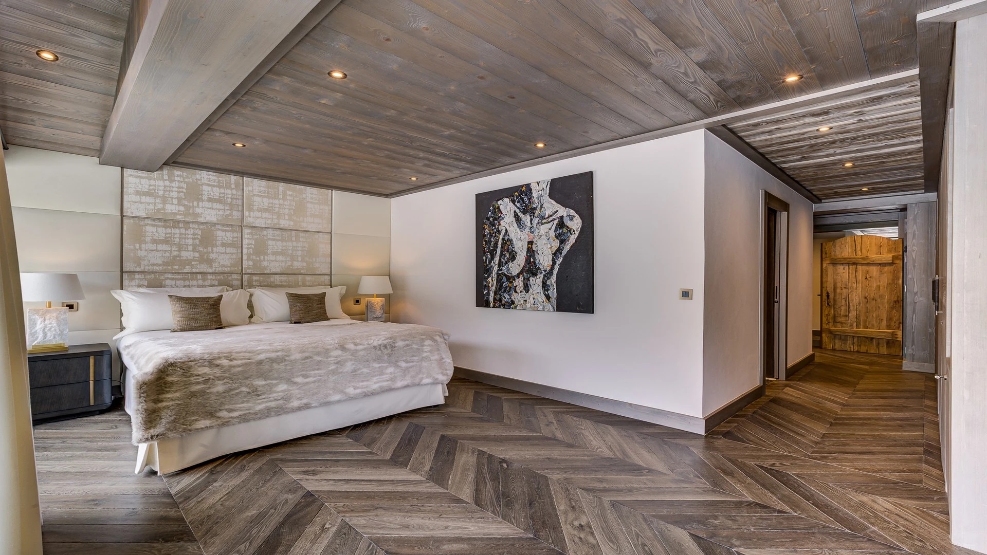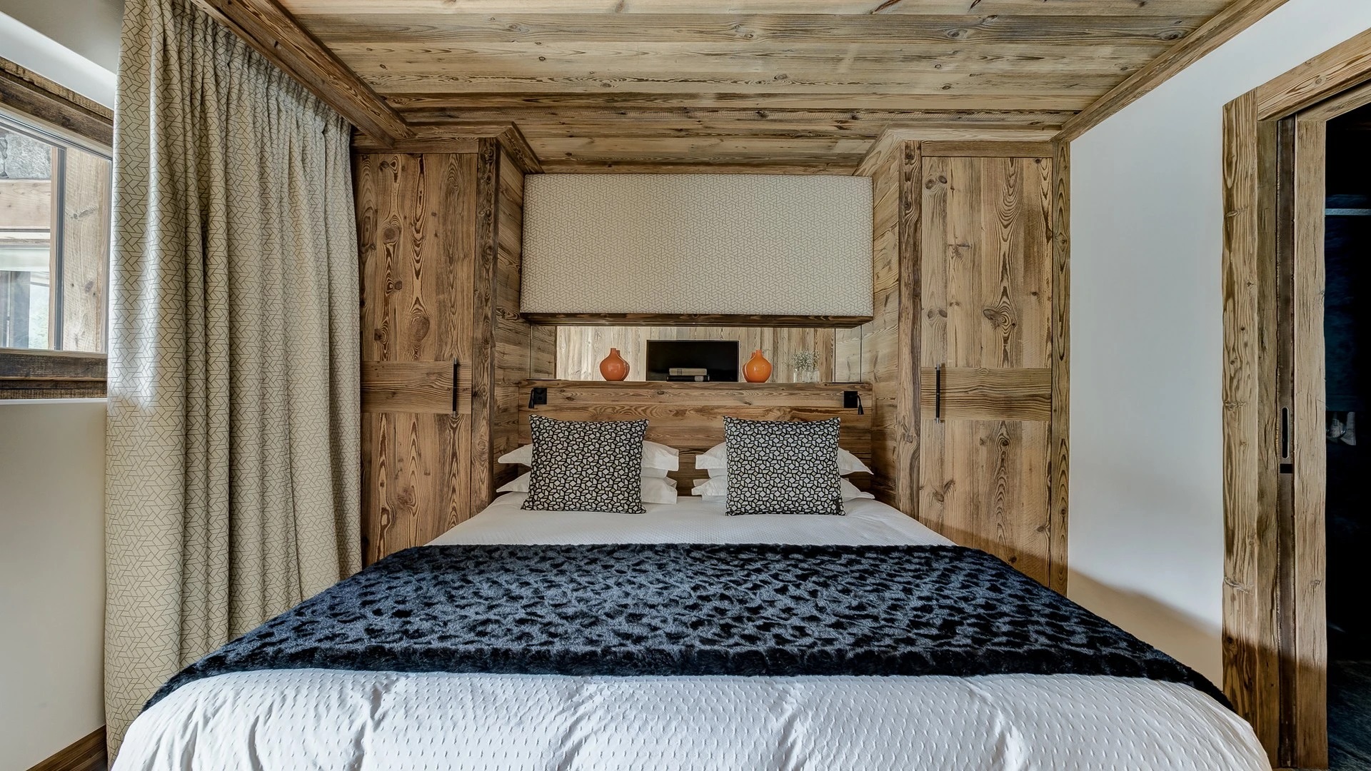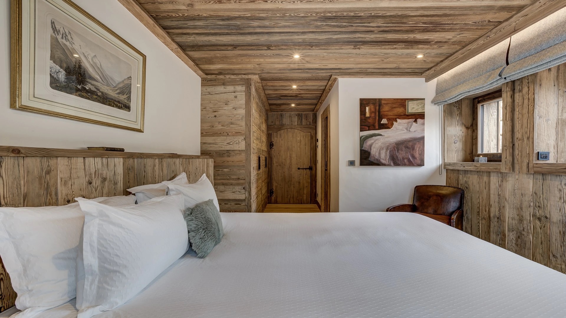 Sleeping quarters span both floors, offering a haven of tranquillity. The master Suite boasts a lavish marble en-suite bathroom, while four double bedrooms each feature en-suite facilities, exuding alpine charm with a modern twist. A children’s bunk bedroom accommodating up to six guests with its cozy ambiance and en-suite convenience.