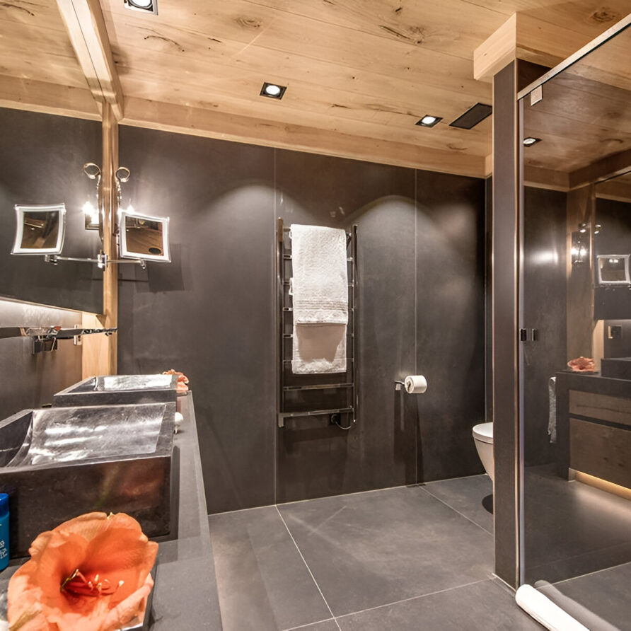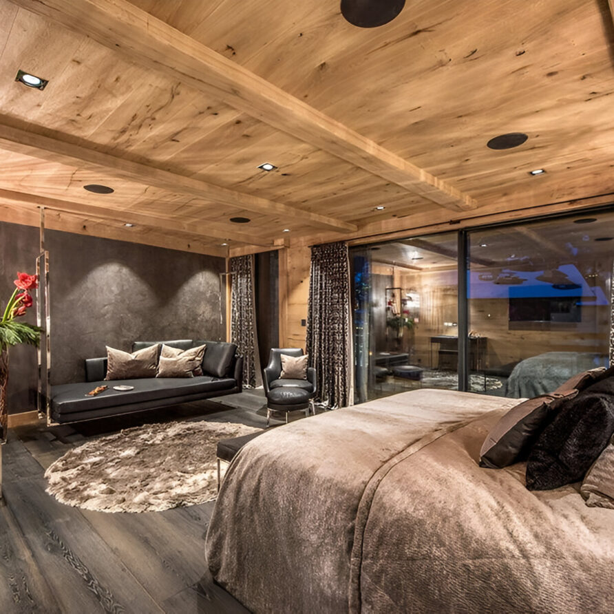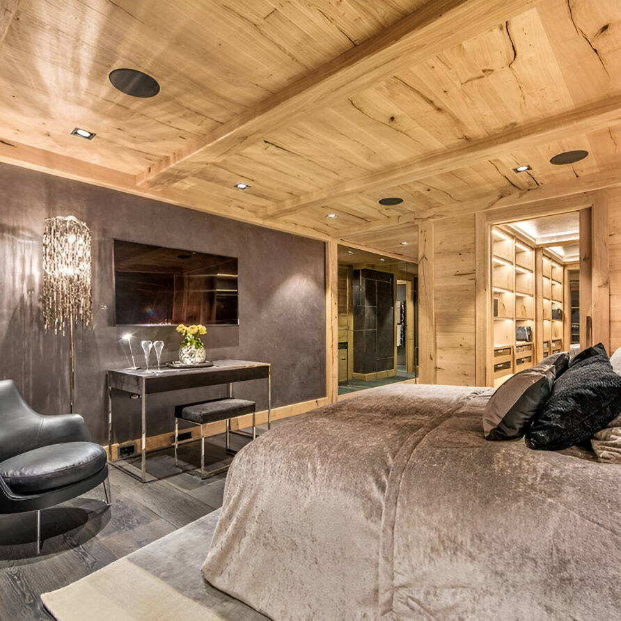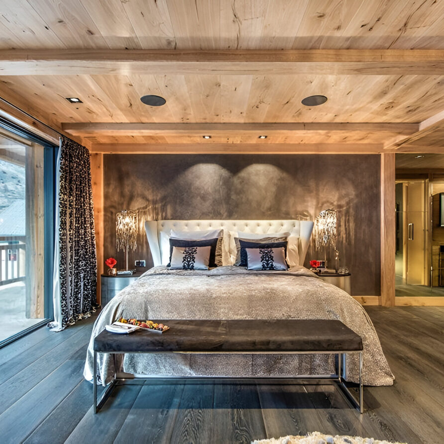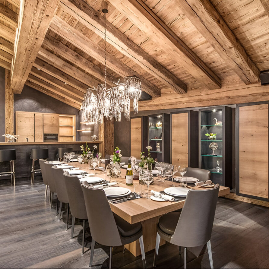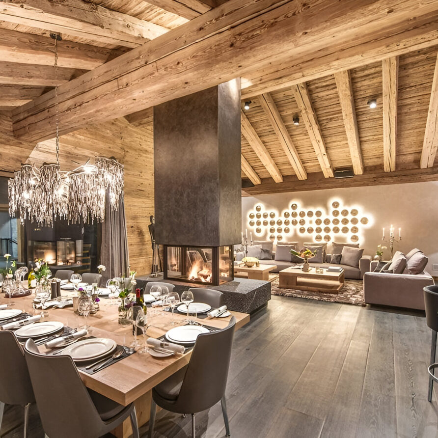 The chalet’s mix of reclaimed timbers and modern furnishings creates a refined yet warm feel. The top-floor main living area is set under a traditional sloped ceiling and features comfortable sitting and dining areas laid out around a sleek double-sided fireplace and picture windows that frame the mountain views. Though there is a fully equipped open kitchen in one corner of the room for your use, there’s also a separate professional kitchen for the staff.