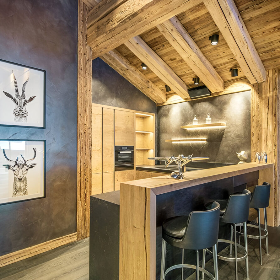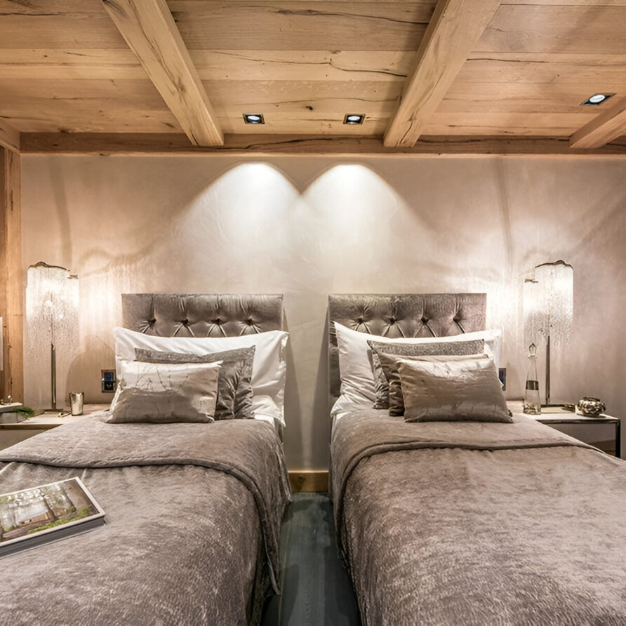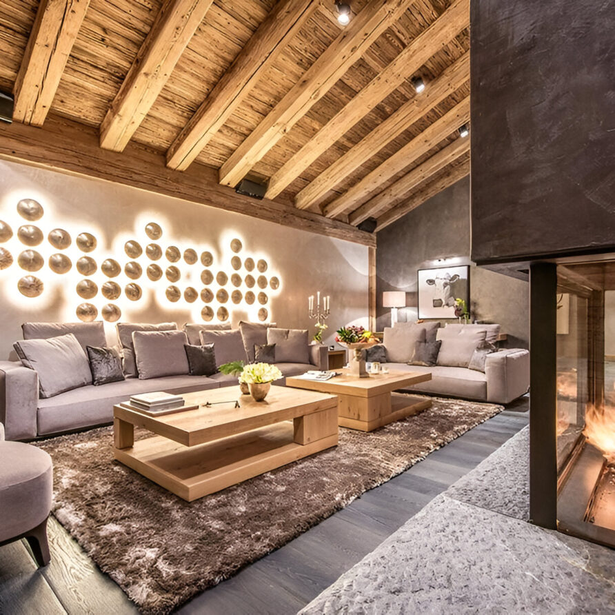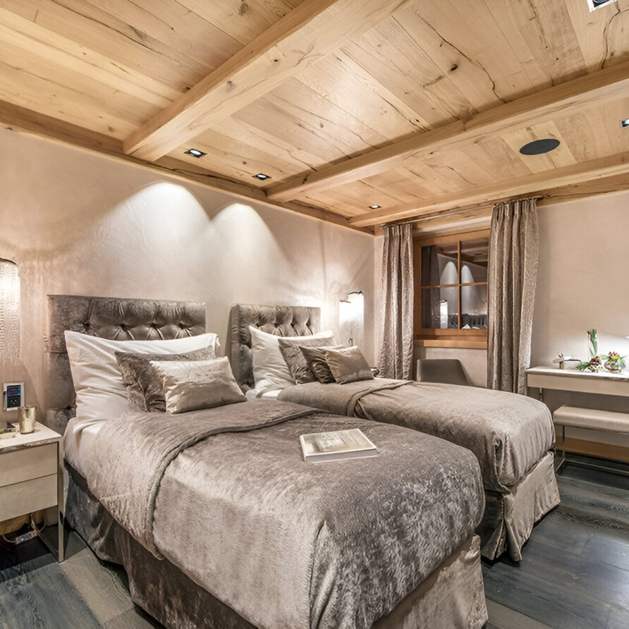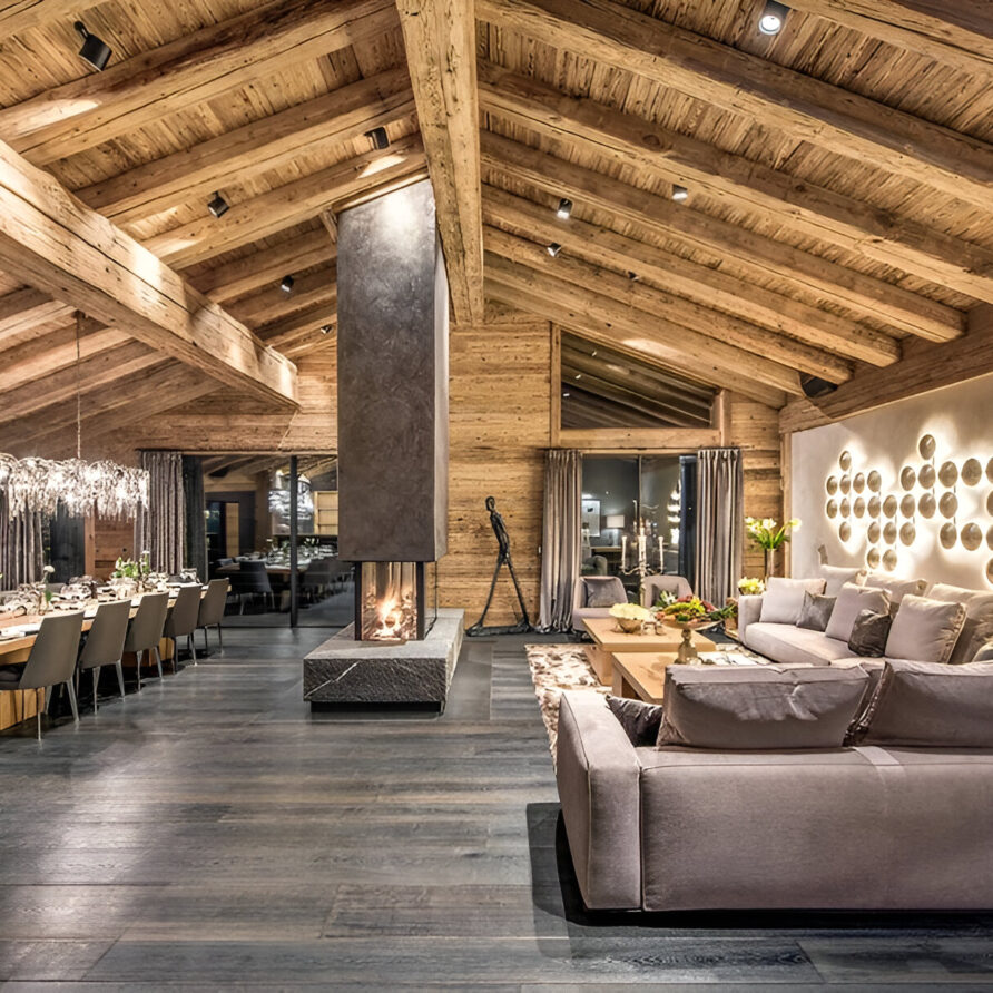 The chalet’s mix of reclaimed timbers and modern furnishings creates a refined yet warm feel. The top-floor main living area is set under a traditional sloped ceiling and features comfortable sitting and dining areas laid out around a sleek double-sided fireplace and picture windows that frame the mountain views. Though there is a fully equipped open kitchen in one corner of the room for your use, there’s also a separate professional kitchen for the staff.