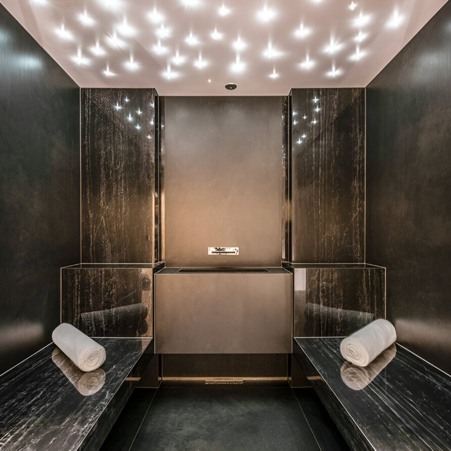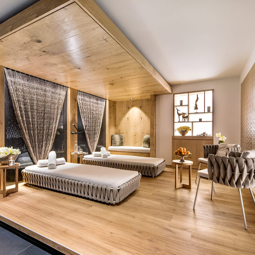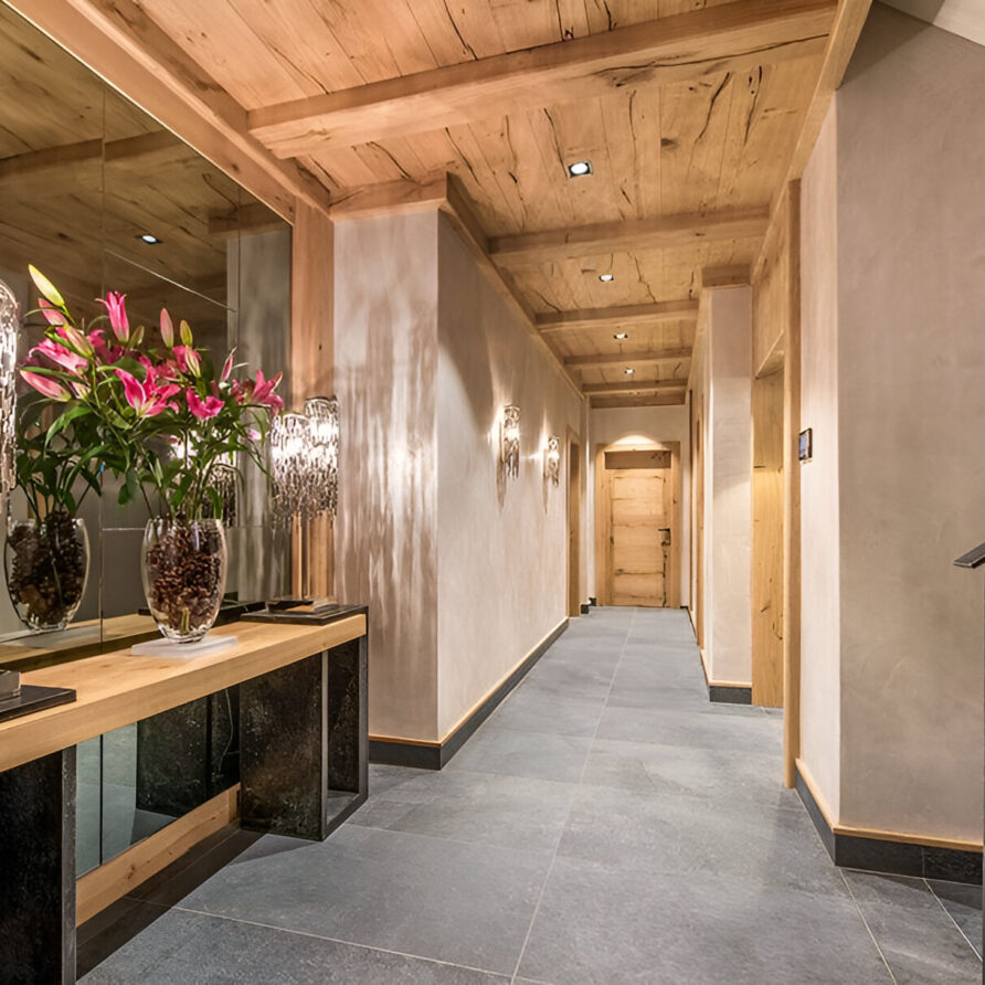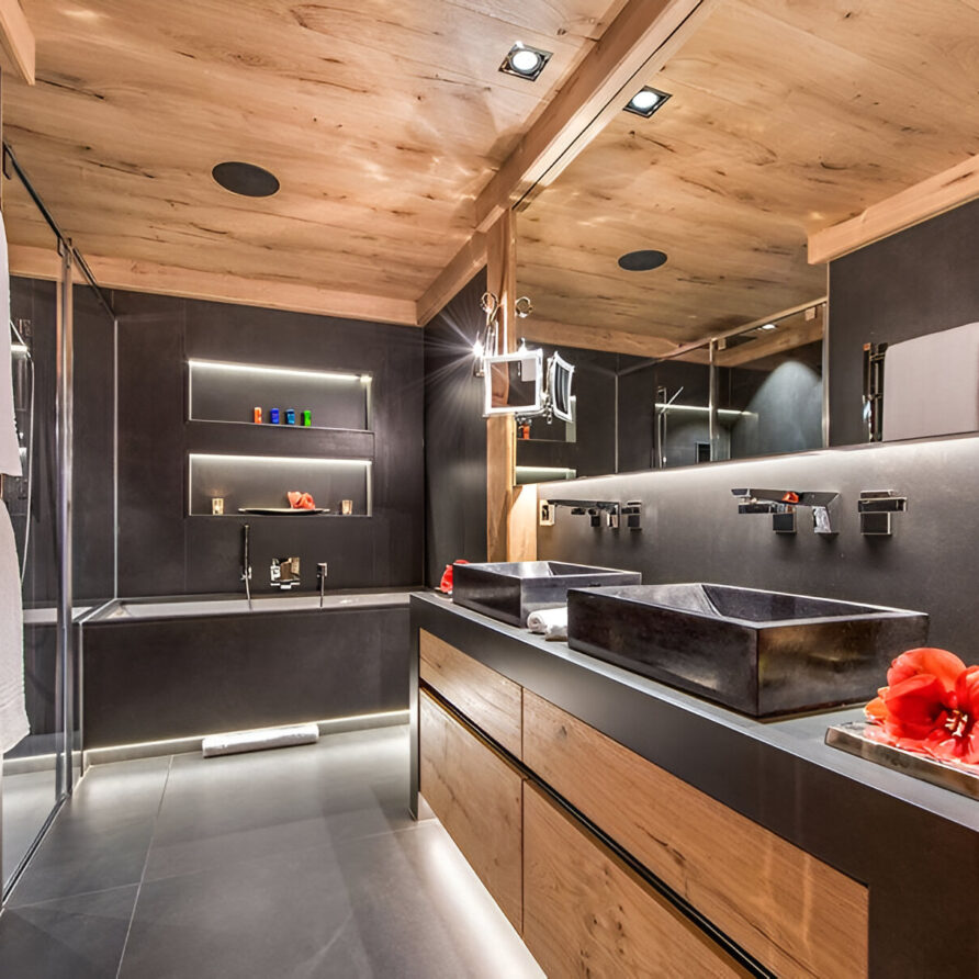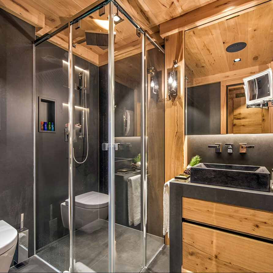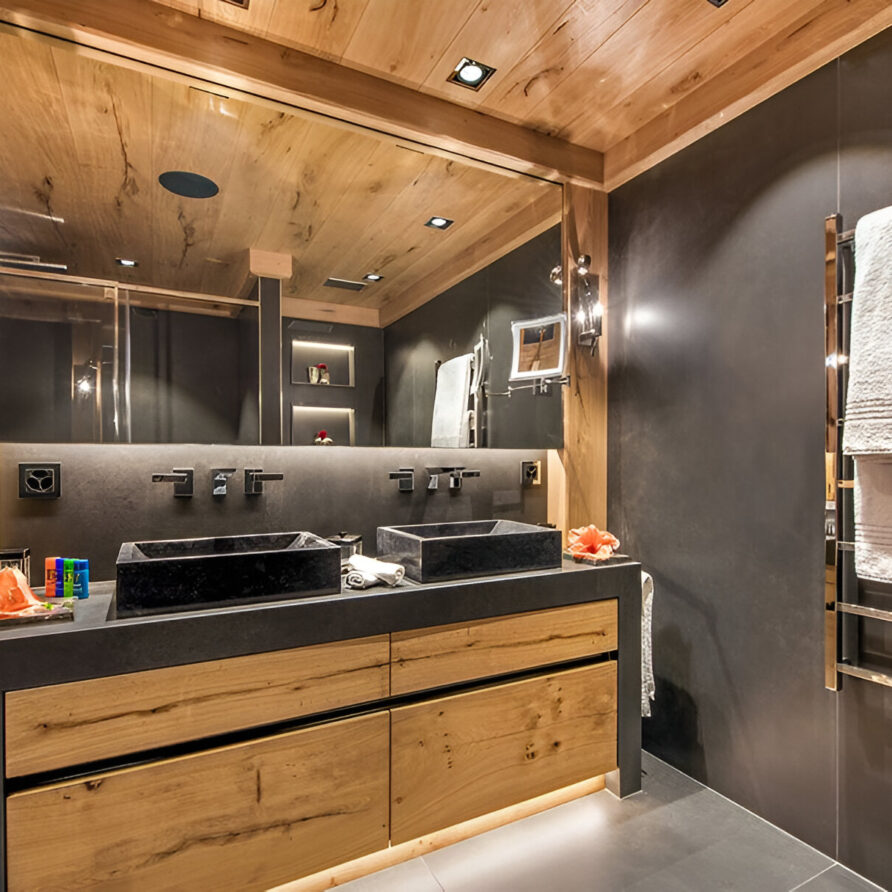 The chalet’s mix of reclaimed timbers and modern furnishings creates a refined yet warm feel. The top-floor main living area is set under a traditional sloped ceiling and features comfortable sitting and dining areas laid out around a sleek double-sided fireplace and picture windows that frame the mountain views. Though there is a fully equipped open kitchen in one corner of the room for your use, there’s also a separate professional kitchen for the staff.
